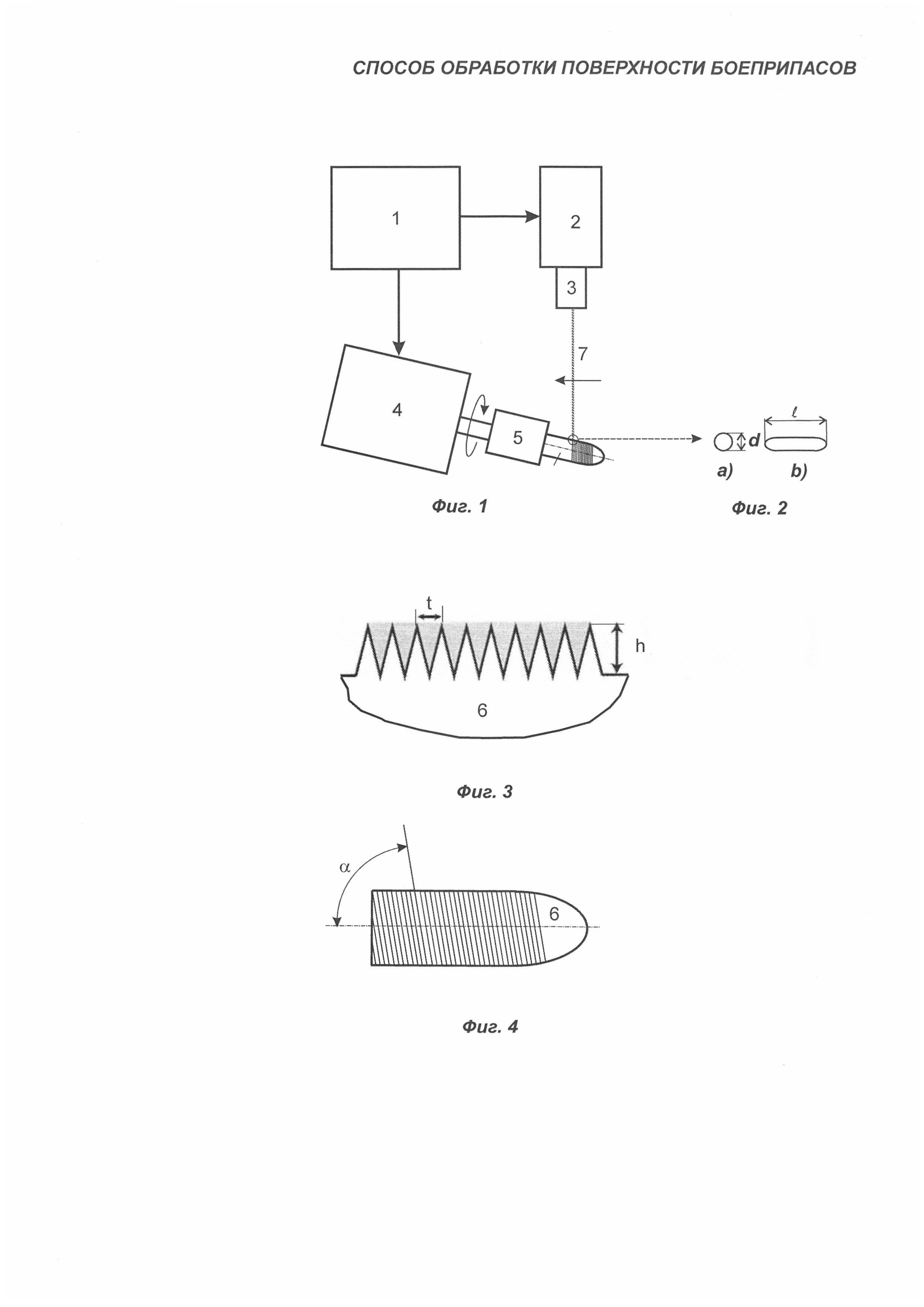 1. Способ обработки поверхности боеприпасов, включающий формирование осесимметричной поверхности боеприпаса и нанесение на нее антифрикционного материала, отличающийся тем, что на осесимметричной поверхности боеприпаса создают рельефную микроструктуру в виде ориентированных под углом α=15°-90° к оси боеприпаса борозд глубиной h до 50 мкм и с шагом t=20-70 мкм путем лазерной абляции, осуществляемой воздействием лазерного луча на поверхность боеприпаса при его вращении вокруг своей оси с одновременным движением сфокусированного лазерного луча по обрабатываемой поверхности вдоль оси боеприпаса. 2. Способ по п. 1, отличающийся тем, что лазерную абляцию осуществляют импульсным лазерным излучением с длиной волны λ=(532-1064) нм, длительностью импульса τи до 200 наносекунд, частотой следования импульсов fидо 200 кГц и импульсной мощностью излучения Pи=(1-50) Вт. 3. Способ по п. 1, отличающийся тем, что лазерный луч фокусируют с размером сфокусированного пятна на поверхности боеприпаса d=5-8 мм. 4. Способ по п. 1, отличающийся тем, что лазерный луч фокусируют на поверхности боеприпаса с помощью цилиндрической линзы в виде отрезка тонкой линии, направление которой совпадает с ориентацией борозд рельефной микроструктуры. 5. Способ по п. 1, отличающийся тем, борозды рельефной микроструктуры заполняют антифрикционным материалом.