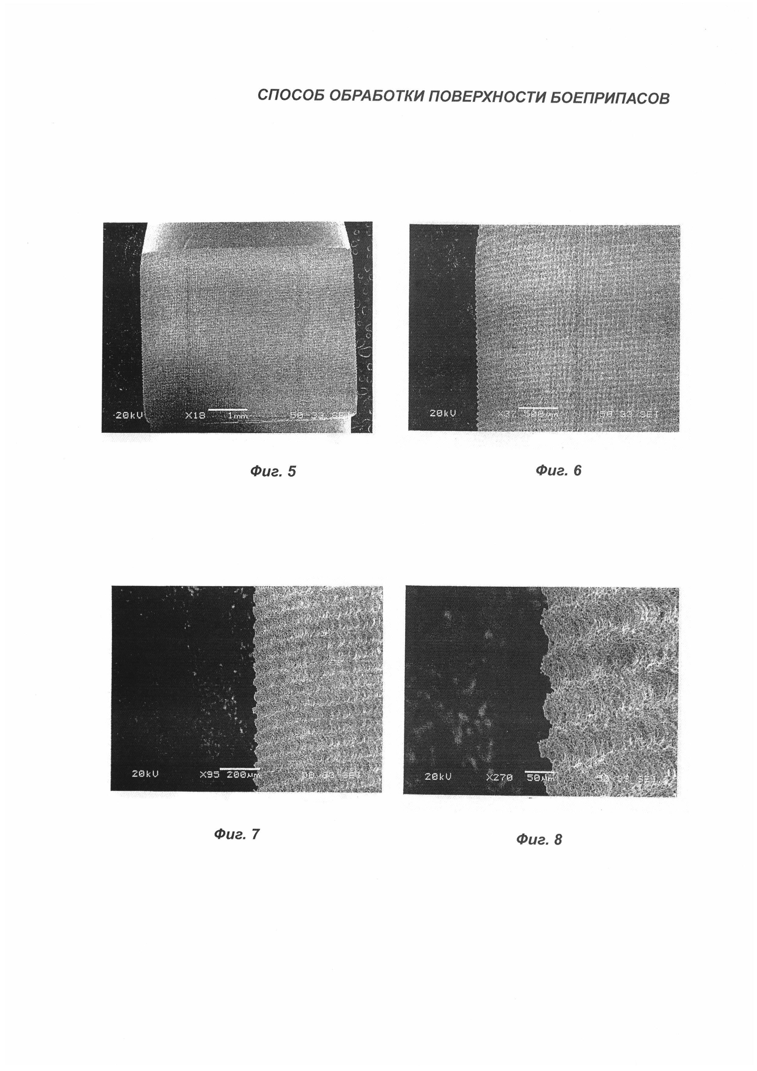 Изобретение относится к обработке поверхности боеприпасов. На осесимметричной поверхности боеприпаса путем лазерной абляции создают рельефную микроструктуру в виде ориентированных под углом α=15°-90° к оси боеприпаса борозд глубиной h до 50 мкм и с шагом t=20-70 мкм. Лазерным лучом воздействуют на поверхность боеприпаса при его вращении вокруг своей оси с одновременным движением сфокусированного лазерного луча по обрабатываемой поверхности вдоль оси боеприпаса с получением упомянутой рельефной микроструктуры, на которую наносят антифрикционный материал. Обеспечивается улучшение баллистических характеристик боеприпасов. 4 з.п. ф-лы, 8 ил., 1 табл.