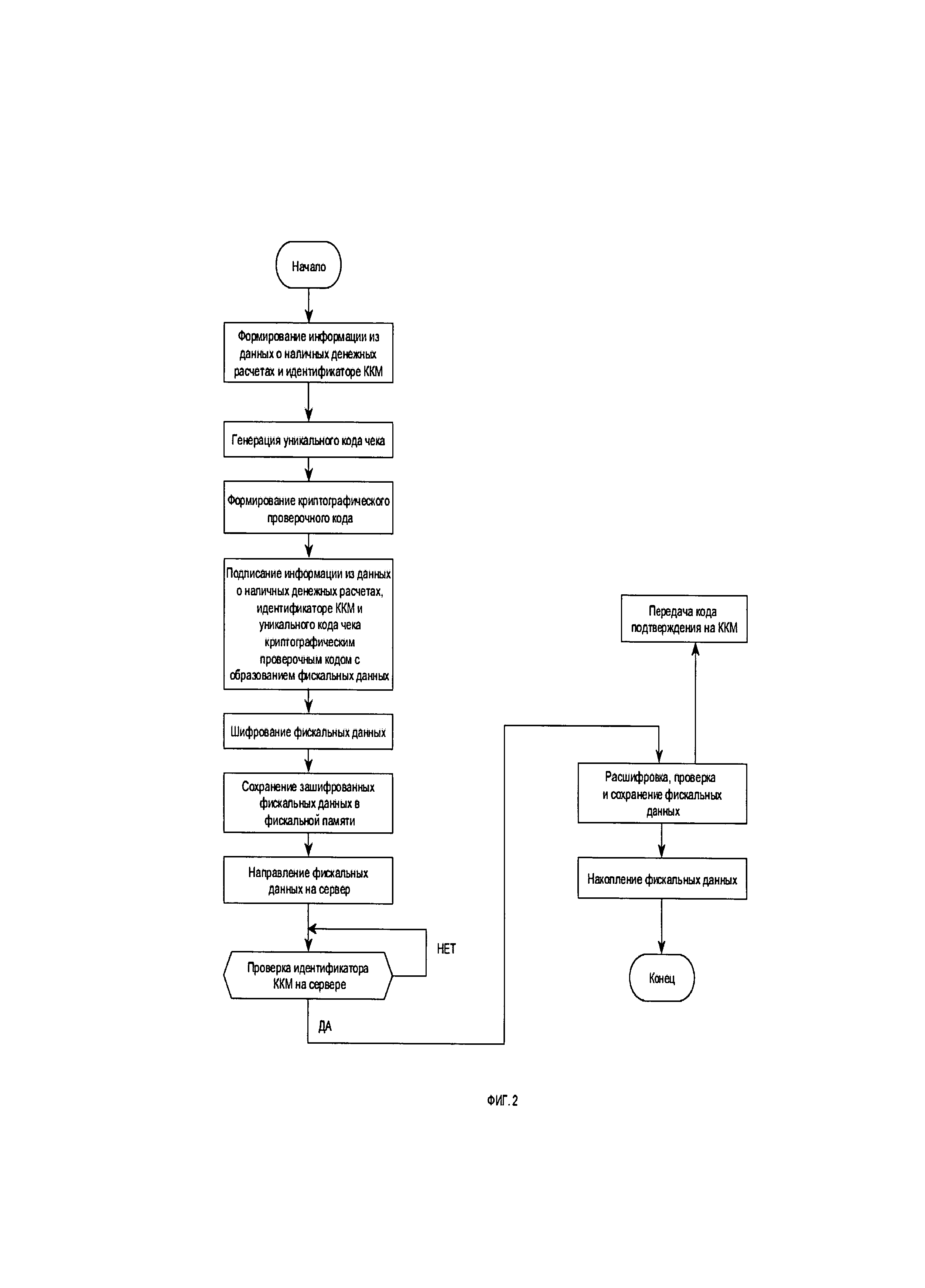 1. Способ обработки данных о наличных денежных расчетах и/или расчетах с использованием платежных карт при работе контрольно-кассовых машин с функциями фиксации и передачи информации и сервера оператора фискальных данных, включающий формирование информации из данных о наличных денежных расчетах и/или расчетах с использованием платежных карт и идентификаторе контрольно-кассовой машины на каждой контрольно-кассовой машине, генерация уникального кода каждого чека в каждой контрольно-кассовой машине, формирование криптографического проверочного кода, подписание информации из данных о наличных денежных расчетах и/или расчетах с использованием платежных карт, идентификаторе контрольно-кассовой машины и уникальном коде каждого чека криптографическим проверочным кодом с образованием фискальных данных, шифрование фискальных данных, сохранение зашифрованных фискальных данных для каждого чека в фискальной памяти, направление с каждой контрольно-кассовой машины на сервер оператора фискальных данных по каналам связи зашифрованных фискальных данных для каждого чека, проверку сервером для каждой контрольно-кассовой машины ее идентификатора с последующим разрешением или запретом доступа к серверу, при разрешении доступа к серверу расшифровка фискальных данных, проверку фискальных данных с помощью криптографического кода и их сохранение в базе данных сервера и одновременно передача кода подтверждения от сервера по каналам связи на каждую контрольно-кассовую машину, накопление фискальных данных по всем чекам и контрольно-кассовым машинам в базе данных сервера.