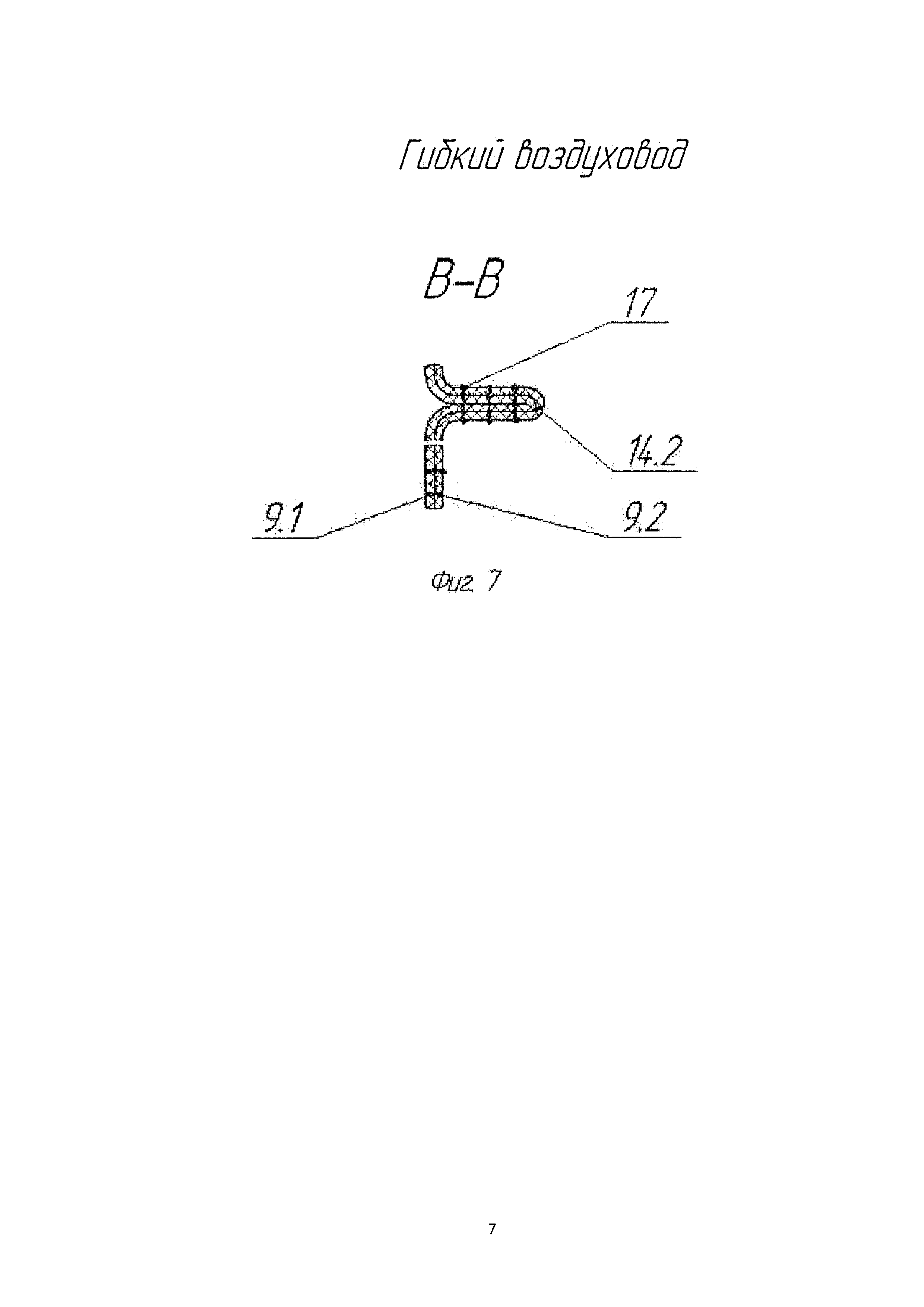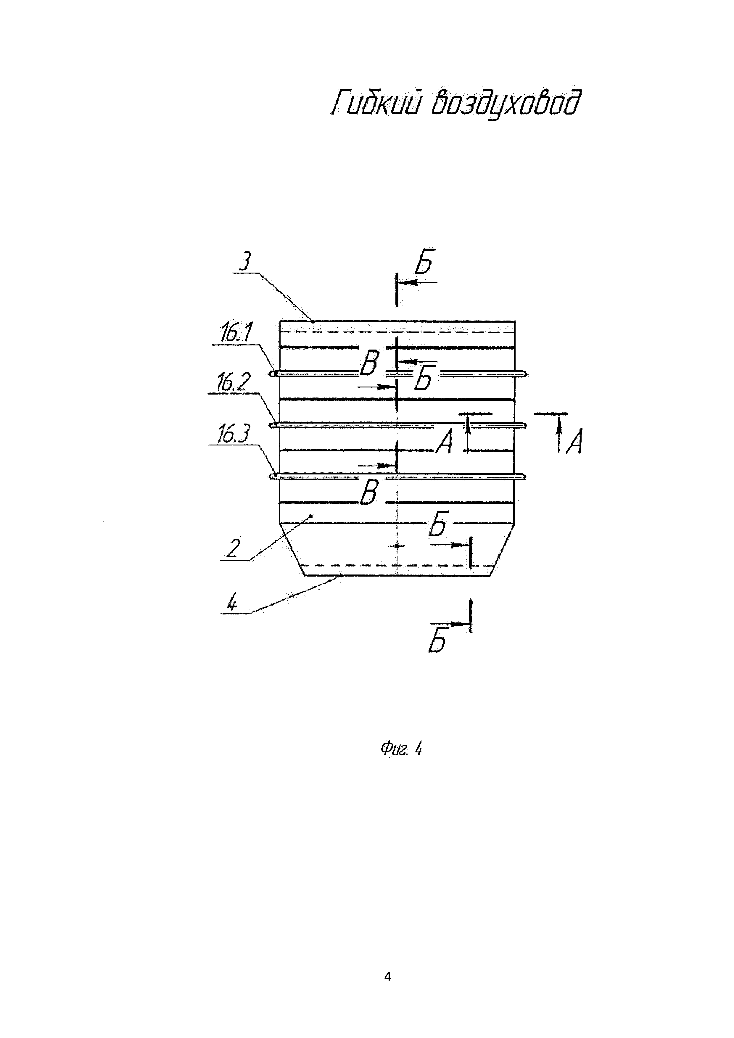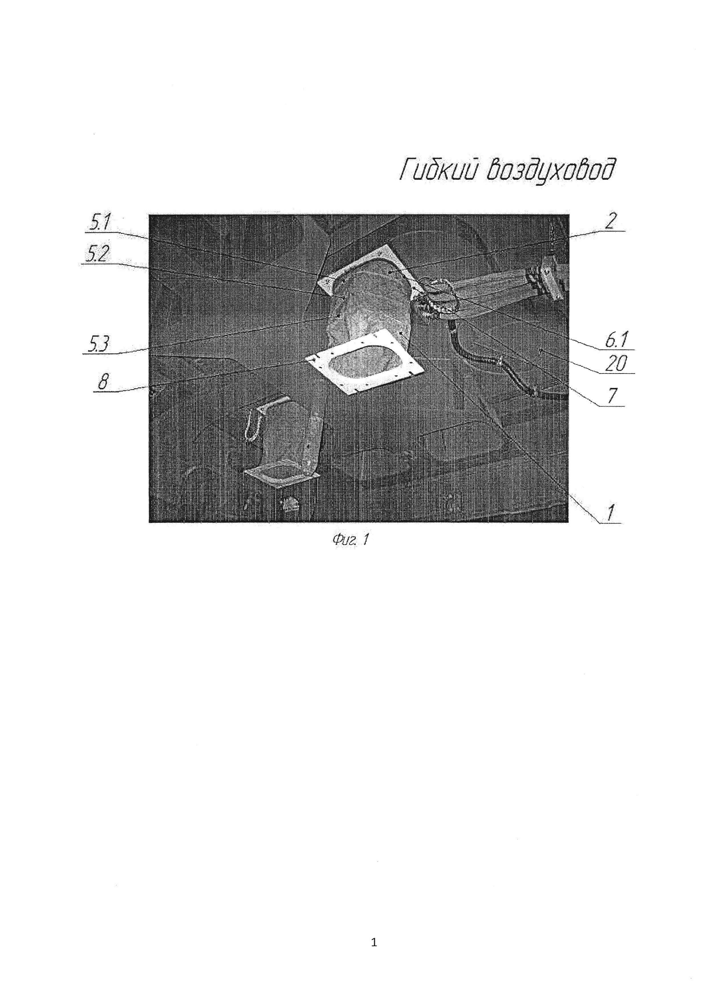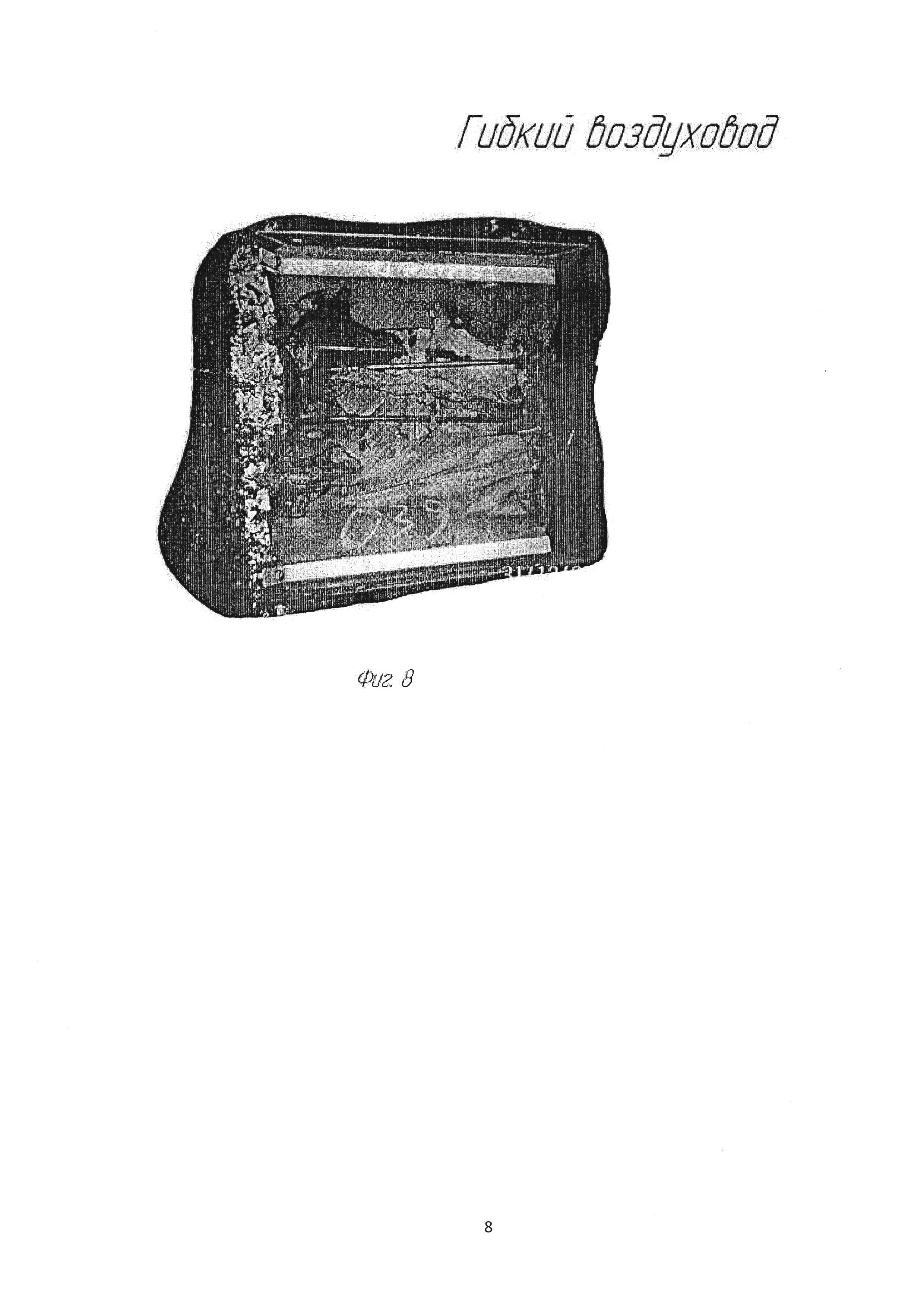 Изобретение относится к железнодорожному транспорту, а более конкретно к гибким воздуховодам системы охлаждения тяговых электродвигателей локомотивов для подачи воздуха между кузовом и тележками локомотива. Известен гибкий воздуховод для подвода охлаждающего воздуха к тяговому электродвигателю трамвайного вагона Т-3 (см. Трамвайные вагоны Т-3. Иванов М.Д., Пономарев А.А., Иеропольский Б.К. М.: "Транспорт", 1977. С. 20-21, и Иванов М.Д., Алпаткин А.П., Иеропольский Б.К. Устройство и эксплуатация трамвая. Учебное пособие для профессионально-технических училищ. Изд. 2-е, переработанное и дополненное. М.: "Высшая школа", 1977, с. 92-96). Известный гибкий воздуховод выполнен в виде мехов. Он имеет два фланца. Нижний фланец выполнен из металла, а верхний фланец - из текстолита. Нижний фланец предназначен для закрепления гибкого воздуховода к патрубку тягового электродвигателя. Верхний фланец выполнен плавающим с возможностью перемещения относительно днища кузова трамвайного вагона в кривых участках рельсового пути и при колебаниях, возникающих при движения трамвайного вагона. Верхний фланец номинально соосен с выходным отверстием вентиляционного канала принудительной подачи воздуха в кузове трамвайного вагона и прижат специальными пружинами к днищу кузова вагона с целью исключения раскрытия стыка между фланцем и днищем. Указанный гибкий воздуховод характеризуется относительно низким ресурсом. В конце XX века на замену изношенному парку трамвайных вагонов Т-3 чешского производства в России пришли трамвайные вагоны серии 71-401 (СПЕКТР-1) российского производства. Конструктивно трамвайный вагон 71-401 (СПЕКТР-1) является конструктивным потомком трамвайных вагонов Т-3 и Т-3М. Для повышения ресурса меха гибкого воздуховода выполнены из чепраковой кожи. Данные воздуховоды применяются также при ремонте и модернизации трамвайных вагонов Т-3 и Т-3М. Недостатком известного гибкого воздуховода является относительная конструктивная сложность, повышенная трудоемкость, повышенный износ как мехов, так и верхнего фланца, низкий ресурс конструкции, а также проблематичность применения такого типа воздуховодов для магистральных локомотивов из-за высоких динамических, инерционных и аэродинамических нагрузок. В случае применения гибкого воздуховода из чепраковой кожи к перечисленным недостаткам добавляется повышенная стоимость. Известен гибкий воздуховод для подвода охлаждающего воздуха к тяговому электродвигателю электровоза ВЛ19 (Раков В.А., Пономаренко П.К. Электровоз. Изд. 5-е, переработанное. М.: "Государственное транспортное железнодорожное издательство", 1956, с. 80-81). Известный гибкий воздуховод выполнен из брезента в виде гармоники. Отдельные элементы гармоники натянуты на распорные стальные кольца и выполнены из двух слоев брезентовой ткани. В месте соединения отдельных элементов брезентовая ткань имеет накладку из кожи и прошита сапожной дратвой. Крепление гармоники к патрубку тягового двигателя и каналу принудительной подачи воздуха кузова электровоза осуществляется стальными фланцами при помощи болтов. Недостатками известного гибкого воздуховода являются конструктивная сложность, низкая технологичность, высокая трудоемкость изготовления, низкий ресурс из-за перетирания брезентовой ткани распорными стальными кольцами. Наиболее близк