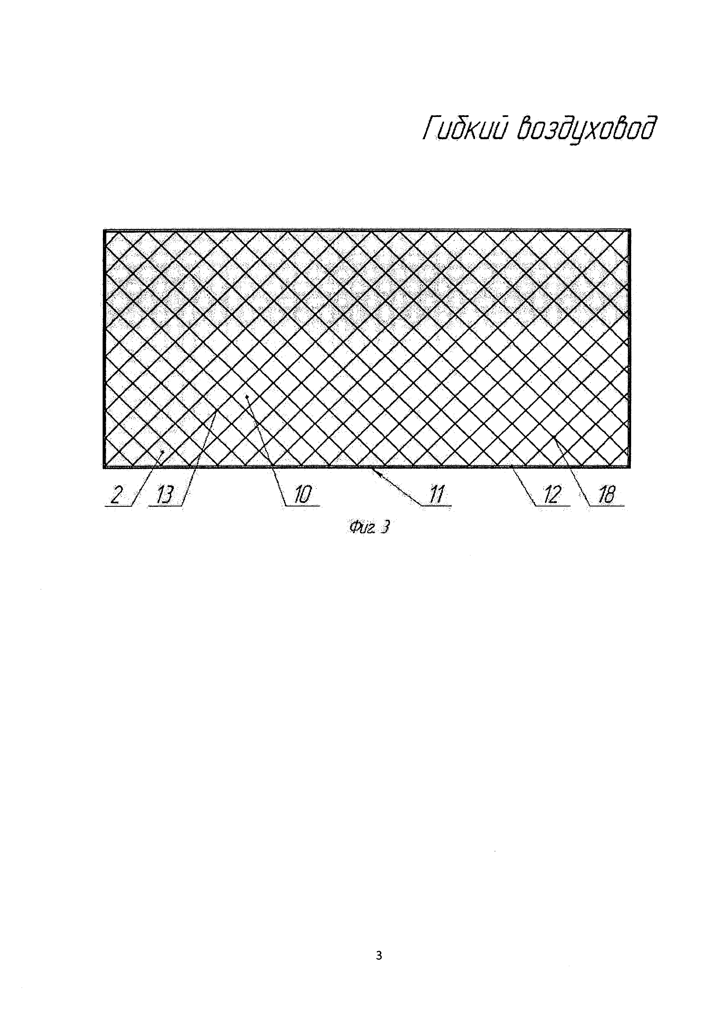 1. Гибкий воздуховод, содержащий сформированный с помощью швейных швов гибкий рукав с горловинами, элементы поперечной жесткости, придающие гибкому рукаву трубообразную форму, и закрепленные по горловинам гибкого рукава присоединительные фланцы, отличающийся тем, что гибкий рукав выполнен из двух слоев плотной водонепроницаемой и водоотталкивающей высокопрочной текстильной ткани, скрепленных между собой прошивкой по краю замкнутым соединительным накладным швейным швом и наложением по площади ткани сетки армирующих соединительных накладных швейных швов, путем формирования трубообразной конструкции наложением продольного соединительного "в замок" швейного шва, а по горловинам гибкого рукава - окантовочного швейного шва, а элементы поперечной жесткости выполнены непосредственно из обоих слоев ткани гибкого рукава путем складывания вдвое в виде кольцевых выступов, расположенных с внешней стороны гибкого рукава и прошитых по крайней мере не менее чем одной строчкой швейного шва типа накладного, при этом швейные швы выполнены высокопрочными швейными нитями. 2. Гибкий воздуховод по п. 1, отличающийся тем, что кольцевые выступы дополнительно усилены кольцевыми соединительными накладными швами. 3. Гибкий воздуховод по п. 1, отличающийся тем, что в качестве материала гибкого рукава использована брезентовая ткань, а швейные швы выполнены капроновыми нитями.