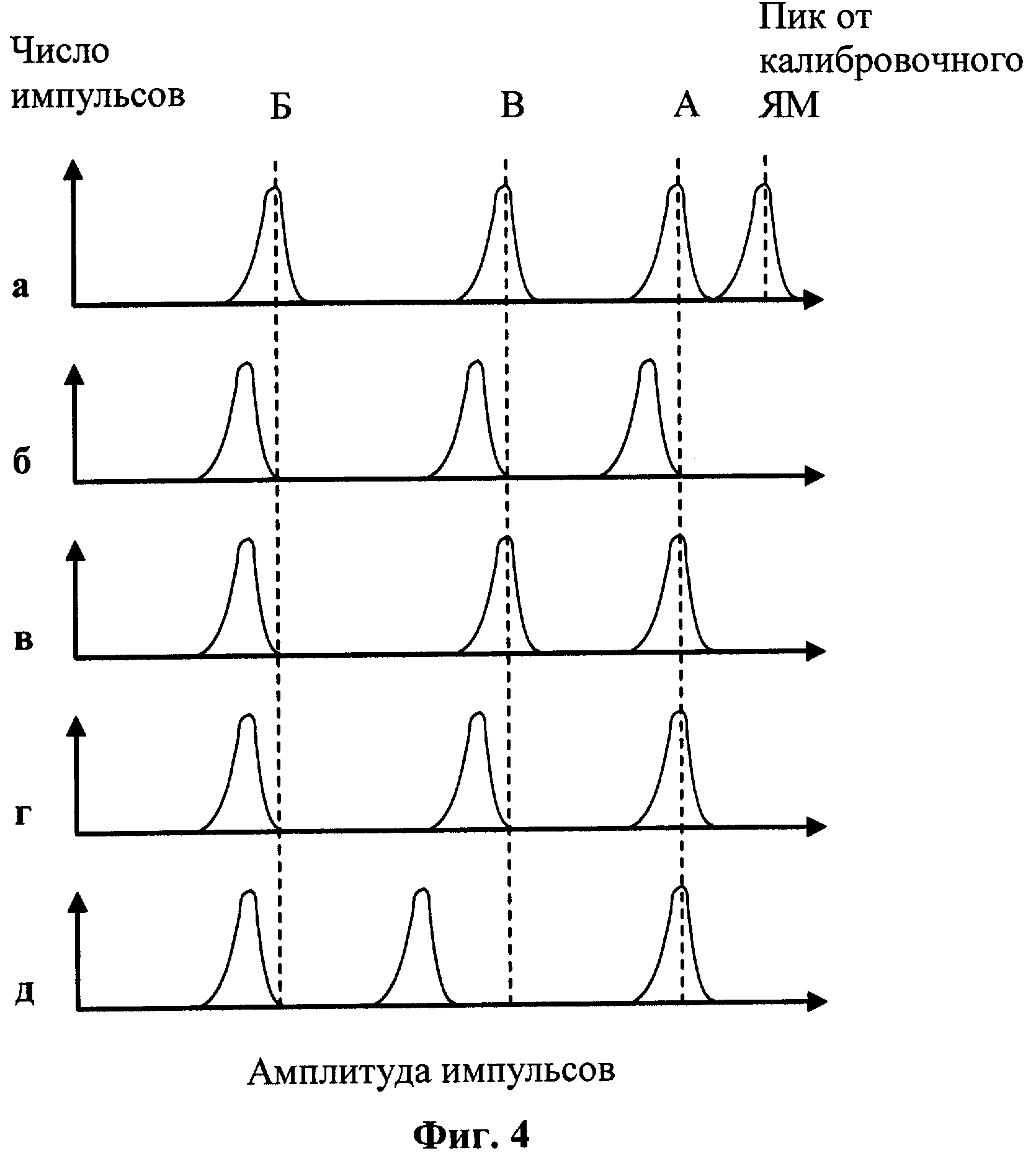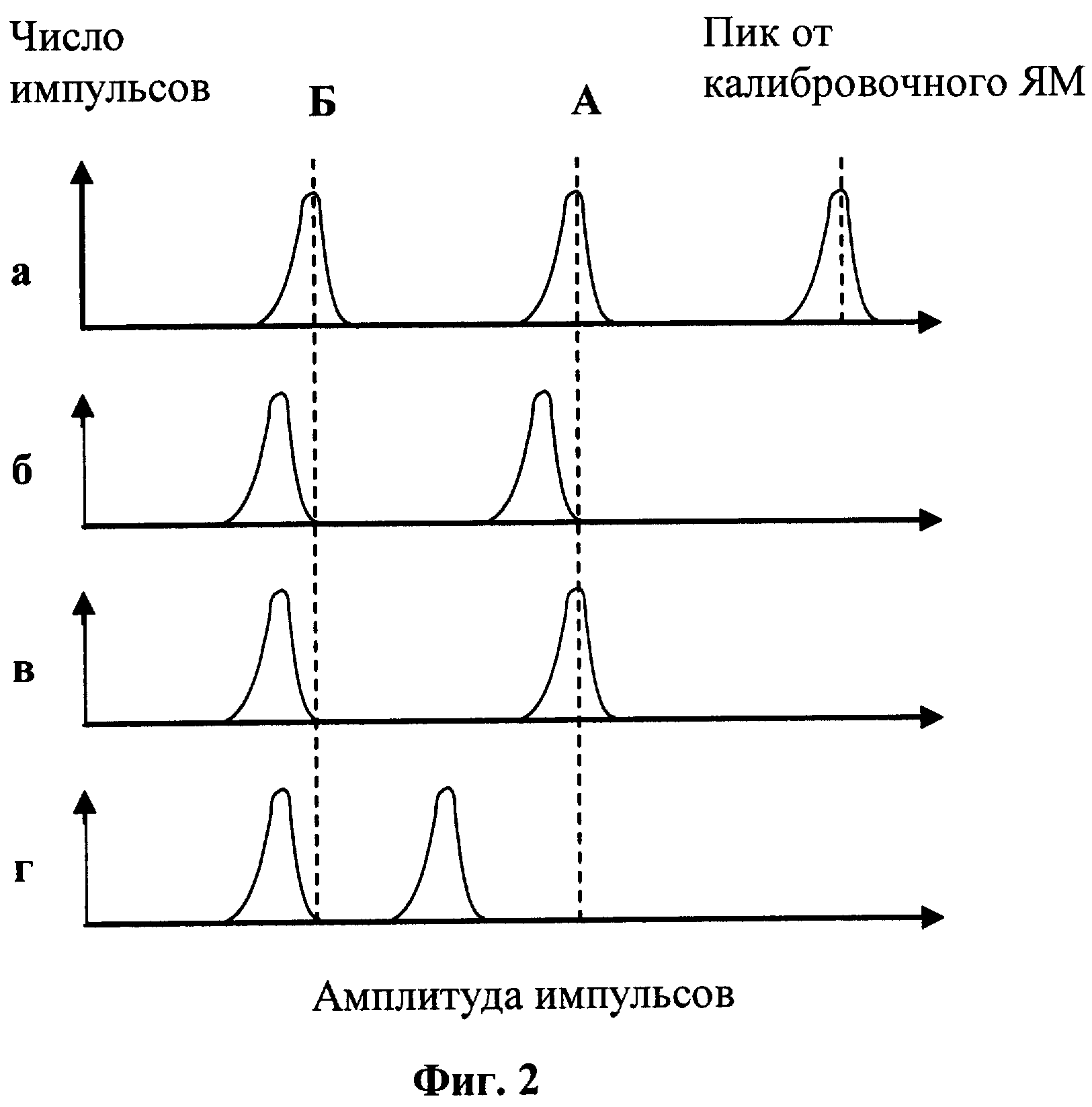 Изобретение относится к ядерной спектрометрии и предназначено для оперативной настройки тракта регистрации гамма-спектра ядерного материала. Сцинтилляционный тракт состоит из собственно сцинтиллятора, оптического детектора (например, фотоэлектронного умножителя (ФЭУ)), канала передачи электрических импульсов на анализатор (книга «Приборы для измерения ионизирующих излучений», авторы В.В.Матвеев, Б.И.Хазанов, М., 1972, стр.192-196). Необходимость проведения калибровки спектрометрического тракта вызвана уходом с течением времени или под воздействием окружающей среды параметров самого сцинтиллятора и ФЭУ, что приводит к изменению коэффициента усиления тракта и, как следствие, к снижению достоверности полученной информации. Как правило, калибровка спектрометрического тракта осуществляется с помощью эталонного калибровочного радиоактивного источника, который размещают на поверхности сцинтиллятора и в регистрируемом спектре находят пик, соответствующий данному эталонному источнику (книга «Приборы для измерения ионизирующих излучений», авторы В.В.Матвеев, Б.И.Хазанов, М., 1972, стр.30-33). По положению пика делают привязку регистрируемого спектра по энергии квантов. Однако в некоторых случаях использовать эталонный источник затруднительно, например при осуществлении контроля отработавшего ядерного топлива внутри защитной камеры. Кроме того, использование эталонного источника исключает оперативную калибровку в любой момент времени и не обеспечивает выделения вклада в нестабильность отдельных узлов тракта. Известен ряд устройств, в которых для стабилизации коэффициента усиления спектрометрического тракта используется реперный источник света. Сущность способа состоит в подаче импульсов света стабильной энергии на вход оптического детектора сцинтилляционного тракта и использовании информации об изменении амплитуды световых импульсов для оценки состояния оптического детектора (пат. РФ №1436663, МПК G01T 1/20, опубл. 1996). Недостаток способа заключается в том, что не учитывается вклад в нестабильность тракта самого сцинтиллятора, а также линии подвода светового излучения от сцинтиллятора к ФЭУ, если существует необходимость в ее применении. Задача настоящего изобретения состоит в создании способа, позволяющего осуществлять процесс калибровки в любой момент времени и определять вклад каждой составной части тракта регистрации в выявленную в процессе калибровки нестабильность. Поставленная задача решается следующим образом. В способе калибровки сцинтилляционного тракта с использованием последовательности эталонных световых импульсов, подводимой на вход детектора, согласно изобретению на сцинтиллятор тракта подают вторую последовательность эталонных световых импульсов, смещенную относительно первой по времени, и на выходе оптического детектора анализируют энергетический спектр первых и вторых импульсов по отношению к исходному спектру, полученному в процессе однократной исходной калибровки с использованием эталонного калибровочного радиоактивного источника. Эталонные световые импульсы могут обеспечить достоверную информацию об уходе параметров каждого из узлов тракта в отдельности за счет изменения своего положения в спектральной картине относительно исходного. При этом процесс калибровки может прои