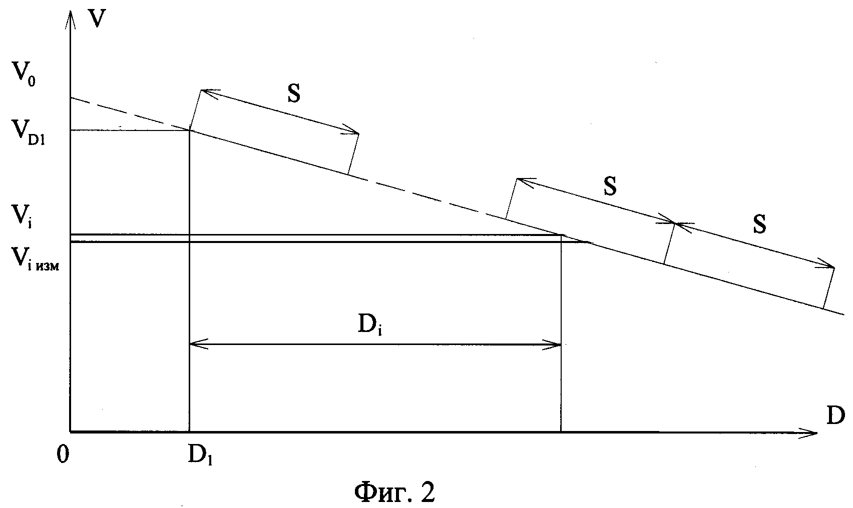 - формирователь данных для вычисления начальной скорости; 11 - измеритель суммарной длительности начальных реализаций; 12 - сумматор; 13 - вычислитель. На фиг.2 приведен график изменения скорости снаряда от дальности на начальном участке его траектории. Сущность измерения начальной скорости снарядов по предлагаемому способу