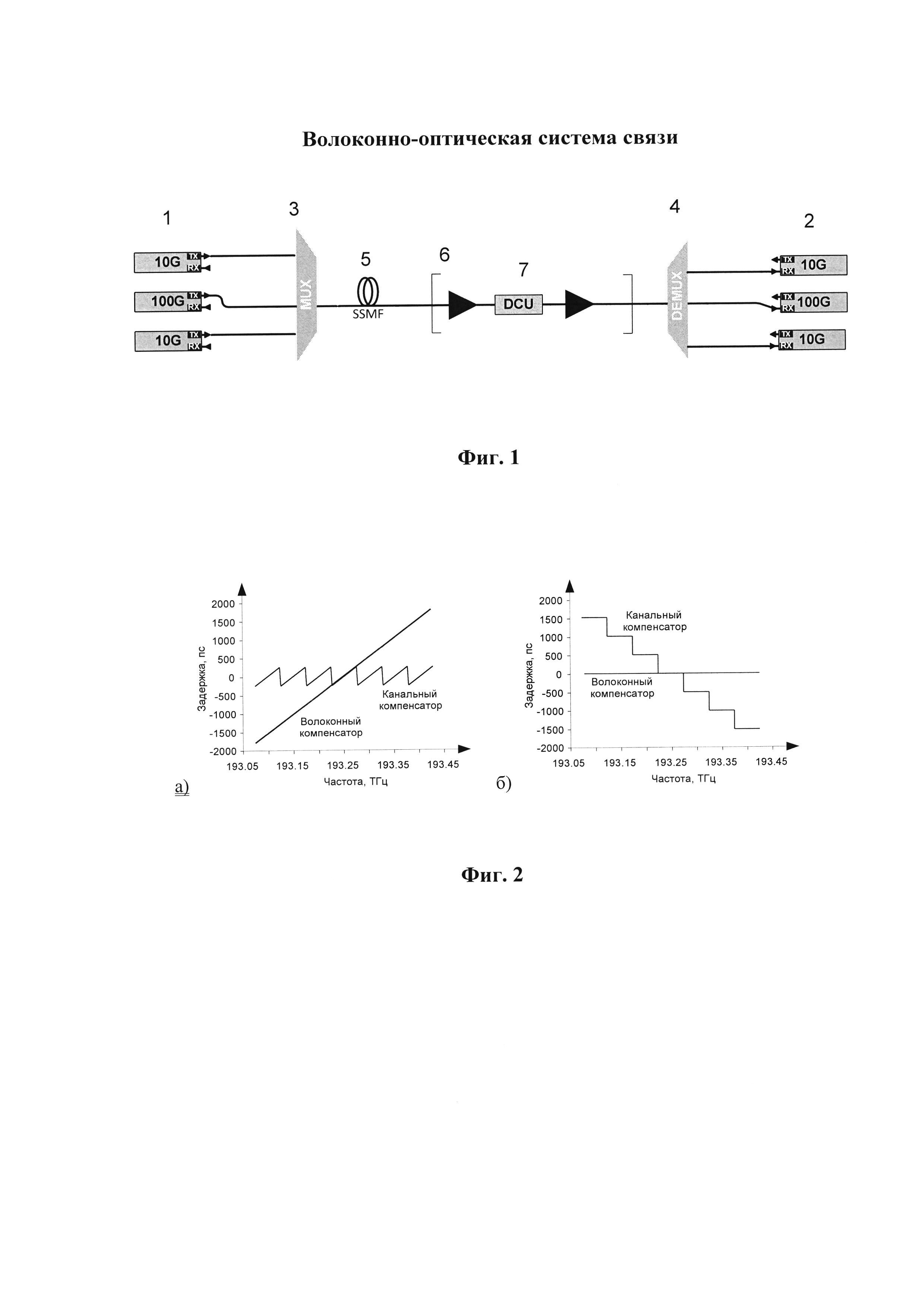 1. Волоконно-оптическая система связи, включающая оптически соединенные линией связи мультиплексор с N входами, предназначенный для спектрального мультиплексирования N спектральных каналов, образующих сетку DWDM частот в стандартизованном спектре ITU, и демультиплексор с N выходами, предназначенный для спектрального демультиплексирования N спектральных каналов, образующих идентичную мультиплексору сетку DWDM частот, и набор N согласованных пар когерентных и некогерентных оптических передатчиков и приемников с когерентным и прямым детектированием, выходы и входы которых соответственно оптически соединены с входами мультиплексора и выходами демультиплексора, причем линия связи содержит пролеты длиной от 40 до 200 км, между которыми установлены оптические усилители, содержащие не менее двух каскадов усиления, между каскадами усилителей установлены компенсаторы дисперсии (по одному на усилитель), отличающаяся тем, что компенсаторы дисперсии выполнены в виде компенсаторов канального типа. 2. Волоконно-оптическая система связи по п. 1, отличающаяся тем, что компенсаторы дисперсии выполнены на основе чирпированных брэгговских решеток. 3. Волоконно-оптическая система связи по п. 1, отличающаяся тем, что компенсаторы дисперсии выполнены на основе интерферометров. 4. Волоконно-оптическая система связи по п. 1, отличающаяся тем, что шаг сетки DWDM частот равен 50 ГГц. 5. Волоконно-оптическая система связи по п. 1, отличающаяся тем, что когерентные приемники и передатчики выполнены с возможностью кодирования и декодирования сигнала с использованием формата DP QPSK со скоростью передачи полезной информации 100 Гбит/с. 6. Волоконно-оптическая система связи по п. 1, отличающаяся тем, что некогерентные приемники и передатчики выполнены с возможностью кодирования и декодирования сигнала с использованием формата NRZ OOK со скоростью передачи полезной информации 10 Гбит/с. 7. Волоконно-оптическая система связи по п. 1, отличающаяся тем, что некогерентные приемники и передатчики выполнены с возможностью кодирования и декодирования сигнала с использованием формата NRZ OOK со скоростью передачи полезной информации 10 Гбит/с и 2,5 Гбит/с, причем спектральные каналы с когерентными приемниками и передатчиками расположены вплотную друг к другу, а рядом с ними расположены каналы NRZ OOK со скоростью передачи полезной информации 10 Гбит/с.