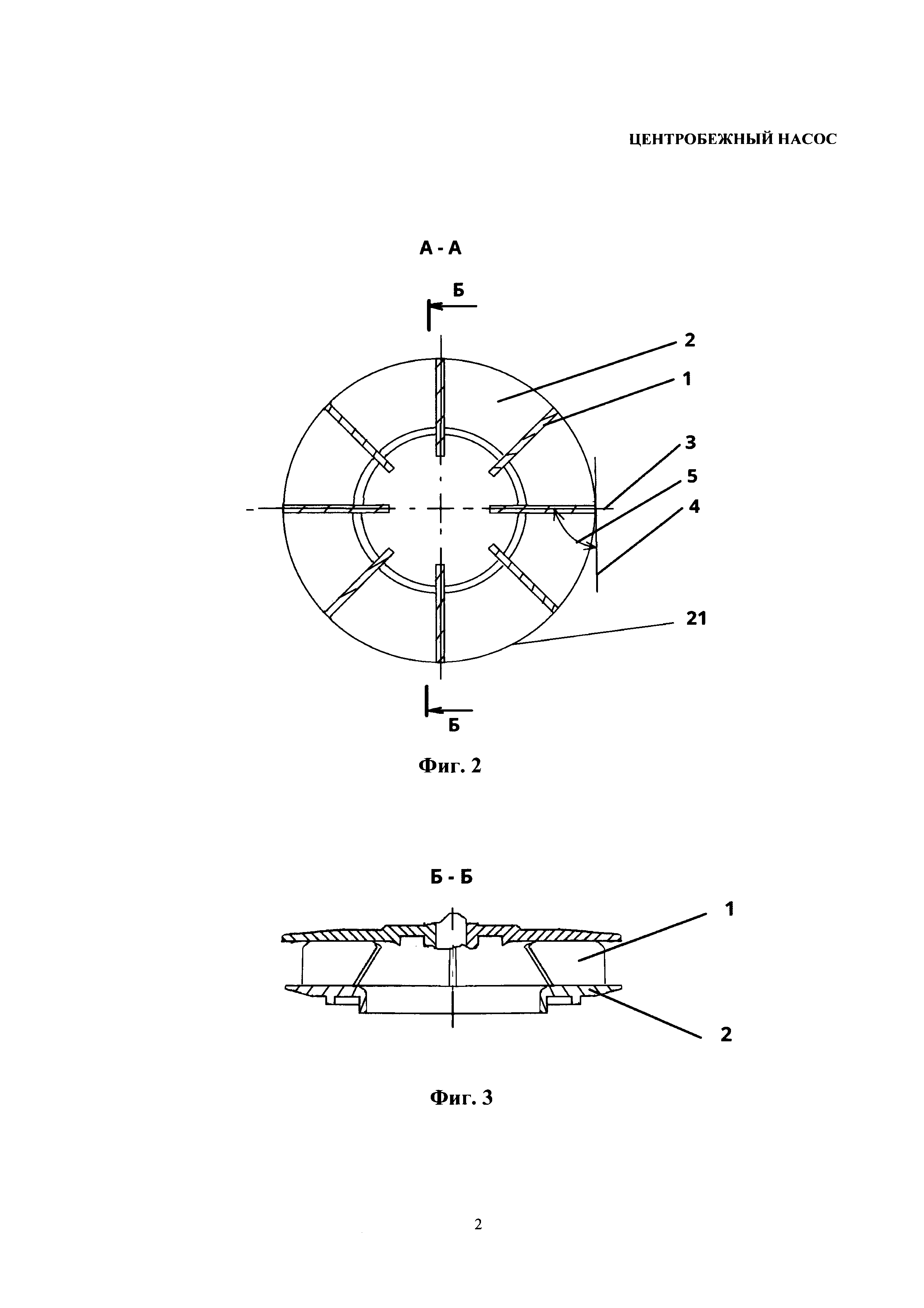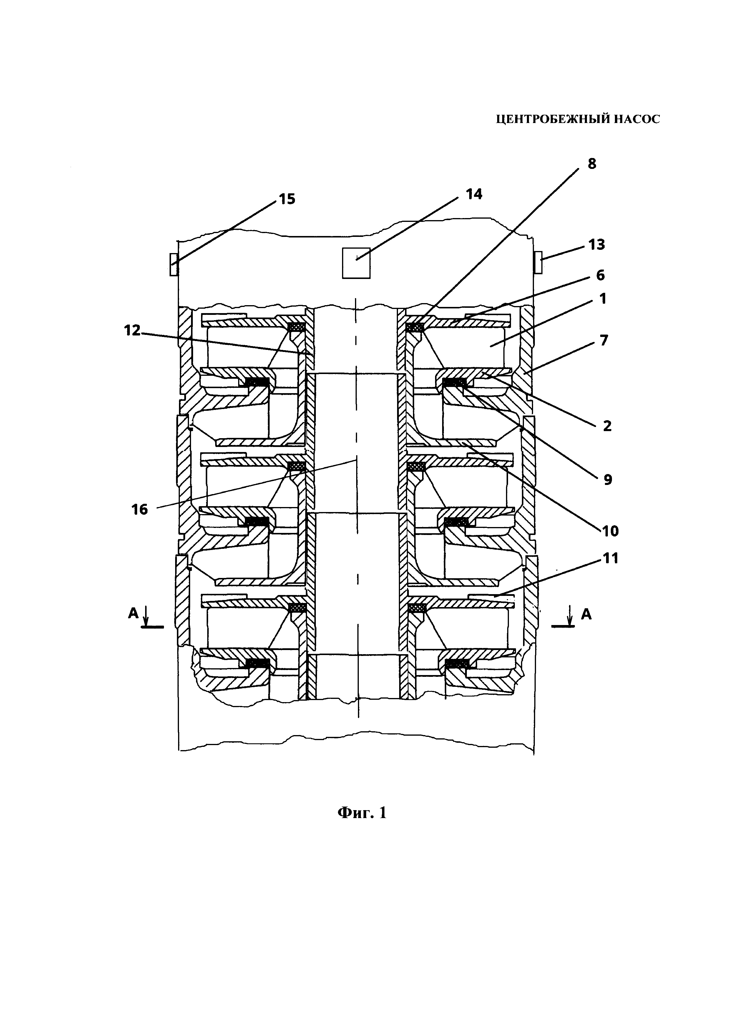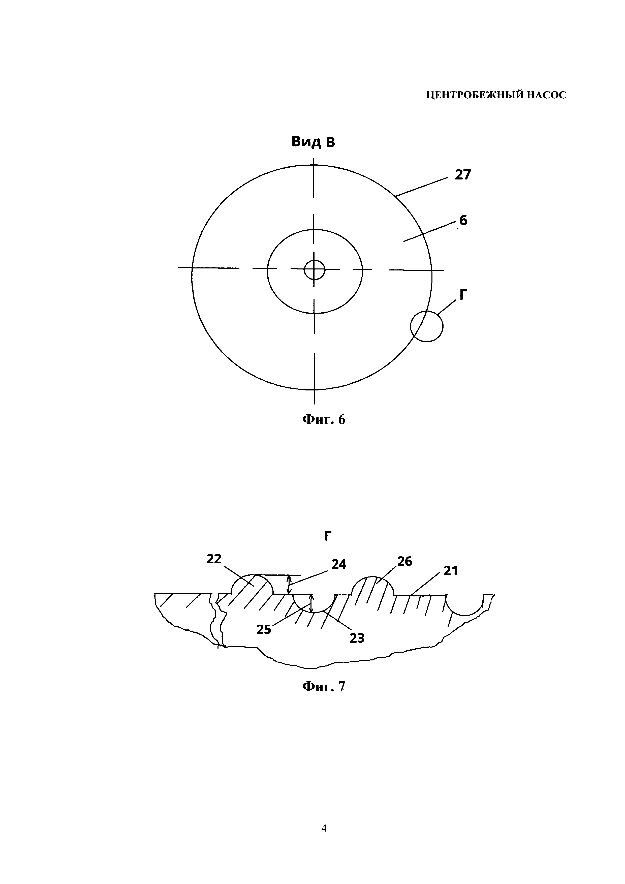Изобретение относится к машиностроению и может быть использовано при производстве центробежных насосов, в частности погружных насосов для перекачки воды и жидкого топлива. Центробежный насос содержит корпус, направляющий аппарат, жестко соединенный с корпусом, рабочее колесо, закрепленное на валу. Рабочее колесо содержит диск с лопатками и прижимное устройство с центральным входным отверстием. Граница поперечного сечения, проходящего через вышеуказанный диск, включает участок, который содержит чередующиеся по длине участка выступы и углубления. Протяженность участка составляет 0, 25 от периметра границы поперечного сечения диска. Количество выступов равно количеству углублений и составляет от 3 до 9. Диаметр диска составляет величину 50 мм, внутренний диаметр корпуса составляет 56 мм. Колесо содержит восемь лопаток. Насос выполнен с возможностью работы на частоте вращения 6000 об/мин. Изобретение направлено на снижение уровня вибрации при работе насоса путем ухода от резонанса за счет внесения изменения в колебательный гидродинамический режим работы насоса при воздействии движущейся жидкости на элементы рабочего колеса. 4 з.п. ф-лы, 6 табл., 11 ил.