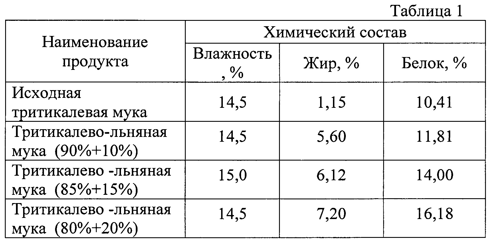 Способ получения муки относится к помолу смеси зерна для получения пищевой муки и может быть использован в пищевой промышленности, в частности при производстве кондитерских и хлебопекарных продуктов. Способ, включающий очистку исходного сырья, шелушение и размол, заключается в том, что предварительно составляют помольную смесь заранее обработанных зерен тритикале и семян и льна, которые берут в соотношении 9:1 - 8:2. Готовую смесь измельчают на вальцовых станках с расположением рифлей острие по острию. Скорость вращения быстрого вальца составляет 3,5-7,0 м/с. Соотношение окружных скоростей быстро- и медленновращающихся вальцов составляет 1,5-3,0 с плотностью нарезки вальцов от 4 до 9 штук на 1 см и с уклоном рифлей 6-10%. Продукт размола сортируют на ситах различной крупности. Зерно тритикале перед измельчением увлажняют до влажности 15,0-15,5% и отволаживают 6-8 часов. Способ позволяет расширить сырьевую базу для кондитерской и хлебопекарной промышленности. 1 з.п. ф-лы, 1 табл.