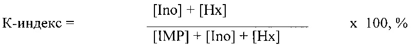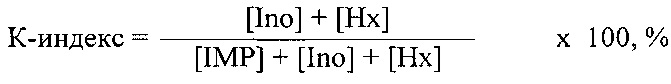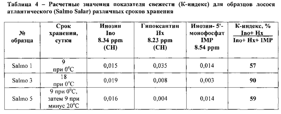Изобретение относится к рыбной промышленности, а именно к определению качества рыбного сырья. Известен способ определения готовности рыбного филе холодного копчения, сущность которого заключается в оценке готовности рыбного филе холодного копчения по изменению цвета и оптической плотности образца при определенной длине волны с помощью спектрофотометра. Но этот способ не позволяет оценить продолжительность хранения данного продукта, тем более мороженого, и не дает численную характеристику объекта, не соответствующего требованиям современной нормативно технической документации (см. патент РФ 2093824, G 01 N 33/13, 1997). Известен способ установления объективных оценочных критериев для определения предельного срока хранения и качества продуктов путем анализа деструкции мышечной ткани и ультраструктурных изменений компонентов белковой и липидной природы. Для количественной оценки деструктивных изменений в процессе холодильного хранения из всех внутриклеточных структур выбраны отдельные ультраструктурные компоненты белковой и липидной природы, т.к. степень изменения данных ультраструктур при различных температурных режимах зависит от времени (продолжительности) хранения. Оценивая уровень деструкции данной структуры по шкале от 0 до 5 включительно, вычисляют суммарную оценку деструкции мышечной ткани по формуле (см. патент РФ 2138043, G01N 33/12, 1998 г.). Известен способ оценки качества неразделанной рыбы, живой, охлажденной и подмороженной, хранившейся в различных температурных условиях. При оценке качества рыбы в качестве образца используют глазную жидкость рыбы, которую наносят на предметное стекло. В процессе микроскопирования фотографируют рисунок кристаллизации глазной жидкости, а степень качества рыбы оценивают по форме характера кристаллизации (см. патент РФ 2180112, G 01 N 33/12, 2000 г.). Наиболее близким техническим решением является способ определения качества рыбы при холодильном хранении, путем отбора проб, проведения анализа на содержание микроэлементов и определения качества рыб по их соотношению, в качестве микроэлементов определяют калий (см. Авторское свидетельство 1467507, G01N 33/12, 1986 г.). Известный способ позволяет определить качество рыбы по содержанию калия в мышечной ткани рыбы. Однако данный показатель не дает сведения о процессах, протекающих при хранении и переработке рыбного сырья. Технической задачей заявленного способа является создание достоверного способа контроля показателей качества рыбного сырья, быть простым и удобным в эксплуатации, и позволяющего дать объективную оценку «химическому» качеству рыбного сырья, а также прогнозировать сроки его хранения и управлять процессами производства продукции с заданными свойствами. Поставленная задача решается в способе определения качества охлажденного и мороженого рыбного сырья, путем спектроскопии ядерного магнитного резонанса (ЯМР) продуктов распада аденозин-5'-трифосфата (АТР) - инозина, гипоксантина и инозин-5'-монофосфата, в экстракте, съедобной части мышечной ткани рыбы, и по величине ЯМР-спектров определяют К-индекс качества сырья по формуле при этом при величине К-индекса, не превышающего 80%, сырье пригодно для пищевых целей Совершенствование способов определения качества рыбной продукции обусловлено тем, что разрабатываются современные технол