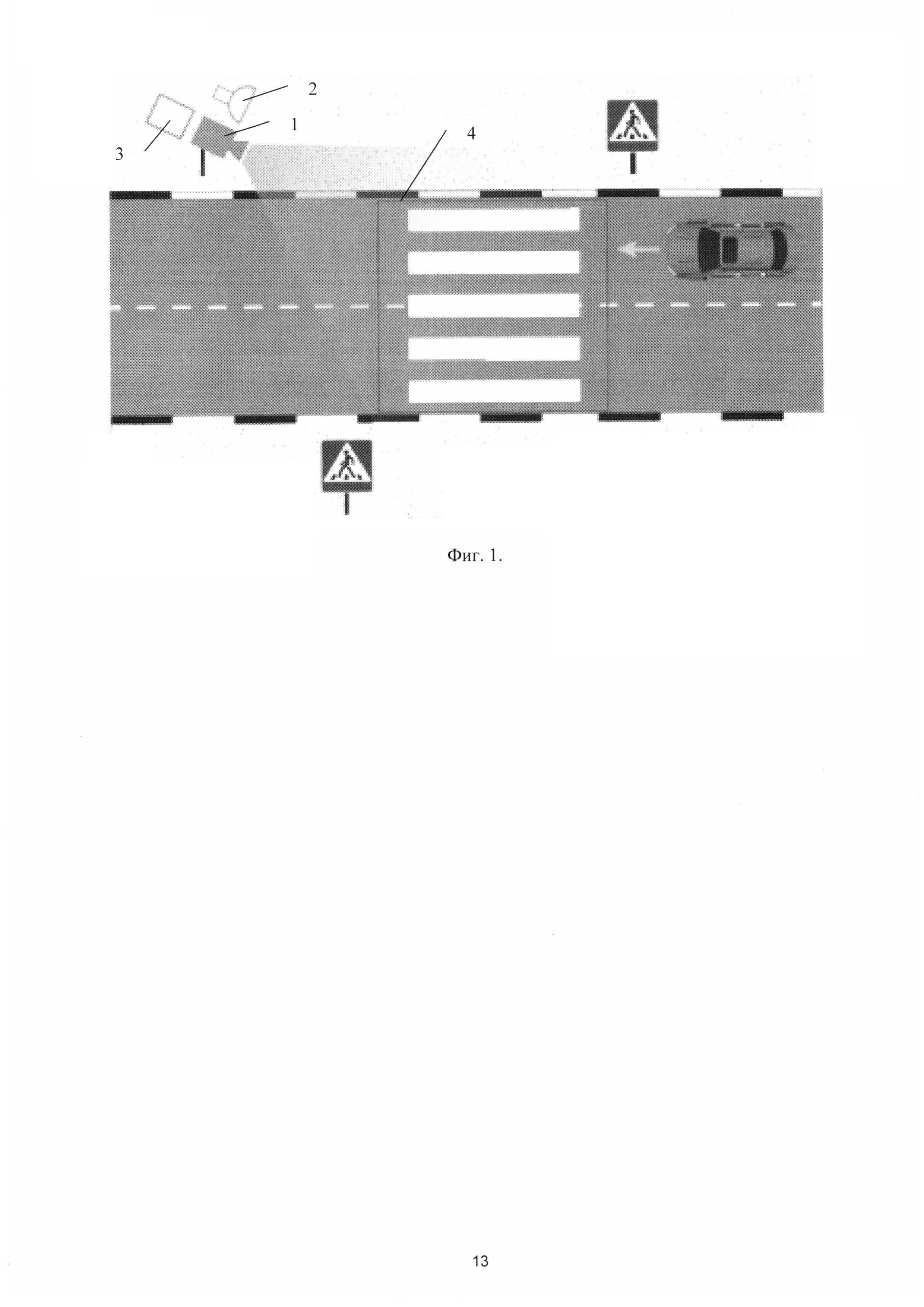 1. Система определения нарушений правил дорожного движения на нерегулируемом пешеходном переходе, содержащая видеокамеру, соединенную с блоком питания и управления, включающим в себя средство передачи данных и электронно-вычислительное устройство, которое имеет память с управляющей программой, отличающаяся тем, что видеокамера выполнена с возможностью формирования изображения зоны пешеходного перехода, включающей в себя фрагменты проезжей части попутного и встречного направления; электронно-вычислительное устройство с помощью управляющей программы выполнено с возможностью получения и записи в память изображения с видеокамеры с возможностью анализа изображения с видеокамеры, при этом распознавания государственного регистрационного знака (ГРЗ), по меньшей мере, одного транспортного средства (ТС), находящегося в зоне пешеходного перехода, определения его траектории движения и распознавания, по меньшей мере, одного пешехода, находящегося в зоне пешеходного перехода, и определения его траектории движения; а также с возможностью анализа траекторий движения транспортного средства и пешехода, при этом: 2. Система по п. 1, отличающаяся тем, что средство передачи данных выполнено с возможностью передачи информации о факте нарушения правил парковки в удаленный Центр автоматизированной фиксации административных правонарушений в области дорожного движения (ЦАФАП ОДД) ГИБДД ГУ МВД России. 3. Система по п. 1, отличающаяся тем, что содержит инфракрасный прожектор, соединенный с блоком питания и управления и выполненный с возможностью подсвечивания в инфракрасном диапазоне ГРЗ транспортных средств, находящихся в зоне пешеходного перехода. 4. Система по п. 1, отличающаяся тем, что информация о факте нарушения правила дорожного движения для каждого ТС нарушителя содержит: данные о времени, дате и месте нарушения правил дорожного движения; снимок зоны пешеходного перехода с различимым изображением пешехода, ТС нарушителя и его ГРЗ; обозначенные на снимке траектории движения пешехода и ГРЗ ТС нарушителя; обозначенные на снимке время появления начала и время появления конца траектории пешехода и траектории ГРЗ ТС нарушителя; снимок полностью читаемого ГРЗ ТС нарушителя. 5. Система по п. 1, отличающаяся тем, что информация о траектории движения пешехода и ГРЗ ТС синхронизированы по времени. 6. Способ определения нарушений правил дорожного движения на нерегулируемом пешеходном переходе, в котором посредством видеокамеры формируют изображение зоны пешеходного перехода, включающей в себя фрагменты проезжей части попутного и встречного направления; посредством электронно-вычислительного устройства с помощью управляющей программы получают и записывают в память изображение с видеокамеры, анализируют изображение с видеокамеры, при этом распознают государственный регистрационный знак (ГРЗ), по меньшей мере, одного транспортного средства (ТС), находящегося в зоне пешеходного перехода, определяют его траекторию движения и распознают, по меньшей мере, одного пешехода, находящегося в зоне пешеходного перехода, и определяют его траекторию движения, а также анализируют траекторию движения транспортного средства и пешехода, при этом: 7. Способ по п. 6, отличающийся тем, что посредством средства передачи данных передают информацию о 