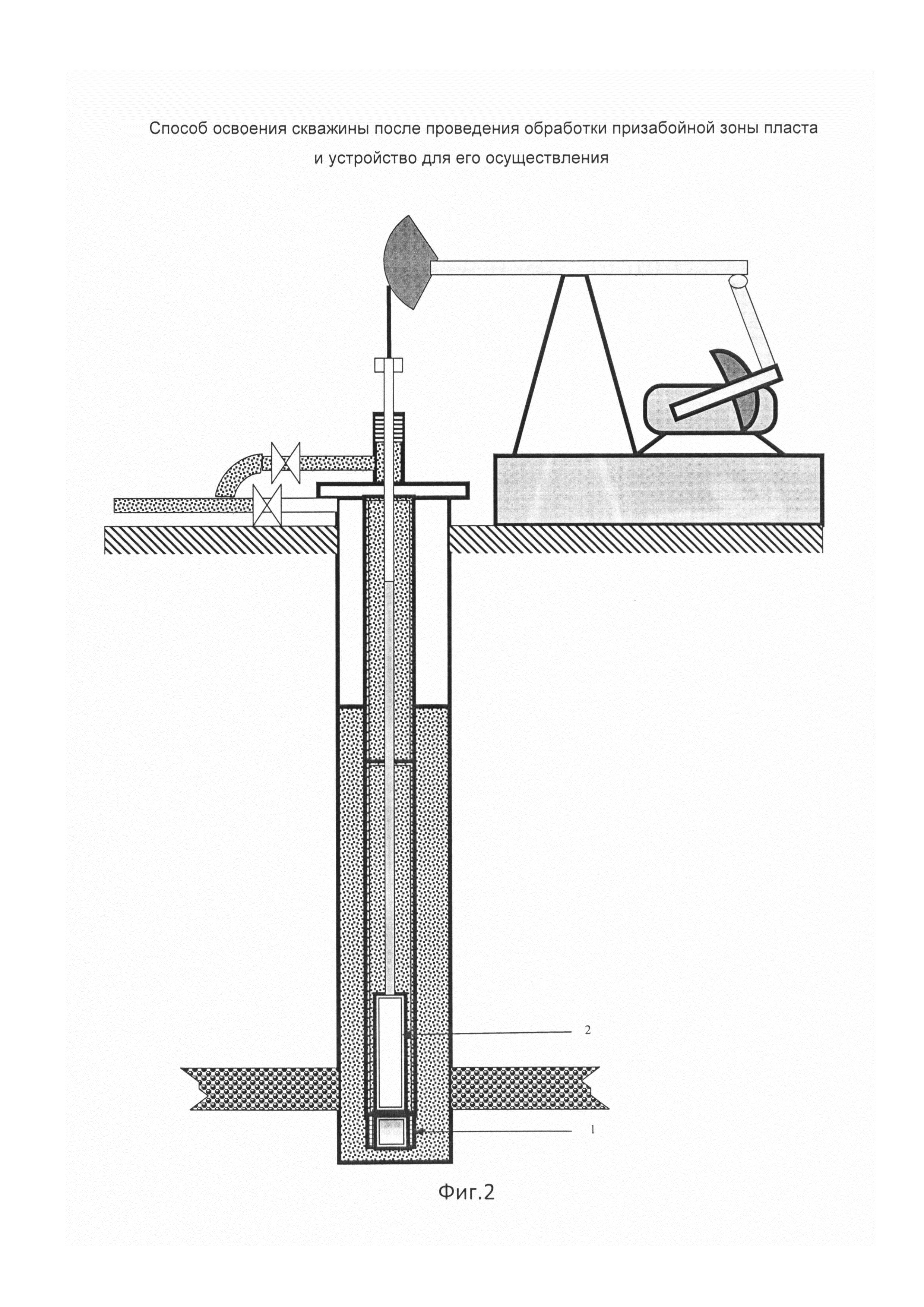 Изобретение относится к нефтедобывающей промышленности, в частности к способам освоения нефтедобывающих скважин. Технический результат - сохранение коллекторских свойств пласта, сохранение добывных возможностей скважины, полное удаление кислоты и ее продуктов реакции после окончания обработки призабойной зоны пласта, независимо от приемистости пласта и интервала зумпфа, сокращение временных и энергетических затрат на проведения процесса освоения нефтедобывающей скважины, минимизация коррозии внутрискважинного оборудования. Способ освоения нефтедобывающей скважины включает в себя этапы кислотной обработки призабойной зоны скважины, на которых закачивают кислотный раствор в призабойную зону скважины, выжидают период времени реагирования кислотного раствора с породой призабойной зоны, на котором доспускают свабограничитель на НКТ на глубину 5-10 метров выше искусственного или текущего забоя, спускают сваб в скважину, отбирают текучую среду из скважины не менее 1 объема эксплуатационной колонны +1,5 объема закаченных в пласт рабочих жидкостей, причем текучая среда, двигаясь из интервала перфорации вниз по межтрубью и далее через башмак вверх по НКТ, удаляется как из пласта, так и из зумпфа скважины. 3 з.п. ф-лы, 2 ил.