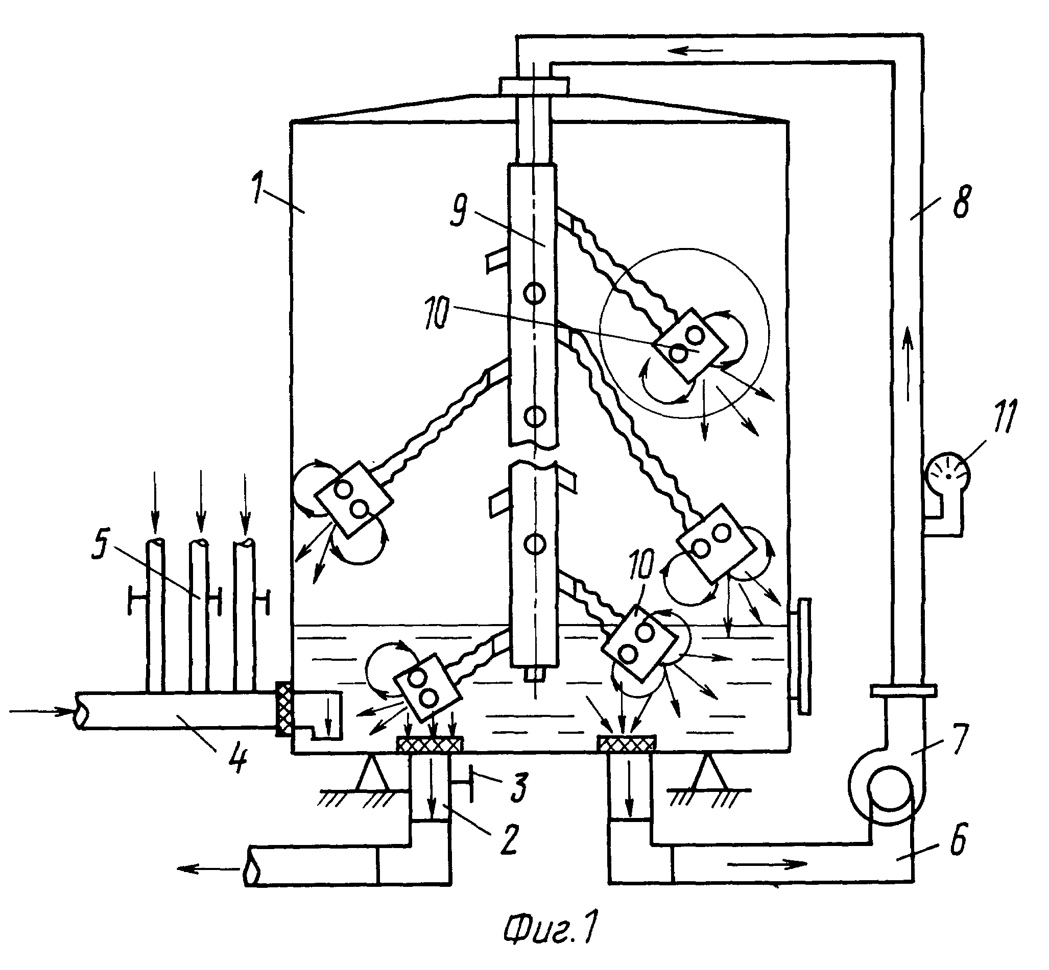 нагнетающего насоса 7 и под давлением 3 атм по трубопроводу 8 поступает в вертикальную трубу 9 и затем через гидроакустические излучатели 10 распыляется в объеме постоянно заполняемой емкости 1. По