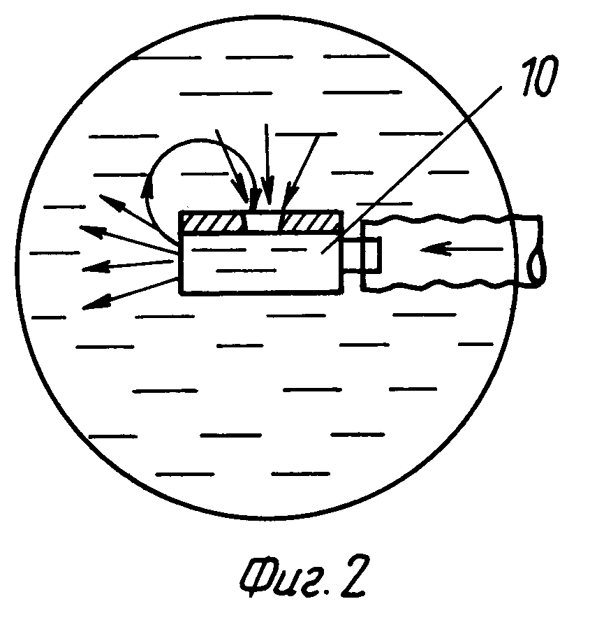 гидроакустические излучатели 10, не имеющие фиксированной направленности. Контроль за давлением жидкости на входе в емкость (акустическую систему) осуществляют манометром 11. Повышение