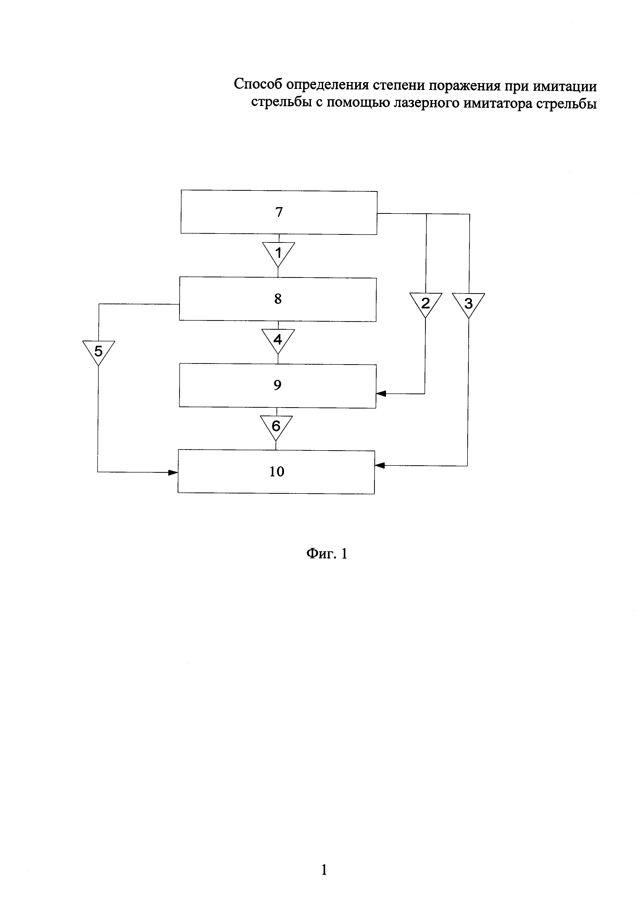 Область техники, к которой относится изобретение. Изобретение относится к области имитации поражения при обучении стрельбе и тренировке в условиях двустороннего воздействия. Уровень техники. Из уровня техники известен аналог «Система лазерного имитатора стрельбы» (патент RU 2347171, 27.05.2008), где в качестве способа определения степени поражения описана мишень, которая содержит несколько приемников сигнала лазерного излучения, расположенных на экипировке в соответствии с зонами поражения, выполненными в виде фотодиодов. Степень поражения рассчитывается в блоке отработки сигналов по определенному алгоритму. В зависимости от количества попаданий и зон поражения, степень поражения может индицироваться с помощью блока световой индикации через зажигание светодиодов определенного цвета, соответствующих степени поражения, например: - желтый цвет - легкое ранение; - зеленый цвет - ранение средней тяжести; - голубой цвет - тяжелое ранение; - красный цвет - смертельное ранение. Недостатком известного изобретения является низкая достоверность определения степени поражения мишени, из-за отсутствия информации о степени защиты точки попадания, а именно наличия или отсутствия в экипировке индивидуальных средств защиты от стрелкового оружия в виде касок и бронежилетов. Наиболее близким аналогом можно считать полезную модель «Устройство для проведения игр, имитирующих стрелковый бой» (патент RU 9400 U1, кл. A63B 71/02, 16.03.1999) включающий определение степени поражения с помощью алгоритма степени поражения, заключающийся в том, что степень поражения определяется с учетом информации о точке попадания, дистанции, типе оружия, степени зашиты точки попадания. Степень защиты точки попадания задается в начале игры каждому игроку путем допустимого количества поражений (жизнестойкостью) и возможностью автоматической корректировки указанного параметра в различных ситуациях игры. Однако указанные параметры жизнестойкости устанавливаются вручную с контролем по цифроиндикатору динамического блока индикации, после чего ручной ввод пломбируется, и корректируются автоматически в различных ситуациях игры с возможностью периодического контроля игроком этой информации и не зависят от наличия в экипировке игрока-мишени индивидуальных средств защиты, снижая тем самым достоверность определения степени поражения. Также у аналога в передаваемом лазерном луче от имитатора оружия к игроку-мишени отсутствует информация об уникальном номере стреляющего, типе оружия из которого был произведен выстрел, дальности стрельбы. Кроме того, замена аппаратных логических блоков «И, ИЛИ, НЕ», присутствующих в аналоге, на программные позволяет обеспечить возможность настройки программного обеспечения под экипировку участника учений без его замены. (Участники учений могут быть без индивидуальных средств защиты, только в каске и/или бронежилете). Раскрытие изобретения. Технический результат заключается в повышении достоверности определения степени поражения при имитации стрельбы с помощью лазерного имитатора с точностью до двух диаметров калибра оружия, при условии наличия у участников обучения индивидуальных средств защиты в виде бронежилетов и касок различной степени защищенности. Высокая точность попадания до двух диаметров калибра оружия обусловлена не