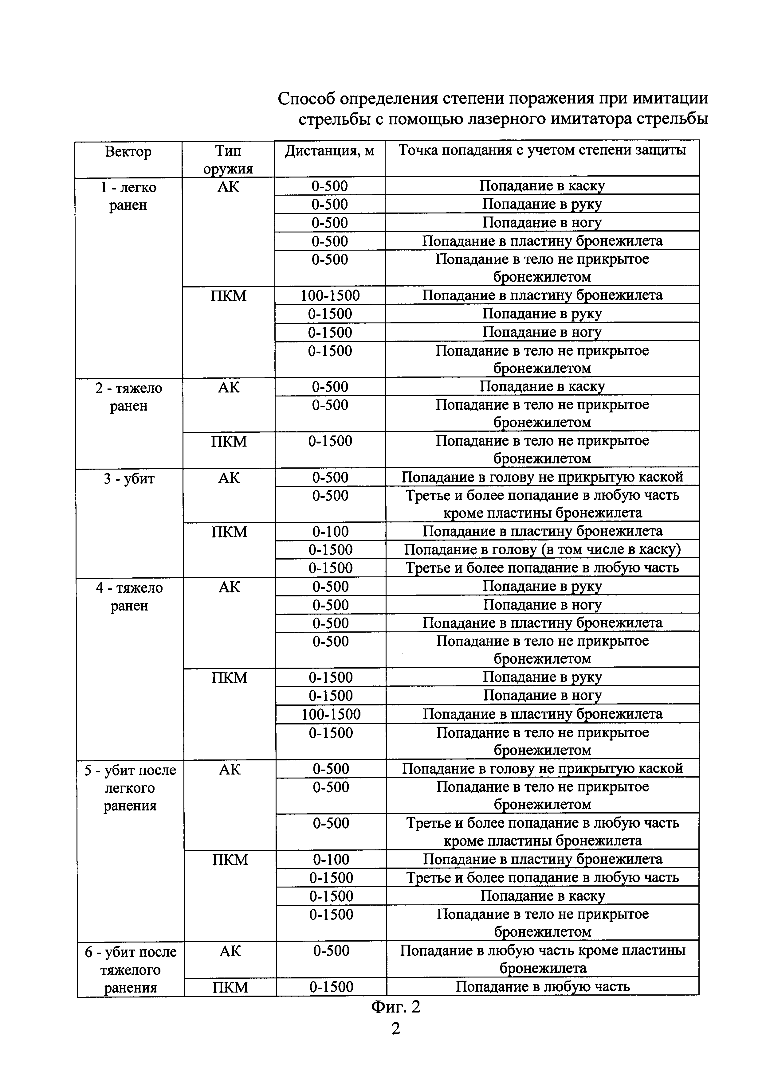 1. Способ определения степени поражения при имитации стрельбы с помощью лазерного имитатора стрельбы, включающий определение степени поражения с помощью алгоритма определения степени поражения и таблицы возможных состояний, учитывающий информацию о точке попадания, дистанции, типе оружия, степени защиты точки попадания, отличающийся тем, что точка попадания лазерного имитатора стрельбы приходится на зоны поражения, в том числе прикрытые средствами индивидуальной защиты от стрелкового оружия. 2. Способ по п. 1, отличающийся тем, что индивидуальные средства защиты от стрелкового оружия представляют собой бронежилет и/или каску различной степени защищенности.