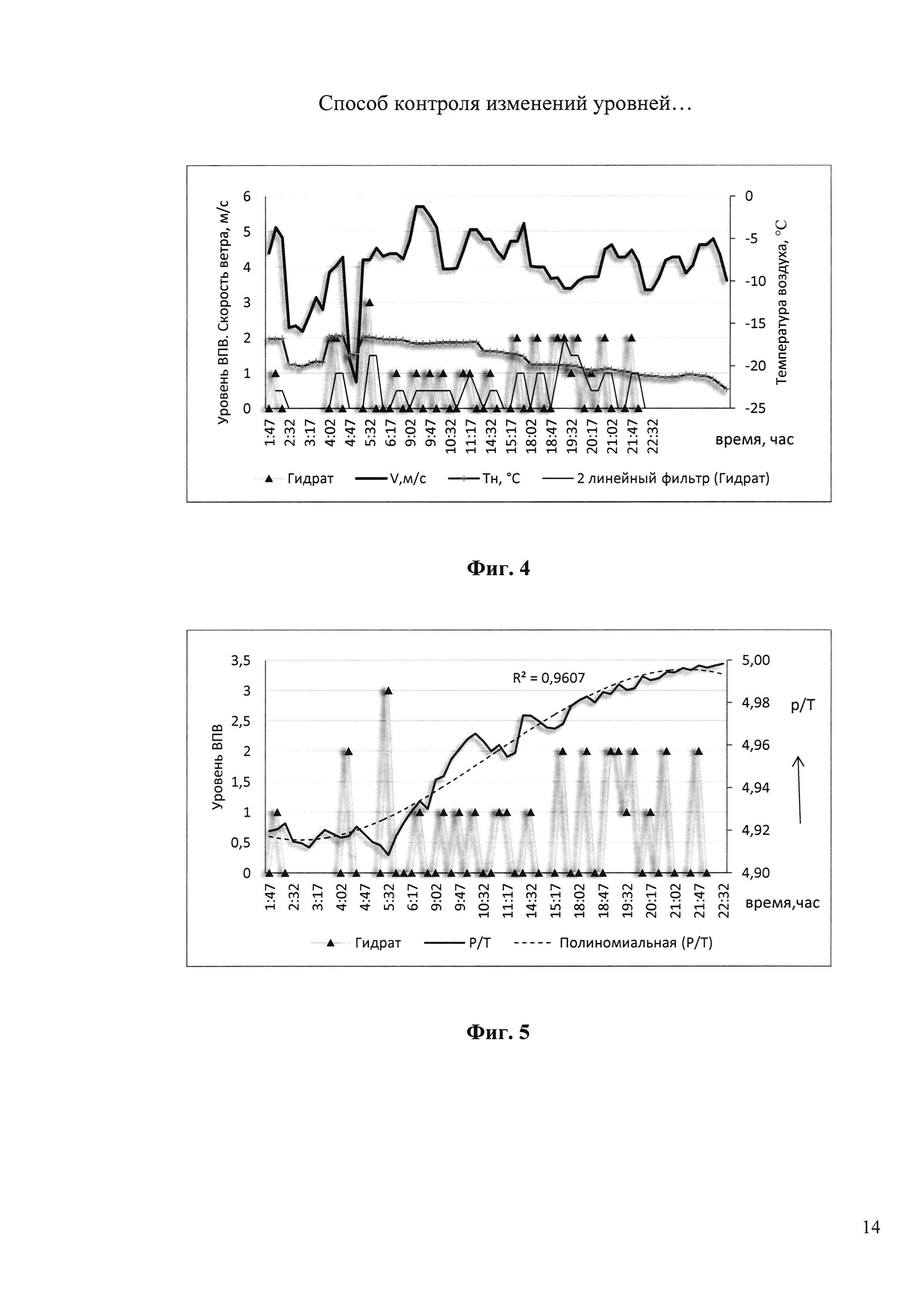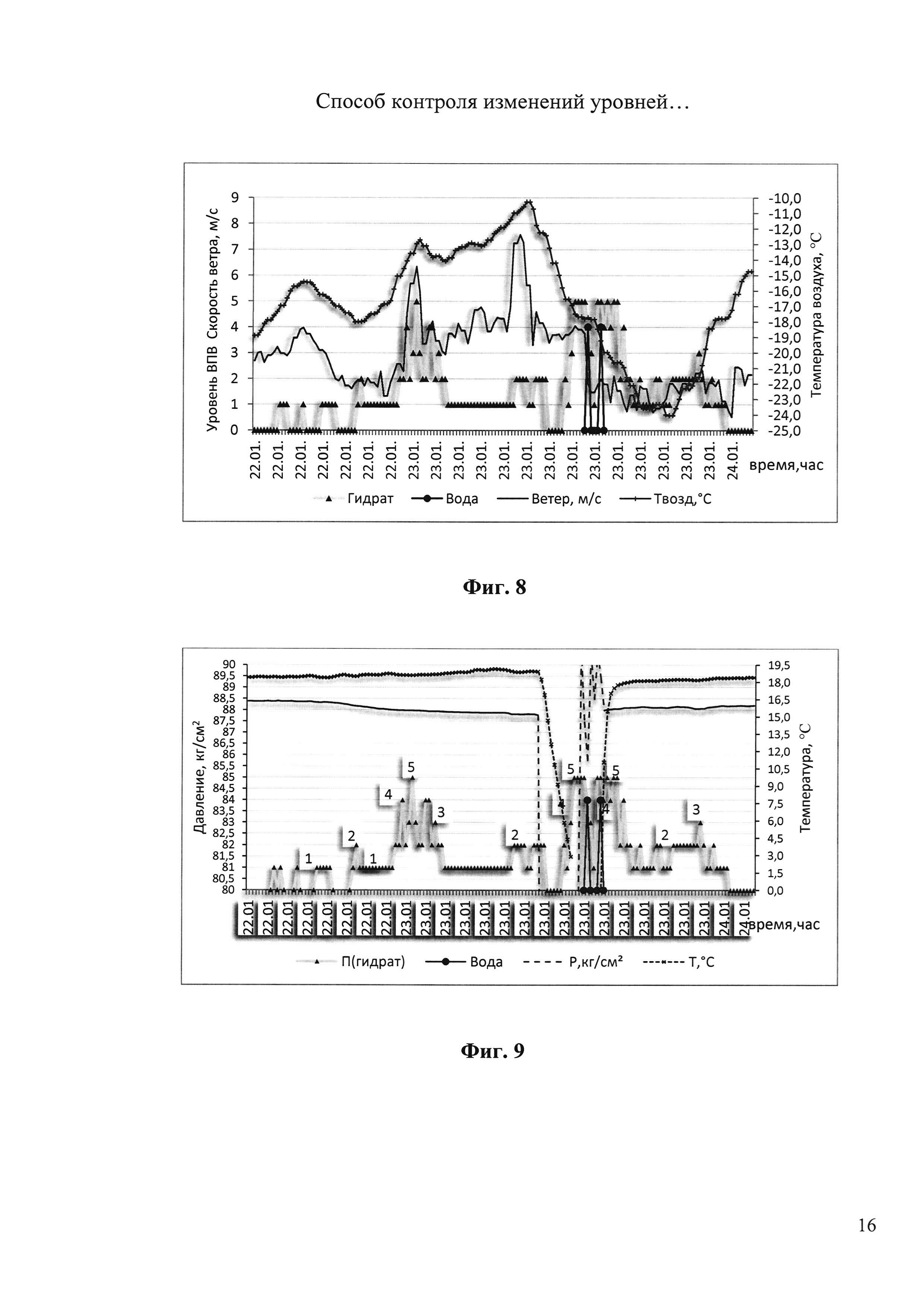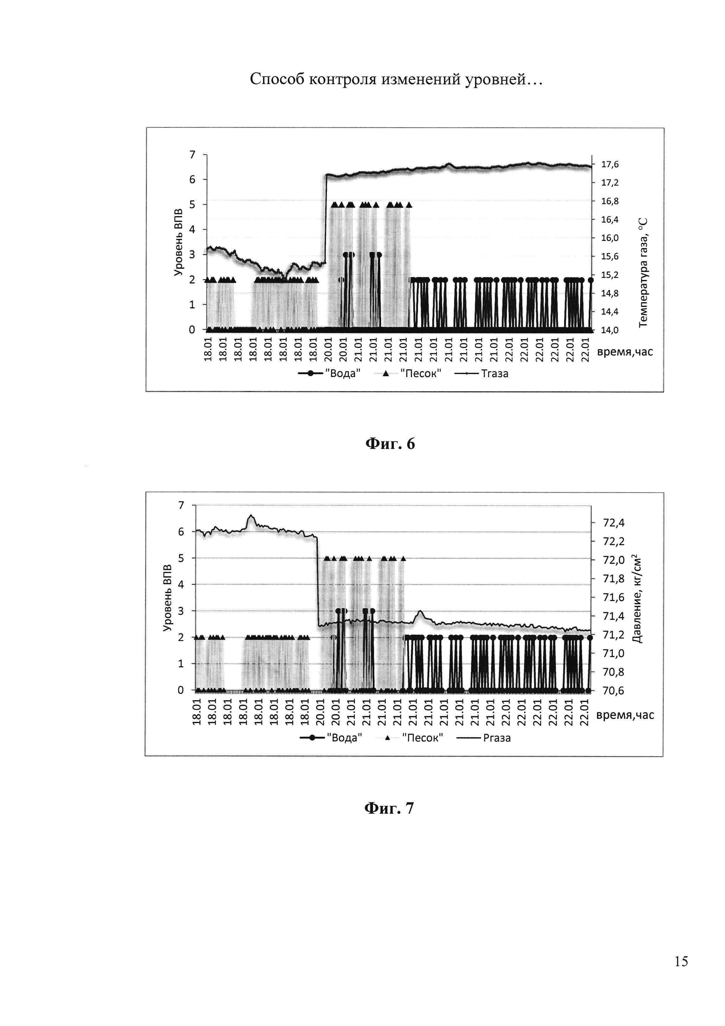 Изобретение относится к области газодобывающей промышленности и может быть использовано для контроля изменений уровней дебитов различных компонент взвесенесущего газового потока в эксплуатационных условиях газовых скважин. Техническим результатом, полученным от внедрения изобретения, является дополнительный контроль уровня гидратообразования на скважине путем использования информативного сигнала с датчика акустического, резонансного, эмиссионного типа и дополнительной информации о газодинамических условиях, в которых получается информация датчика. Для достижения поставленного технического результата в известном способе контроля изменений уровней дебита твердых включений и капельной влаги в газовом потоке в трубопроводе на устье скважины в моменты контроля дебитов твердых включений и капельной влаги в газовом потоке в трубопроводе на устье скважины дополнительно синхронно измеряют перепады температуры и избыточного давления потока, обусловливающие фазовые превращения в газовой смеси, по значению которых контролируют уровни образования гидратных структур и оценивают уровень гидратообразования на устье скважины, а контроль изменений уровней дебитов фаз проводят, когда уровень гидратообразования на устье скважины не превышает наперед заданного порогового значения. 3 з.п. ф-лы, 9 ил.