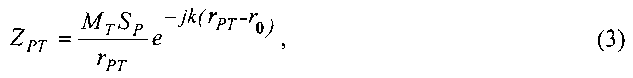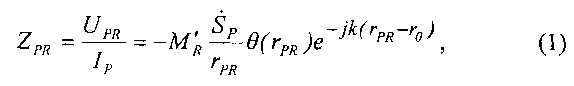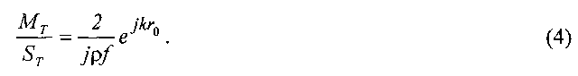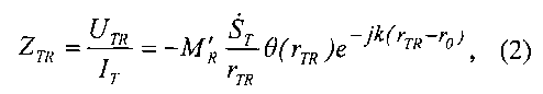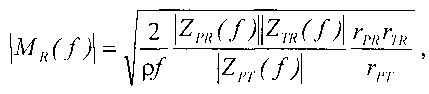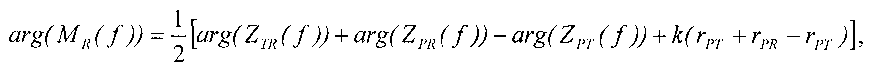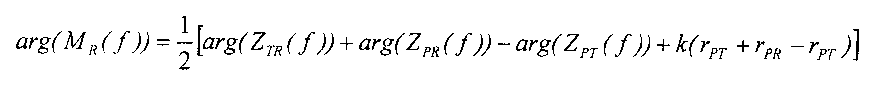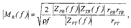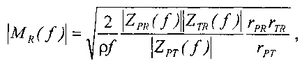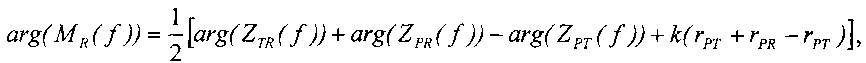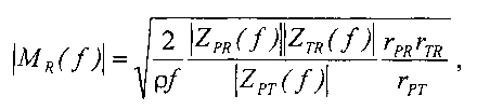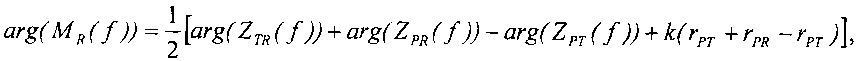 Способ определения амплитудно-частотной и фазочастотной характеристик чувствительности по полю гидроакустического приемника, заключающийся в расположении в измерительном бассейне с водой излучателя P, обратимого преобразователя T и градуируемого приемника R при известных расстояниях rPR между излучателем и приемником, rPT между излучателем и обратимым преобразователем и rTR между обратимым преобразователем и приемником достаточно больших для формирования на приемнике локально-плоских сферических звуковых волн излучателя и обратимого преобразователя, а на обратимом преобразователе - локально-плоской волны излучателя, возбуждении излучателя электрическим сигналом, измерении тока через излучатель и выходных напряжений приемника и обратимого преобразователя, возбуждении обратимого преобразователя электрическим сигналом, измерении тока через обратимый преобразователь и выходного напряжения приемника, определении частотных зависимостей комплексных передаточных импедансов по полю ZPR(f) пары излучатель - градуируемый приемник, ZPT(f) пары излучатель - обратимый преобразователь, ZTR(f) пары обратимый преобразователь - градуируемый приемник, определении амплитудно-частотной |MR(f)| и фазочастотной arg(MR(f)) характеристик чувствительности по полю градуируемого гидроакустического приемника к звуковому давлению по формулам