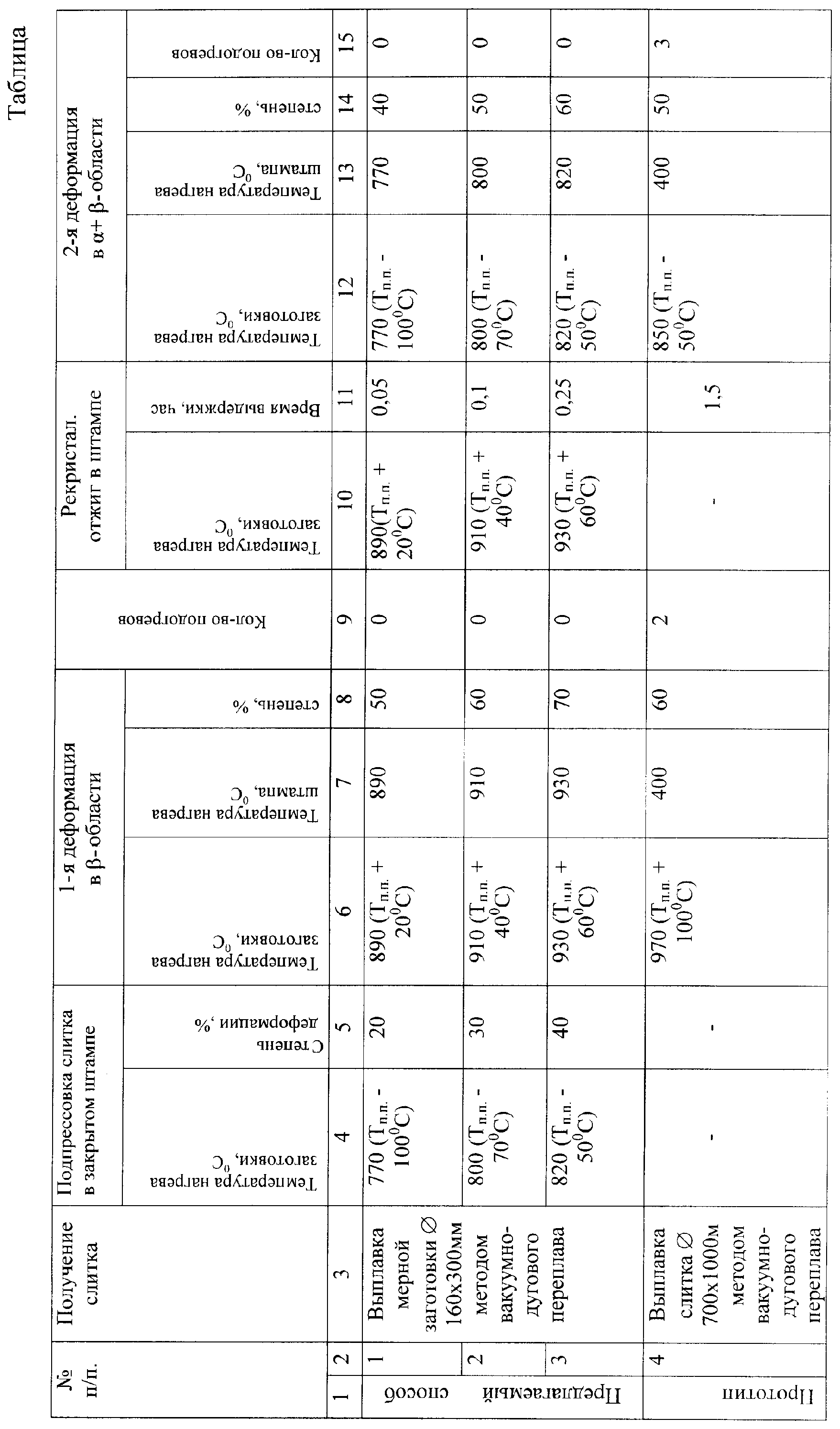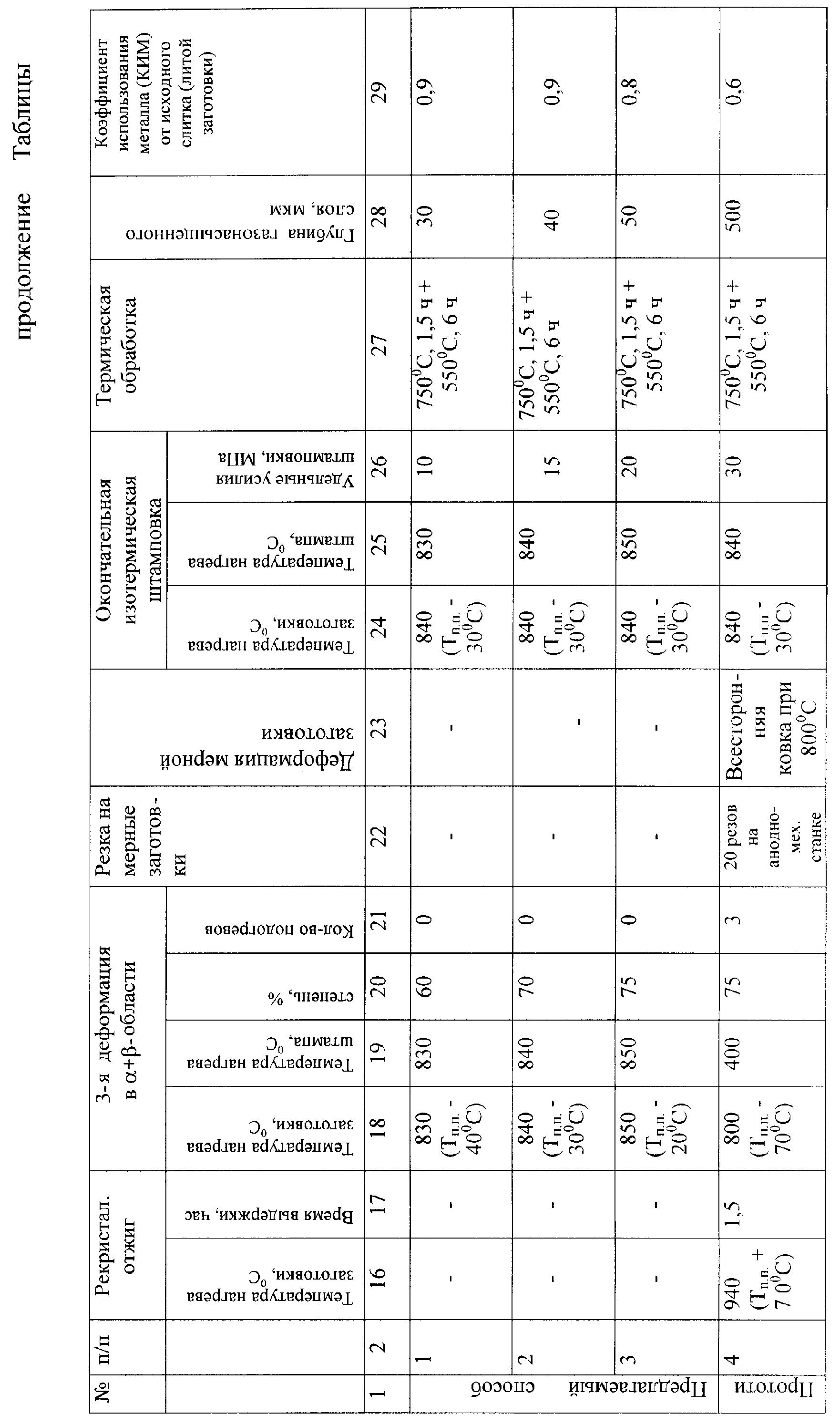 Способ получения изделия из α+β-титанового сплава, включающий получение слитка заданного химического состава, первую деформацию и рекристаллизационный отжиг слитка при температуре β-области, многократные деформации при температуре α+β-области с получением заготовки, изотермическую штамповку в закрытом штампе и термическую обработку, отличающийся тем, что слиток получают в виде мерной литой заготовки, равной по объему или весу конечному изделию, деформации осуществляют путем изотермической штамповки заготовки в закрытом штампе, перед первой деформацией проводят подпрессовку слитка при температуре Тп.п.-(50-100)°С и степени деформации 20-40%, первую деформацию проводят при температуре Тп.п.+(20-60)°С с суммарной степенью деформации, достаточной для протекания рекристаллизации, вторую деформацию проводят при температуре Тп.п.-(50-100)°С с суммарной степенью деформации не менее 40%, а третью деформацию проводят при температуре Тп.п.-(20-40)°С с суммарной степенью деформации не менее 60%, где Тп.п. - температура полиморфного превращения.