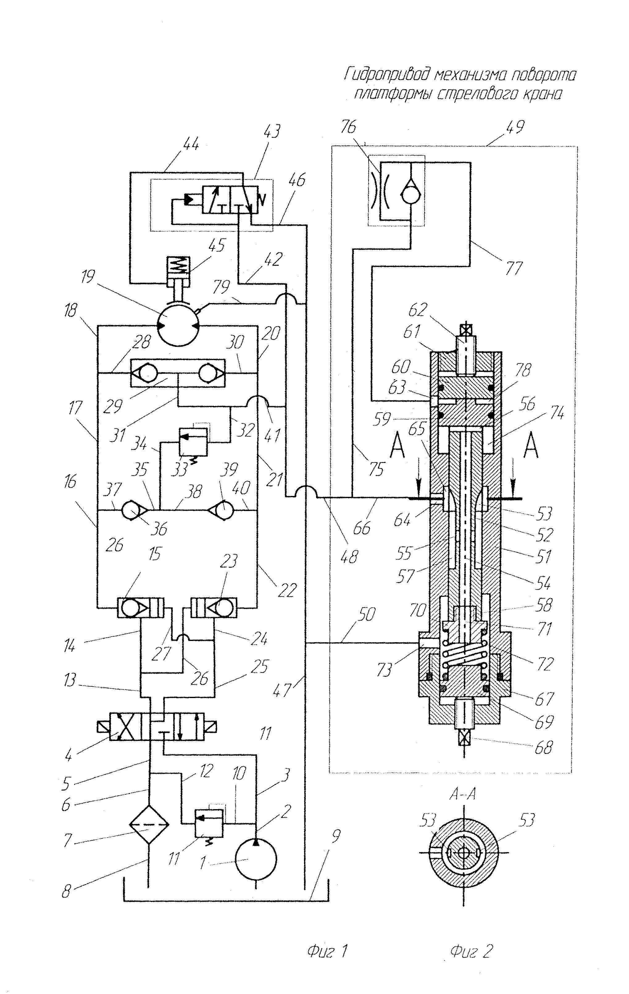 Изобретение относится к подъемно-транспортному машиностроению. Гидропривод механизма поворота платформы стрелового самоходного крана содержит насос, бак, гидромотор, гидролинии, односторонние гидрозамки, трехпозиционный кран с электромагнитным управлением, клапан ИЛИ, гидроцилиндр тормоза, предохранительный клапан, входной штуцер которого соединен через клапан ИЛИ с гидролиниями гидромотора, а выход соединен через обратные клапаны с гидролиниями гидромотора и двухпозиционным краном с гидравлическим управлением. Гидропривод также снабжен клапаном плавного пуска, содержащим корпус, золотник со щелями переменной площади и поршень, которые подпружинены. Входное отверстие корпуса сообщено со щелями переменной площади и односторонним дросселем, соединенным с управляющей полостью, образованной поршнем и корпусом, а также входное отверстие корпуса соединено с выходным клапаном ИЛИ и входом двухпозиционного крана с гидравлическим управлением. Последний соединен с гидроцилиндром тормоза Выходы корпуса и двухпозиционного крана с гидравлическим управлением сообщены с баком. Достигается уменьшение динамических нагрузок при пуске (останове) механизма поворота путем улучшения плавности регулирования скорости вращения вала гидромотора. 2 ил.