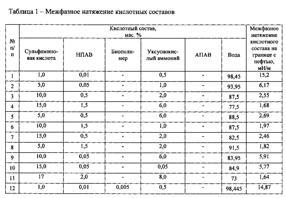 сульфаминовая кислота 10,0 НПАВ 0,5 уксуснокислый аммоний 2,0 вода с минерализацией не более 1 г/дм3 остальное, сульфаминовая кислота 10,0 НПАВ 1,0 биополимер 0,2 уксуснокислый аммоний 3,0 вода с минерализацией не более 1 г/дм3 остальное, сульфаминовая кислота 8,0 НПАВ 0,8 уксуснокислый аммоний 2,5 АПАВ 0,5 вода с минерализацией не более 1 г/дм3 остальное, сульфаминовая кислота 12,0 НПАВ 0,8 биополимер 0,1 уксуснокислый аммоний 4,0 АПАВ 0,1 вода с минерализацией не более 1 г/дм3 остальное,