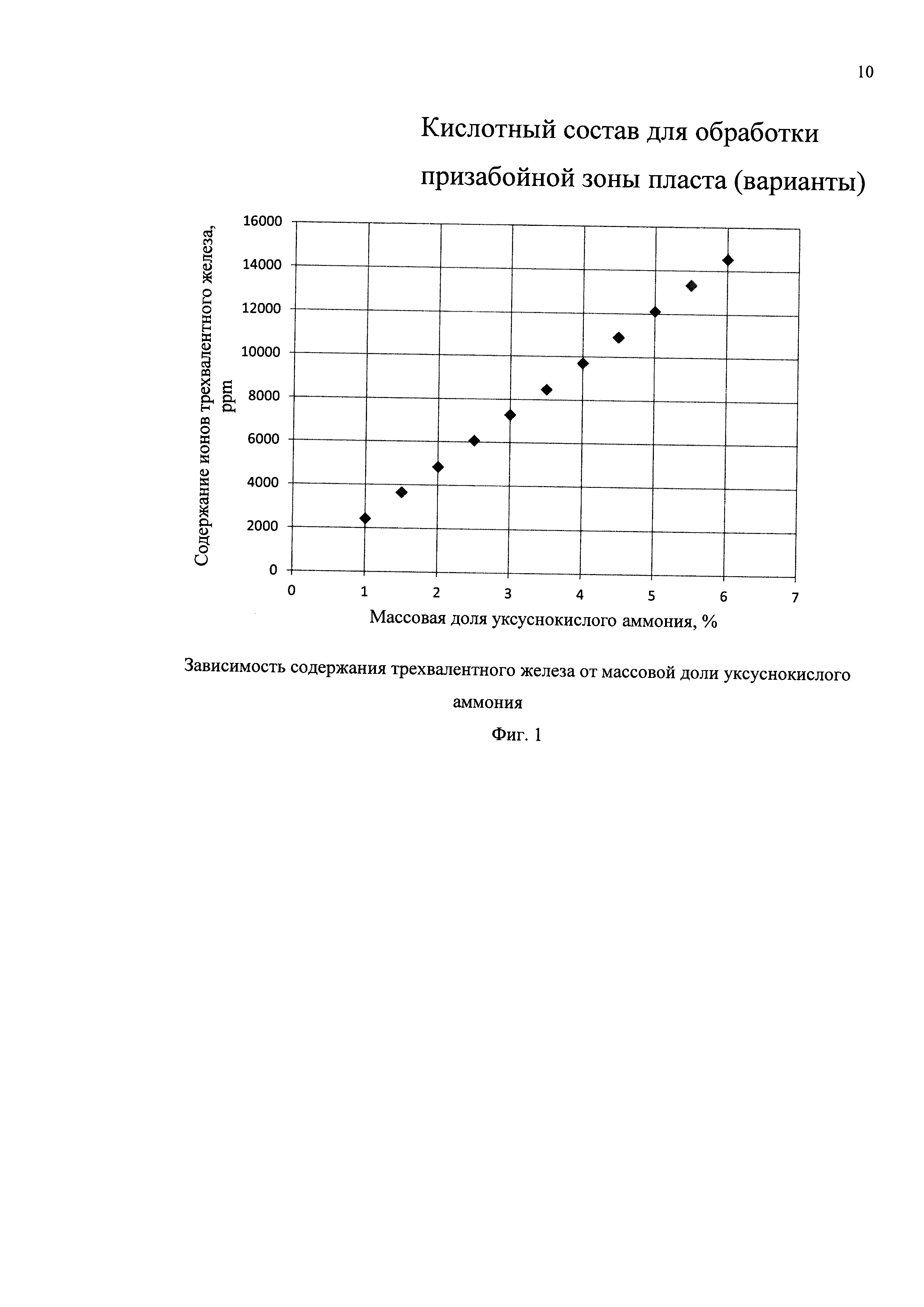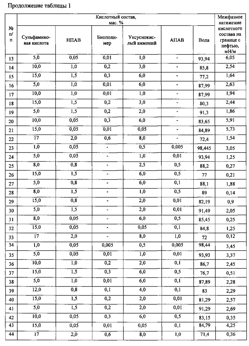 1. Кислотный состав для обработки призабойной зоны пласта, включающий сульфаминовую кислоту, неионогенное поверхностно-активное вещество - НПАВ и воду, отличающийся тем, что указанный состав дополнительно содержит стабилизатор железа - уксуснокислый аммоний при следующем соотношении компонентов, мас.%: 2. Кислотный состав для обработки призабойной зоны пласта, включающий сульфаминовую кислоту, НПАВ и воду, отличающийся тем, что указанный состав дополнительно содержит биополимер и стабилизатор железа - уксуснокислый аммоний при следующем соотношении компонентов, мас.%: 3. Кислотный состав для обработки призабойной зоны пласта, включающий сульфаминовую кислоту, НПАВ и воду, отличающийся тем, что указанный состав дополнительно содержит стабилизатор железа - уксуснокислый аммоний и анионогенное поверхностно-активное вещество - АПАВ при следующем соотношении компонентов, мас.%: 4. Кислотный состав для обработки призабойной зоны пласта, включающий сульфаминовую кислоту, НПАВ и воду, отличающийся тем, что указанный состав дополнительно содержит биополимер, стабилизатор железа - уксуснокислый аммоний и АПАВ при следующем соотношении компонентов, мас.%:сульфаминовая кислота 5,0-15,0 НПАВ 0,05-1,5 уксуснокислый аммоний 1,0-6,0 вода с минерализацией не более 1 г/дм3 остальное сульфаминовая кислота 5,0-15,0 НПАВ 0,05-1,5 биополимер 0,01-0,3 уксуснокислый аммоний 1,0-6,0 вода с минерализацией не более 1 г/дм3 остальное сульфаминовая кислота 5,0-15,0 НПАВ 0,05-1,5 уксуснокислый аммоний 1,0-6,0 АПАВ 0,01-0,5 вода с минерализацией не более 1 г/дм3 остальное сульфаминовая кислота 5,0-15,0 НПАВ 0,05-1,5 биополимер 0,01-0,3 уксуснокислый аммоний 1,0-6,0 АПАВ 0,01-0,5 вода с минерализацией не более 1 г/дм3 остальное