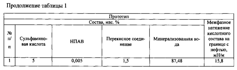 Предложение относится к нефтяной промышленности и может быть использовано при кислотной обработке призабойной зоны пласта. Наиболее распространенными составами для химического воздействия на пласт являются различные варианты кислотных составов на основе соляной кислоты с различными добавками ингибиторов коррозии и поверхностно-активных веществ (ПАВ). Однако такие составы имеют существенные недостатки. Они обладают высокой коррозионной активностью по отношению к промысловому оборудованию и имеют высокую скорость реагирования с породами продуктивного пласта и, как следствие, недостаточно глубокое проникновение кислотного состава в пласт. Известен состав для кислотной обработки призабойной зоны карбонатного пласта (пат. RU №2347799, МПК С09К 8/74, опубл. 27.02.2009 г., Бюл. №6), включающий, об. %: легкую нефть - 78-82, 15%-ный водный раствор сульфаминовой кислоты - 17,92-21,9, ПАВ АФБ-9-12 - 0,07-0,1. Недостатком данного состава является образование водонефтяных эмульсий в призабойной зоне пласта, приводящее к снижению продуктивности добывающих скважин. Известны кислотные составы для обработки фильтровой части скважин и призабойной зоны пласта (варианты) (пат. RU №2319724, МПК С09К 8/74, опубл. 20.03.2008 г., Бюл. №8), содержащие, мас. % по первому варианту: лимонную кислоту - 10,0-20,0, полиэтиленоксид-4000 - 2,4-7,0, вода - остальное. По второму варианту: лимонную кислоту - 10,0-20,0, полиэтиленоксид-4000 - 2,4-7,0, поливиниловый спирт марки 18/11 - 1,4, вода - остальное. По третьему варианту: лимонную кислоту - 30,0-40,0, полиэтиленоксид-4000 - 54-63, поливиниловый спирт марки 18/11 - 6,0-7,0, вода - остальное. Недостатками данных составов являются низкая эффективность из-за низкой скорости растворения кольматирующих элементов в призабойной зоне пласта, а также засорение призабойной зоны продуктами реакции кислотных составов с солями кальция. Известен способ удаления кольматирующих образований из призабойной зоны терригенного пласта (пат. RU №2283952, МПК E21B 43/27, опубл. 20.09.2006 г., Бюл. №26), в котором используется кислотный технологический раствор, включающий в качестве кислоты и ПАВ - кислотный реагент состава, мас. %: смесь анионных и катионных ПАВ разного химического строения Нефтенол K - 0,1-1,0, сульфаминовая кислота - 1,0-10,0, лимонная кислота - 0,1-1,0, ингибитор коррозии ИКУ-1, или ацетофенон, или метилэтилкетон - 0,05-3,0, одноатомный или многоатомный спирт - 0,0-40,0, вода - остальное. Недостатком кислотного технологического раствора является образование вторичных осадков вследствие реакции окисляющих серосодержащих компонентов раствора с карбонатной породой и минерализованной водой, приводящих к ухудшению проницаемости призабойной зоны пласта. Наиболее близким по технической сущности и достигаемому эффекту является кислотный состав, используемый в способе удаления кольматирующих образований из призабойной зоны пласта после первичного вскрытия для восстановления фильтрационно-емкостных свойств коллектора (пат. RU №2540767, МПК С09К 8/74, опубл. 10.02.2015, Бюл. №4), содержащий мас. %: перекисное соединение - 0,5-3,0, сульфаминовую кислоту - 5,0-10,0, неионогенное поверхностно-активное вещество (НПАВ) - 0,0005-0,02, минерализованную воду - остальное. Недостатками данного состава являются недостаточная эффективность воздействия на пласт за счет засорения призабойной зоны пласта продуктами реакции перекисных соединений с кальциевыми солям
