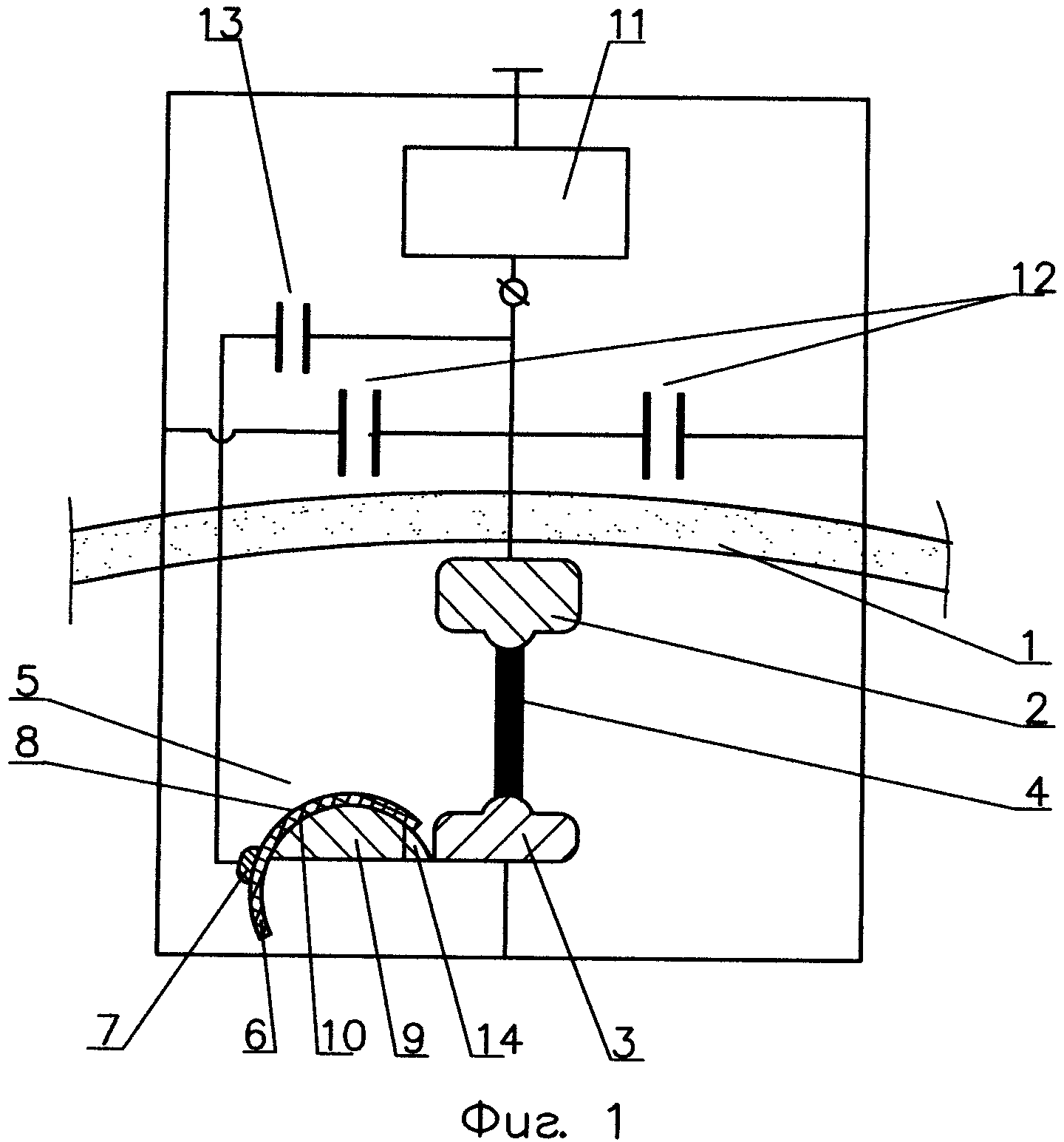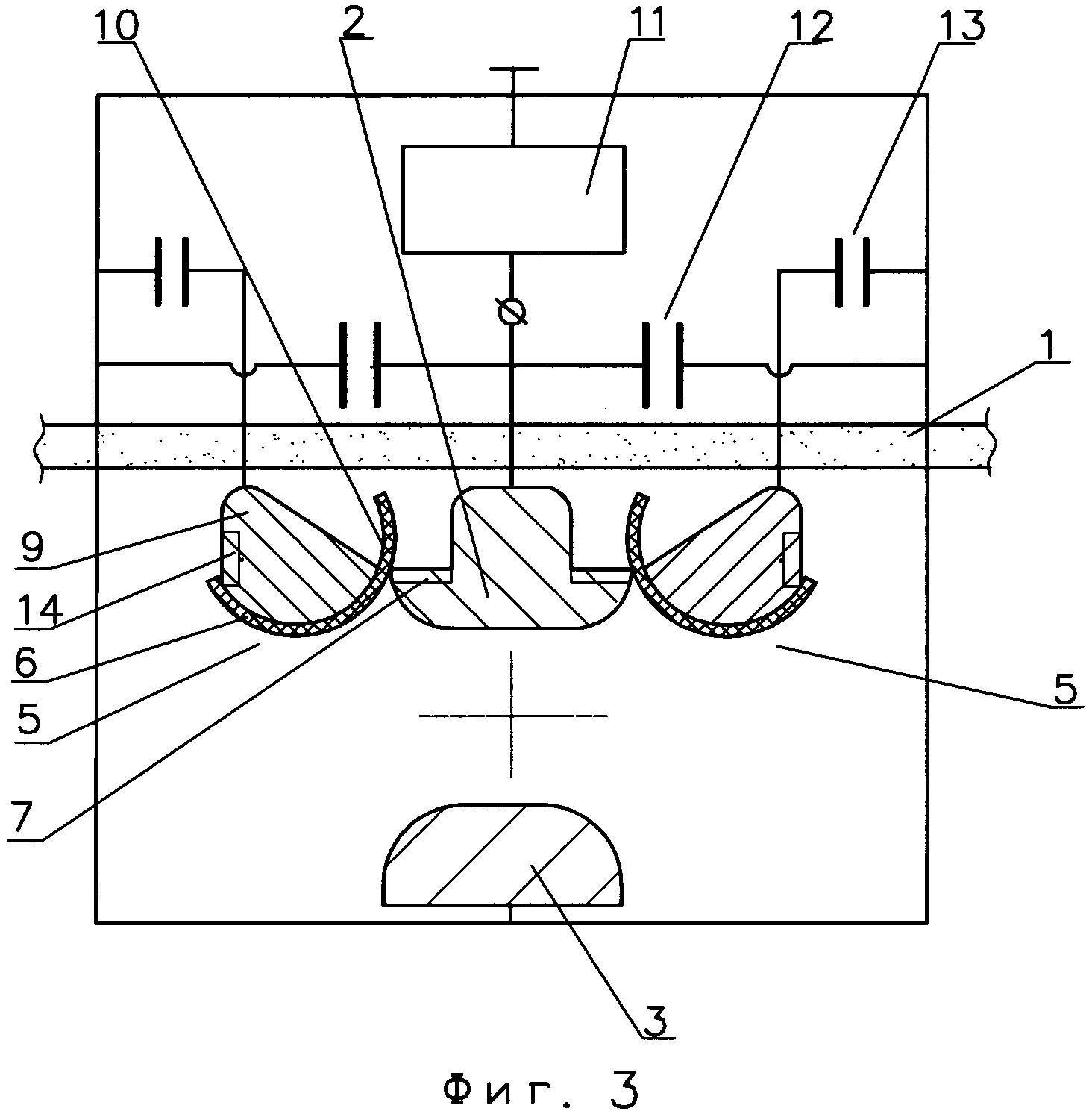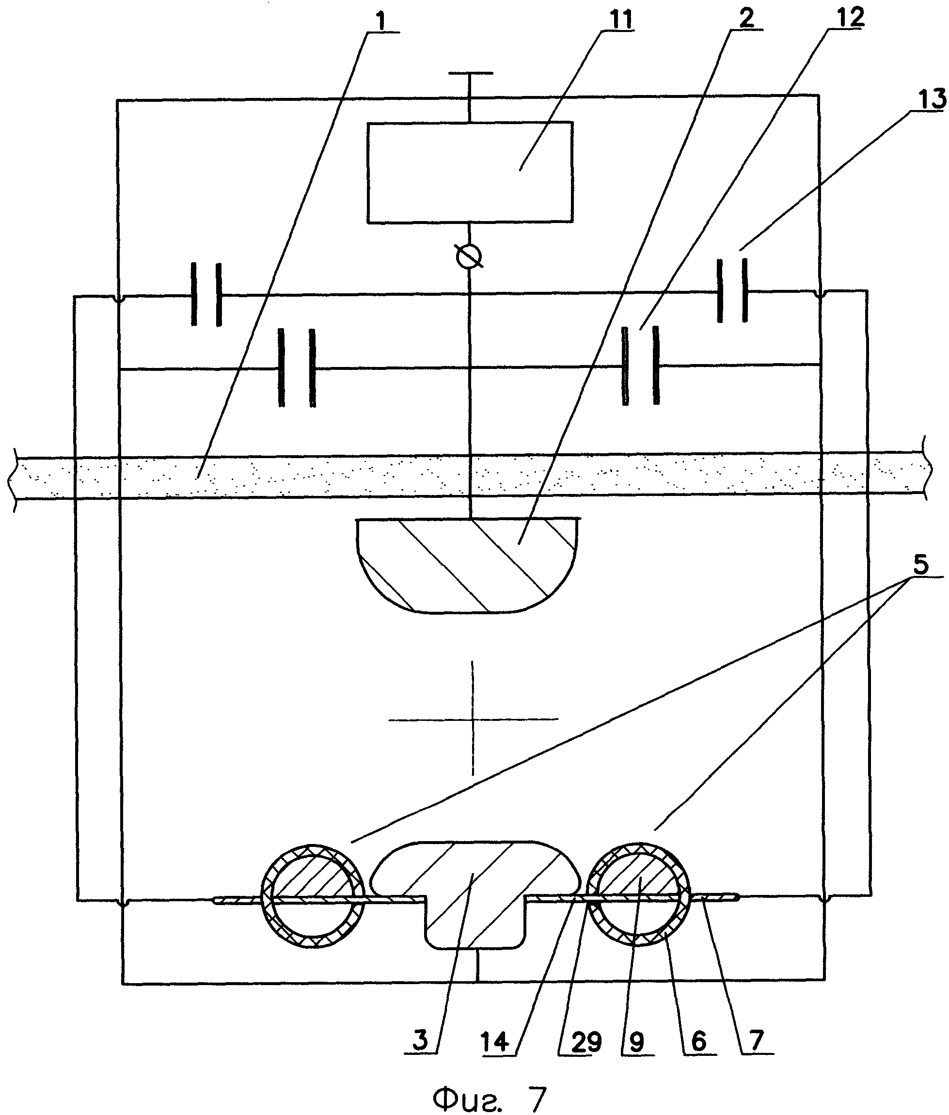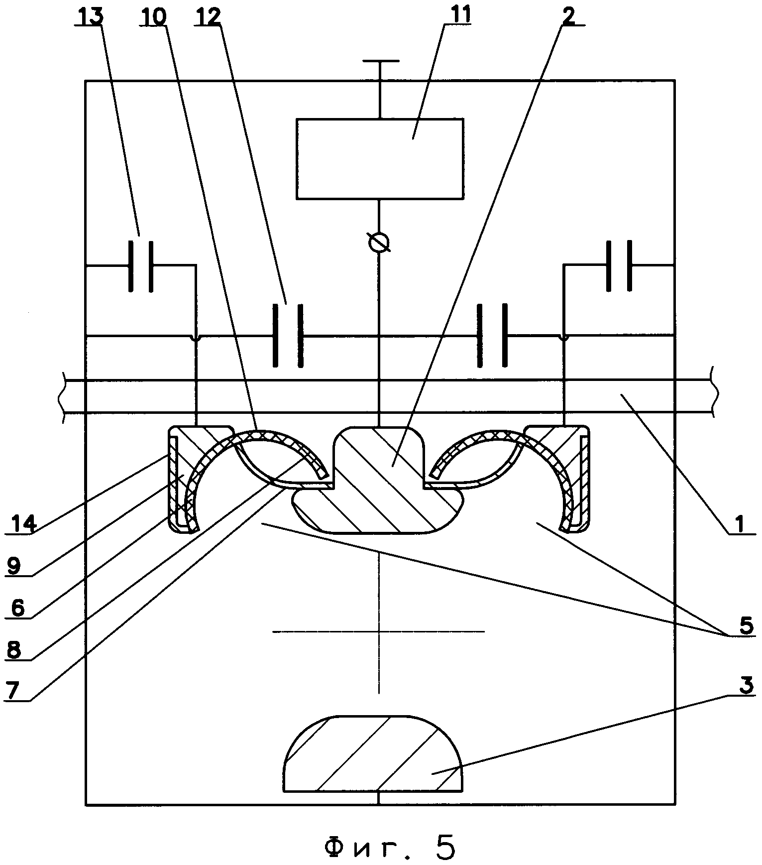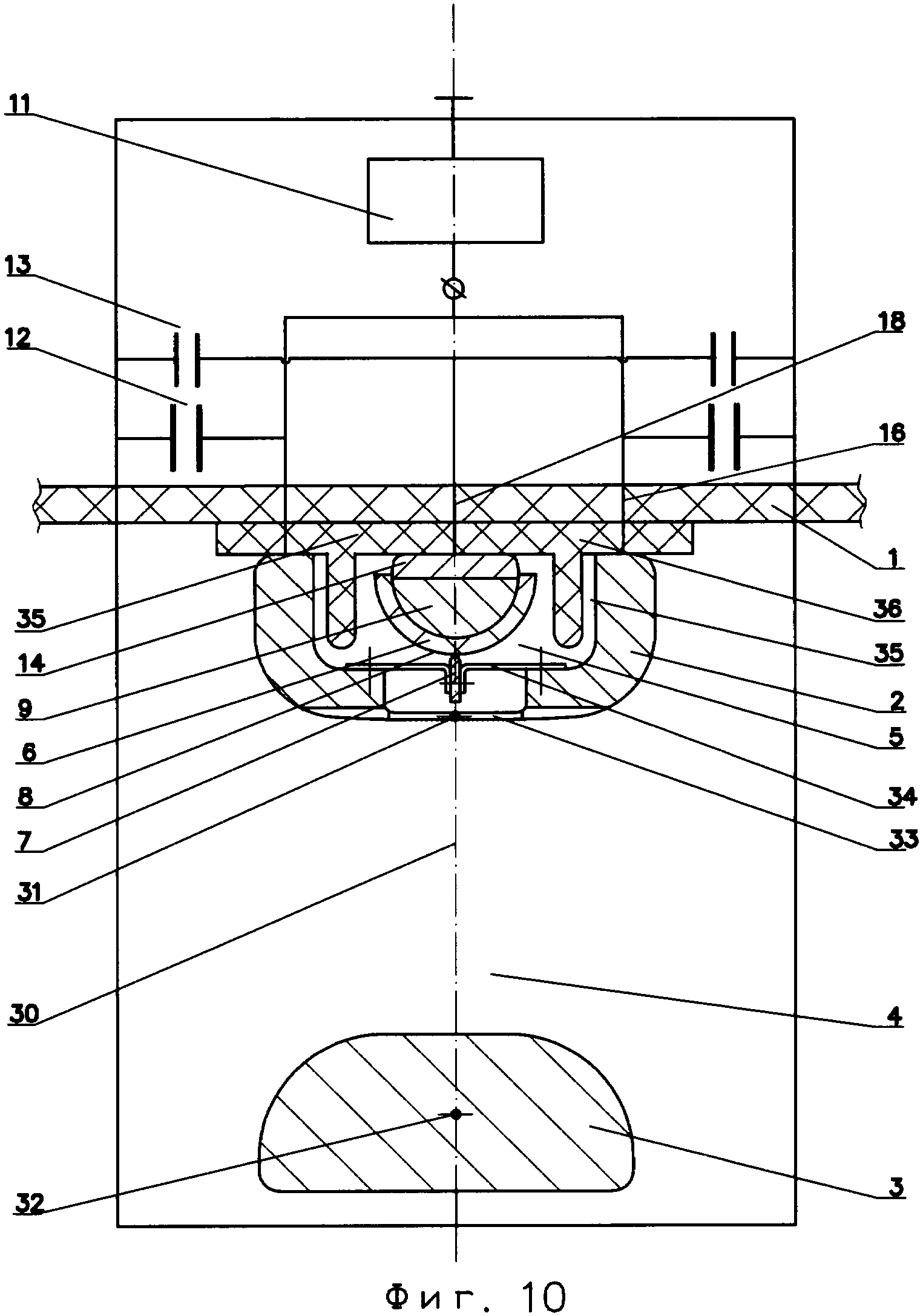 1. Разрядная система эксимерного лазера, включающая в себя расположенные в лазерной камере (1) протяженные первый электрод (2), установленный со стороны стенки лазерной камеры (1), второй электрод (3), зону объемного разряда (4) между первым и вторым электродами (2), (3), продольные оси которых параллельны друг другу, по меньшей мере, один блок предыонизации (5), содержащий 2. Устройство по п. 1, в котором система формирования CP установлена так, чтобы образующие цилиндрической поверхности изогнутой диэлектрической пластины (6) были параллельны продольным осям первого и второго электродов (2), (3). 3. Устройство по п. 1, в котором, лицевая и обратная стороны (8), (10) изогнутой диэлектрической пластины (6) являются цилиндрическими. 4. Устройство по п. 1, в котором, по меньшей мере, часть поверхности изогнутой диэлектрической пластины (6), совмещенная с поверхностью инициирующего электрода (9), является кругло- цилиндрической. 5. Устройство по п. 1, в котором изогнутая диэлектрическая пластина (6) выполнена в виде протяженной части цилиндрической тонкостенной диэлектрической трубки, заключенной между двумя продольными сечениями трубки, параллельными ее продольной оси. 6. Устройство по п. 1, в котором два идентичных блока предыонизации (5) расположены по бокам либо первого электрода (20), выполненного сплошным, либо второго электрода (3), выполненного сплошным. 7. Устройство по п. 1, в котором лицевая поверхность (8) изогнутой диэлектрической пластины (6) выпуклая. 8. Устройство по п. 1, в котором в качестве материала изогнутой диэлектрической пластины (6) используется либо сапфир, либо керамика, в частности, Al2O3. 9. Устройство по п. 1, в котором инициирующий электрод (9) выполнен охлаждаемым либо потоком газа, либо жидким теплоносителем. 10. Устройство по п. 1, в котором каждая точка зоны разряда (4) между первым и вторым электродами (2), (3) находится в зоне прямой видимости, по меньшей мере, части поверхностности изогнутой диэлектрической пластины (6), используемой для формирования СР. 11. Устройство по п. 1, в котором лицевая поверхность (8) изогнутой диэлектрической пластины (6) вогнутая. 12. Устройство по п. 1, в котором часть изогнутой диэлектрической пластины (6), не используемая для формирования CP, расположена с обратной стороны либо первого электрода (2), либо второго электрода (3). 13. Устройство по п. 1, в котором изогнутая диэлектрическая пластина (6) выполнена в виде цилиндрической тонкостенной диэлектрической трубки с продольным разрезом (29). 14. Устройство по п. 1, в котором изогнутая диэлектрическая пластина (6) выполнена в виде цилиндрической тонкостенной диэлектрической трубки с продольным разрезом (29), инициирующий электрод (9) размещен внутри диэлектрической трубки, и дополнительный электрод (14) соединен с инициирующим электродом (9) через продольный разрез (29) диэлектрической трубки. 15. Устройство по п. 1, в котором либо поджигающий электрод (7), либо дополнительный электрод (14), соединен либо с первым электродом (2), либо со вторым электродом (3). 16. Устройство по любому из пп. 1-5, 7-9, 12, 13, 15, в котором либо первый электрод (2), либо второй электрод (3) выполнен частично прозрачным, имеющим с обратной стороны протяженную нишу (35), в которой, по меньшей мере, частично размещен протяженный блок предыонизации (5), при этом в блоке предыонизации (5) система формирования CP выполнена симметричной отно