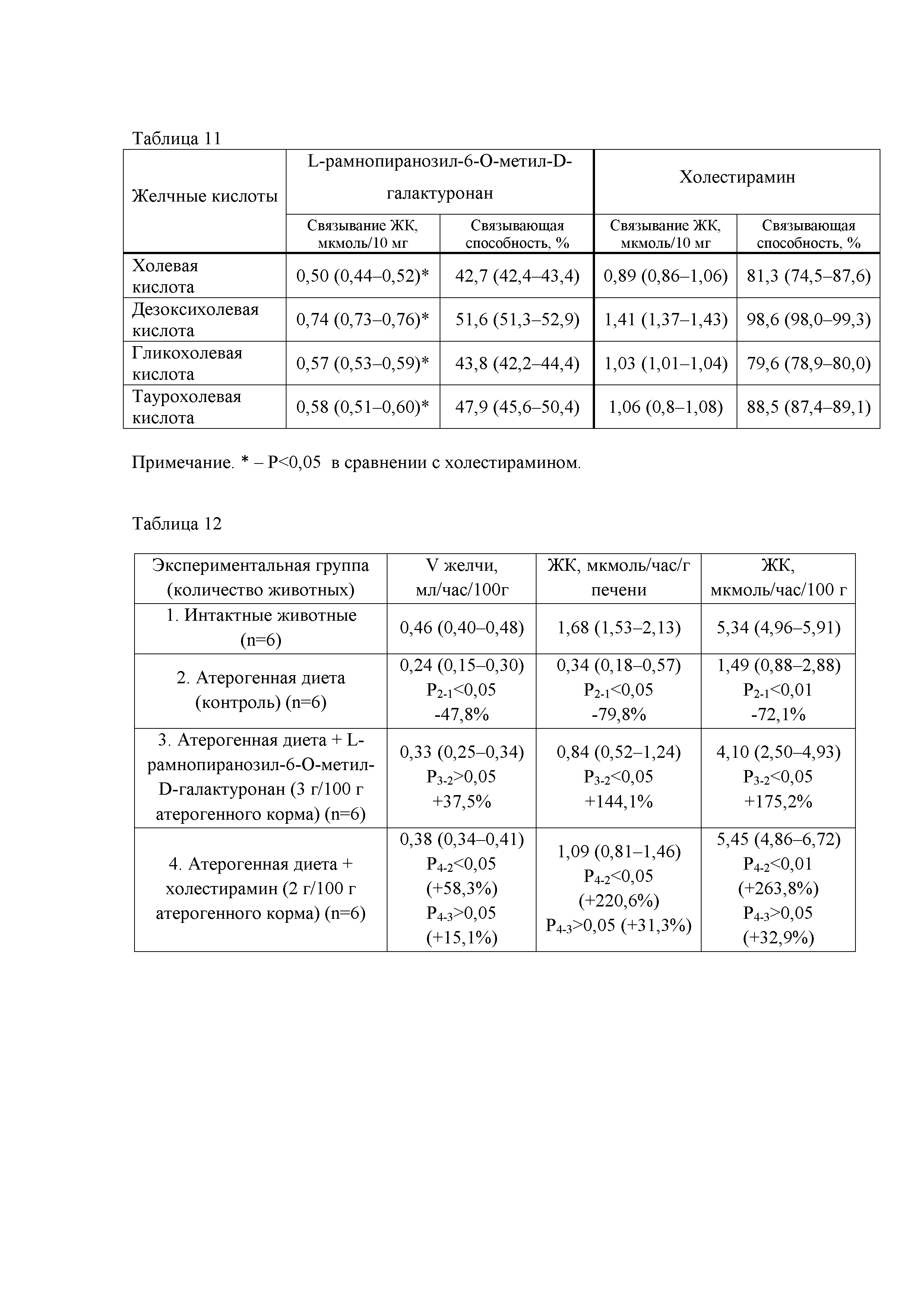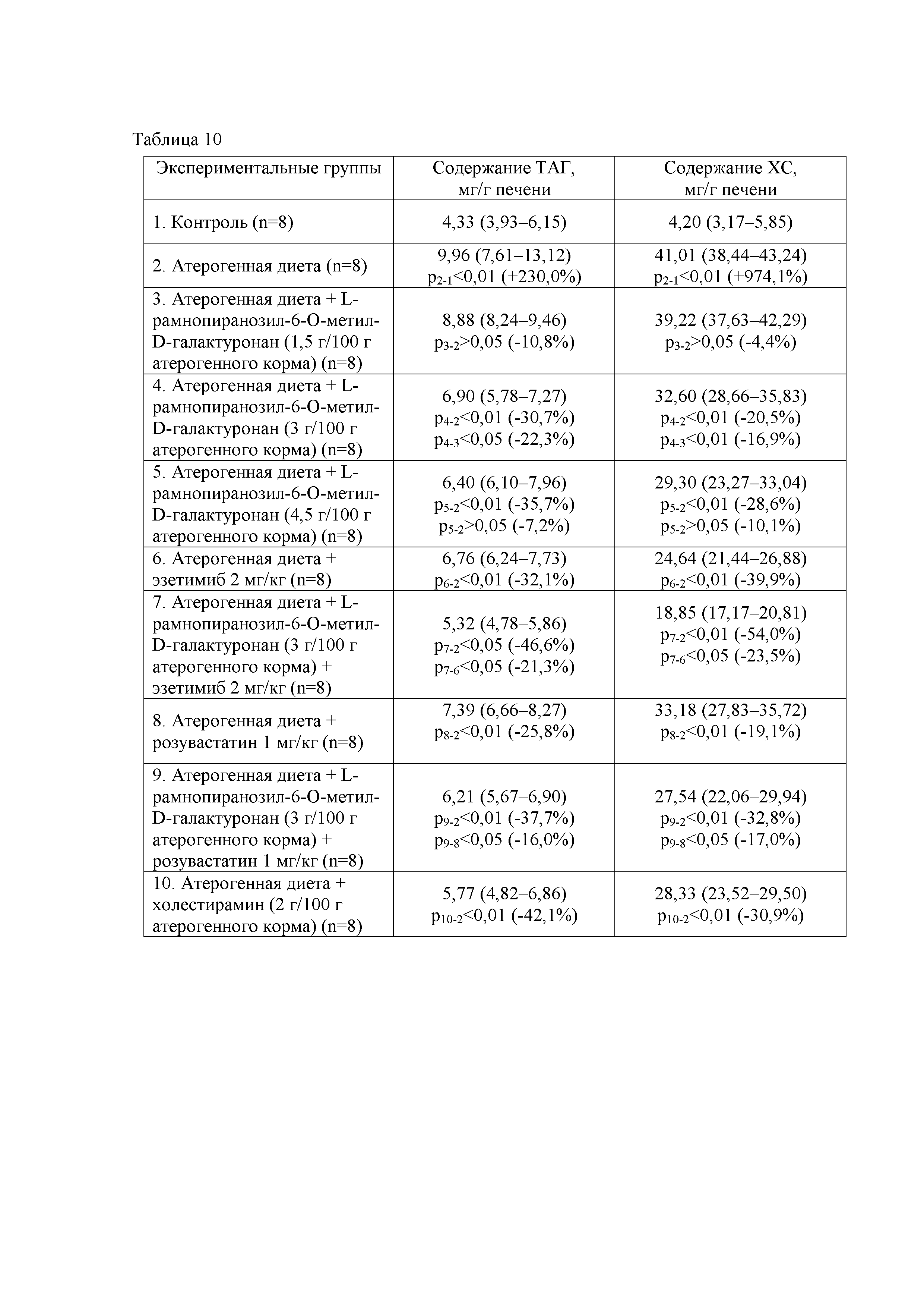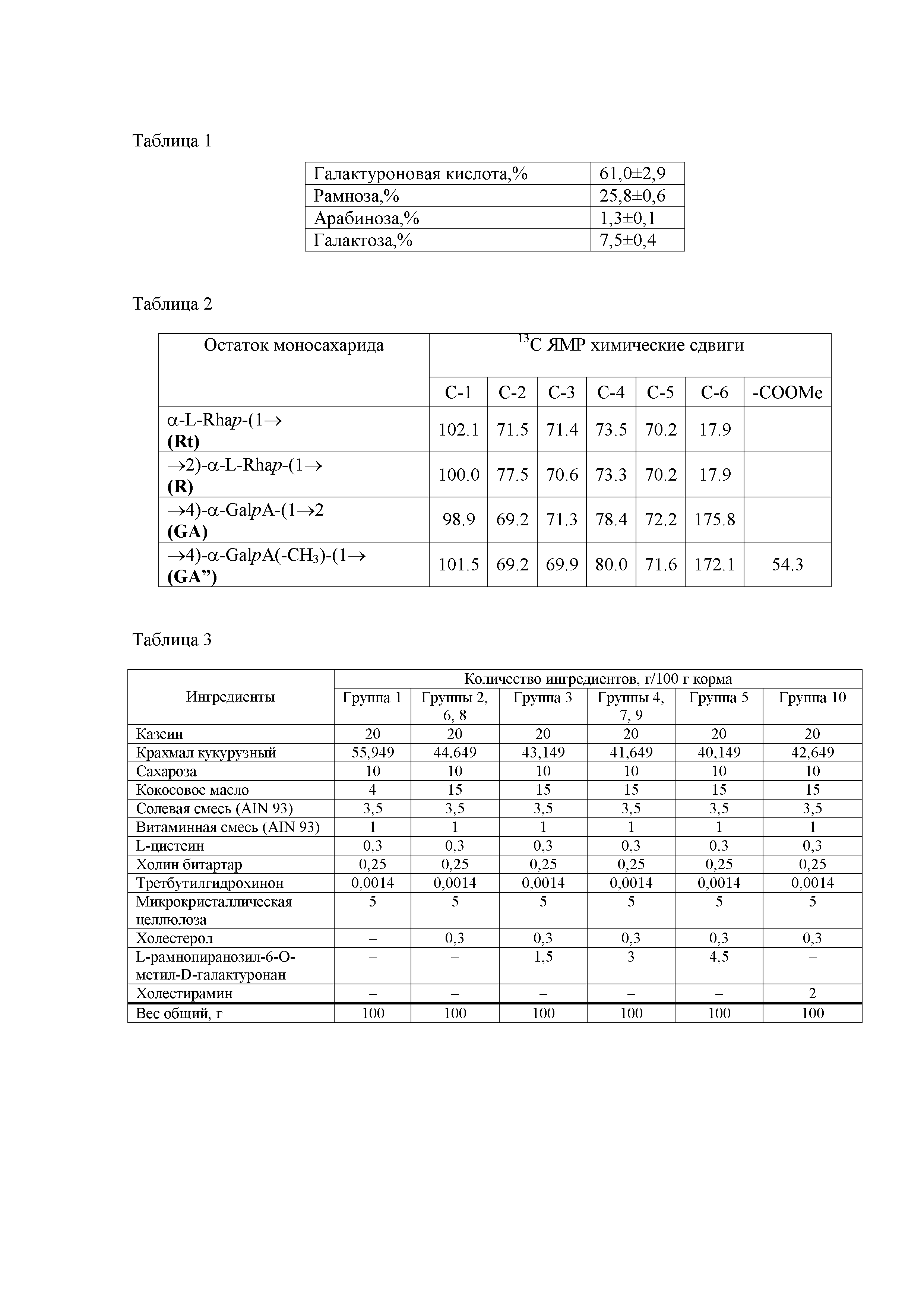 Изобретение относится к биологически активным соединениям, используемым в медицине и фармацевтической промышленности. Объектом изобретения является применение L-рамнопиранозил-6-О-метил-D-галактуронана в качестве гиполипидемического и гипохолестеринемического средства. В частных случаях L-рамнопиранозил-6-О-метил-D-галактуронан может быть выделен из листьев березы повислой (); может применяться в качестве средства, снижающего уровень холестерина; может применяться для терапии гиперхолестеринемий в комбинации с ингибиторами ГМГ-КоА редуктазы (статинами) или в комбинации с блокаторами белка-транспортера холестерина в кишечнике (эзетимибом). Изобретение обеспечивает расширение арсенала гиполипидемических и гипохолестеринемических средств. 4 з.п. ф-лы, 1 ил., 15 табл.