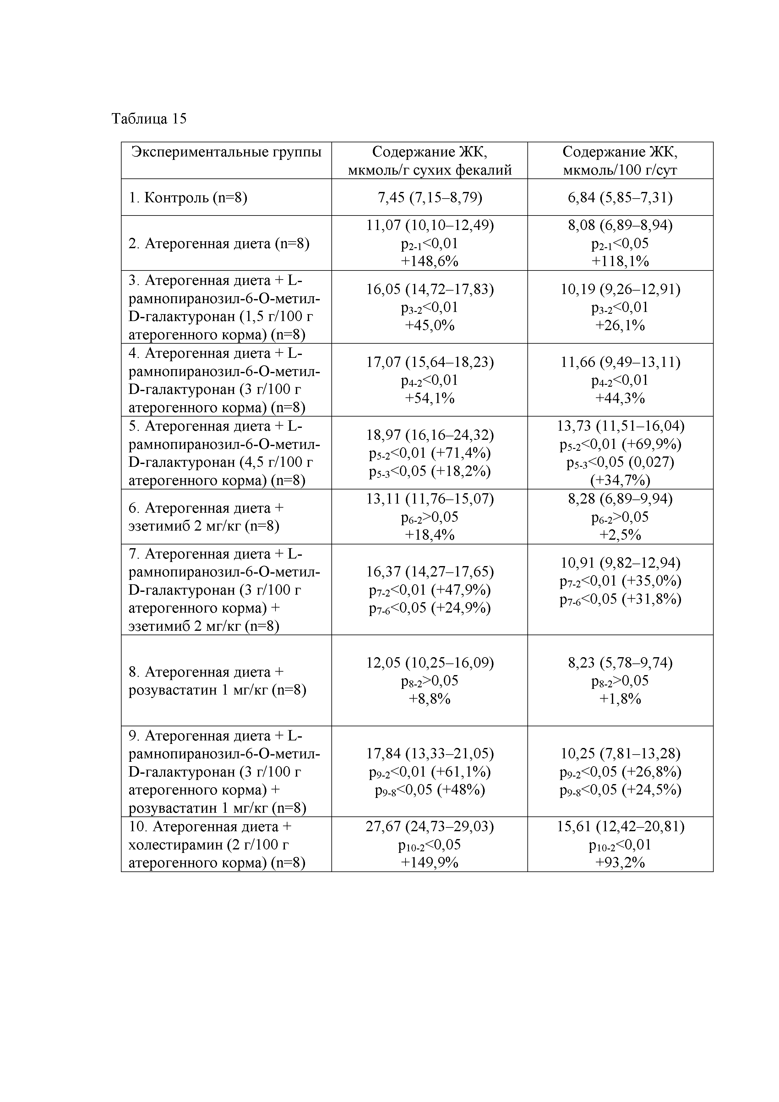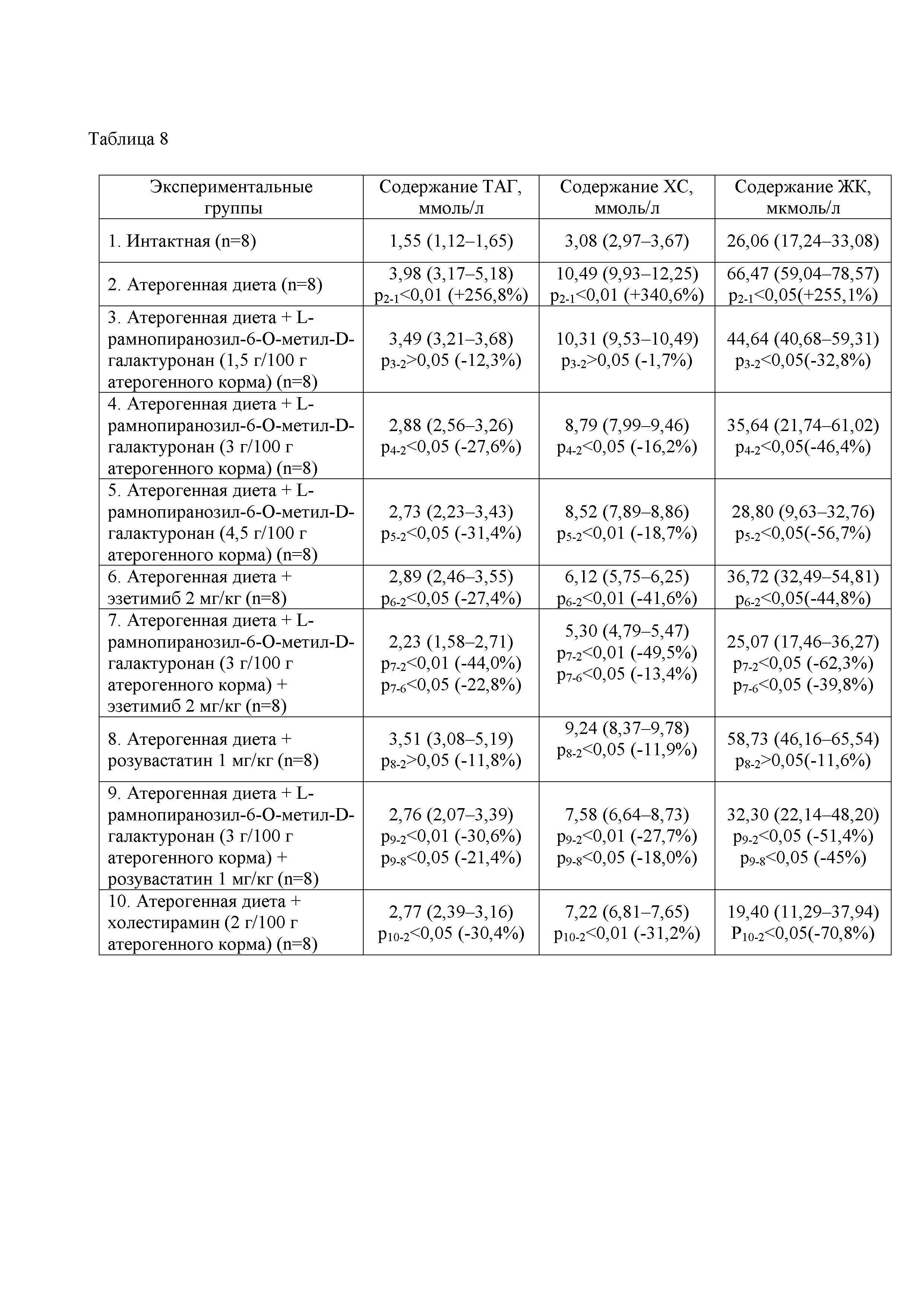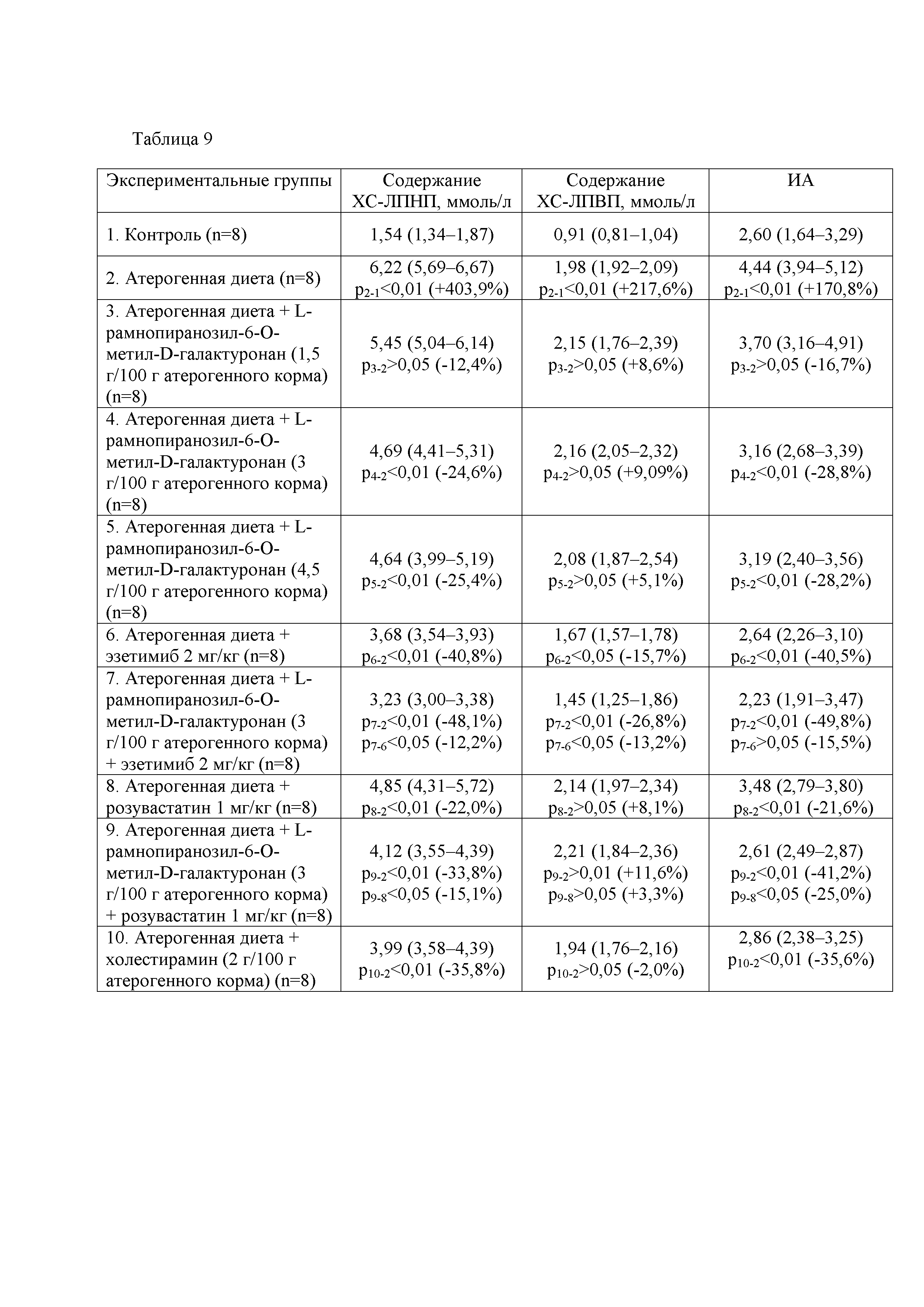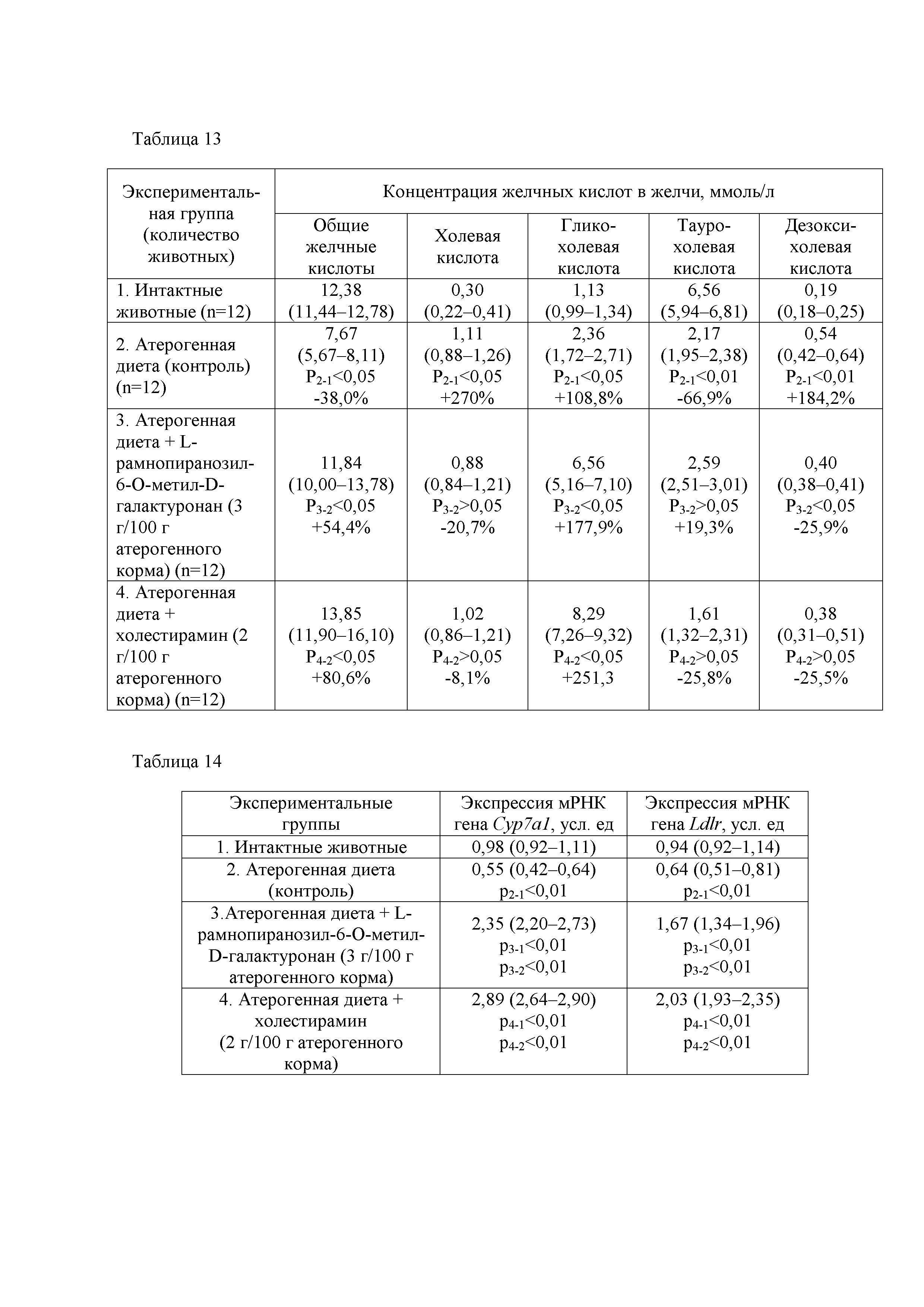 Изобретение относится к биологически активным соединениям, используемым в медицине и фармацевтической промышленности. Объектом изобретения является применение L-рамнопиранозил-6-О-метил-D-галактуронана в качестве гиполипидемического и гипохолестеринемического средства. В частных случаях L-рамнопиранозил-6-О-метил-D-галактуронан может быть выделен из листьев березы повислой (); может применяться в качестве средства, снижающего уровень холестерина; может применяться для терапии гиперхолестеринемий в комбинации с ингибиторами ГМГ-КоА редуктазы (статинами) или в комбинации с блокаторами белка-транспортера холестерина в кишечнике (эзетимибом). Изобретение обеспечивает расширение арсенала гиполипидемических и гипохолестеринемических средств. 4 з.п. ф-лы, 1 ил., 15 табл.