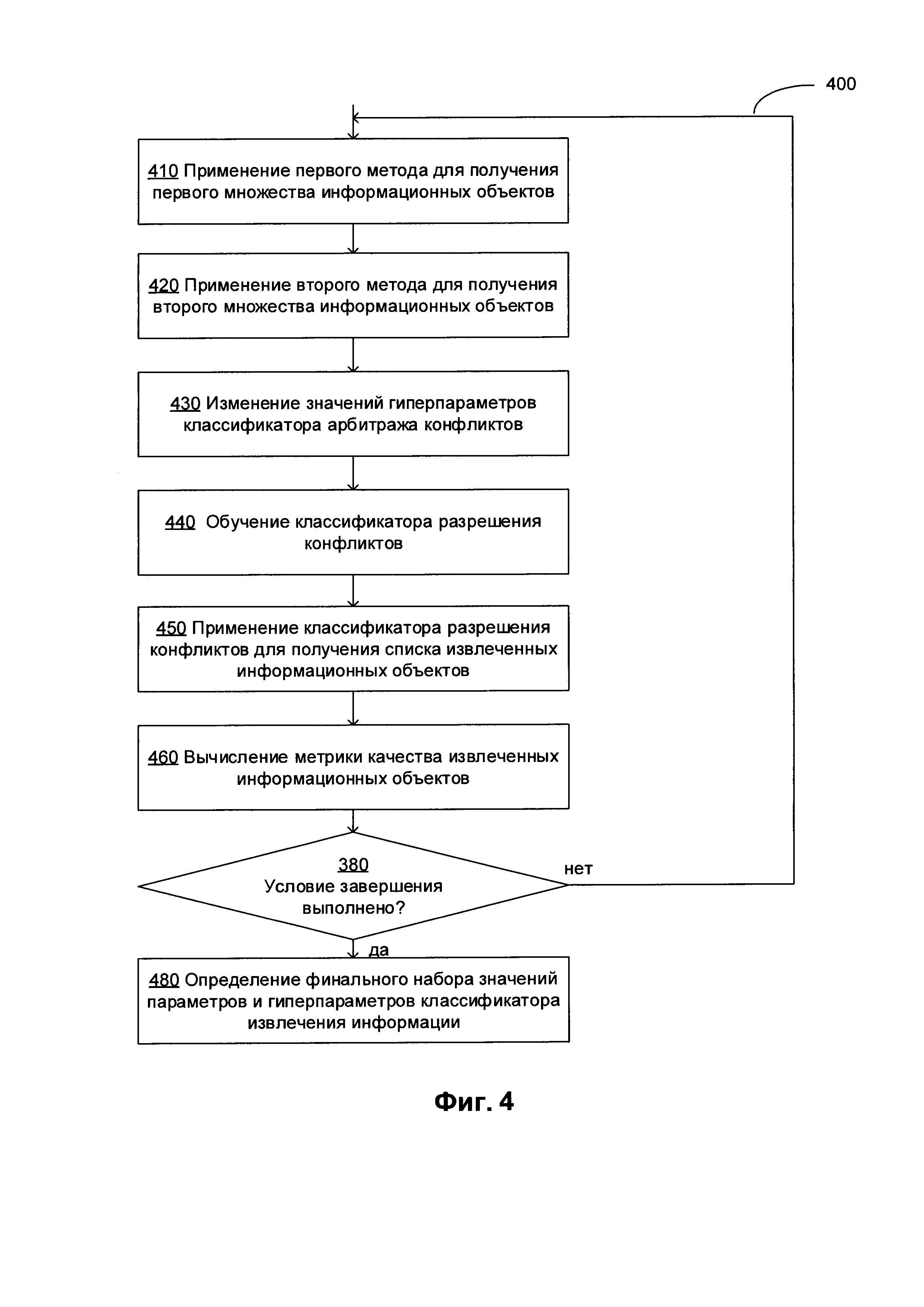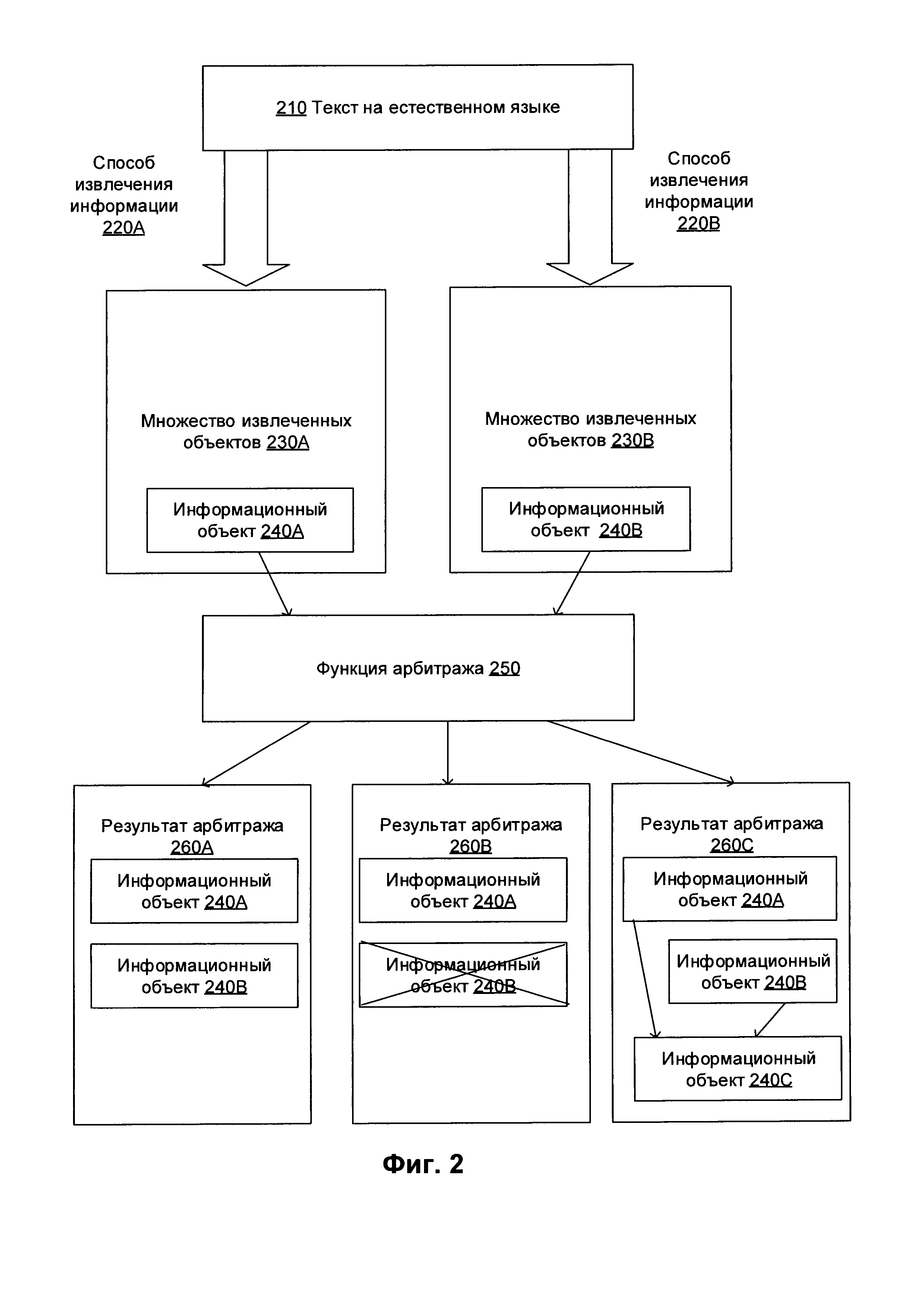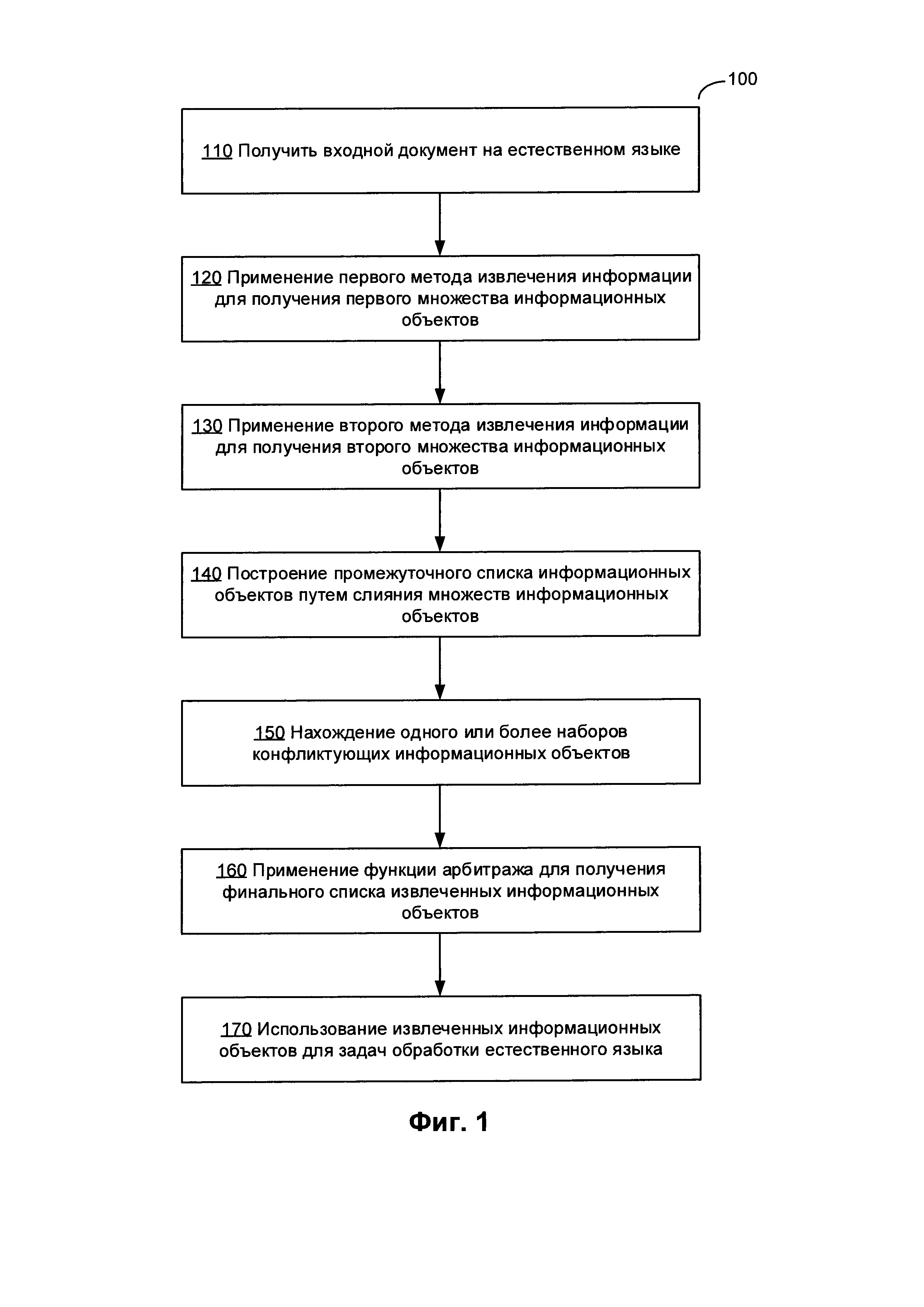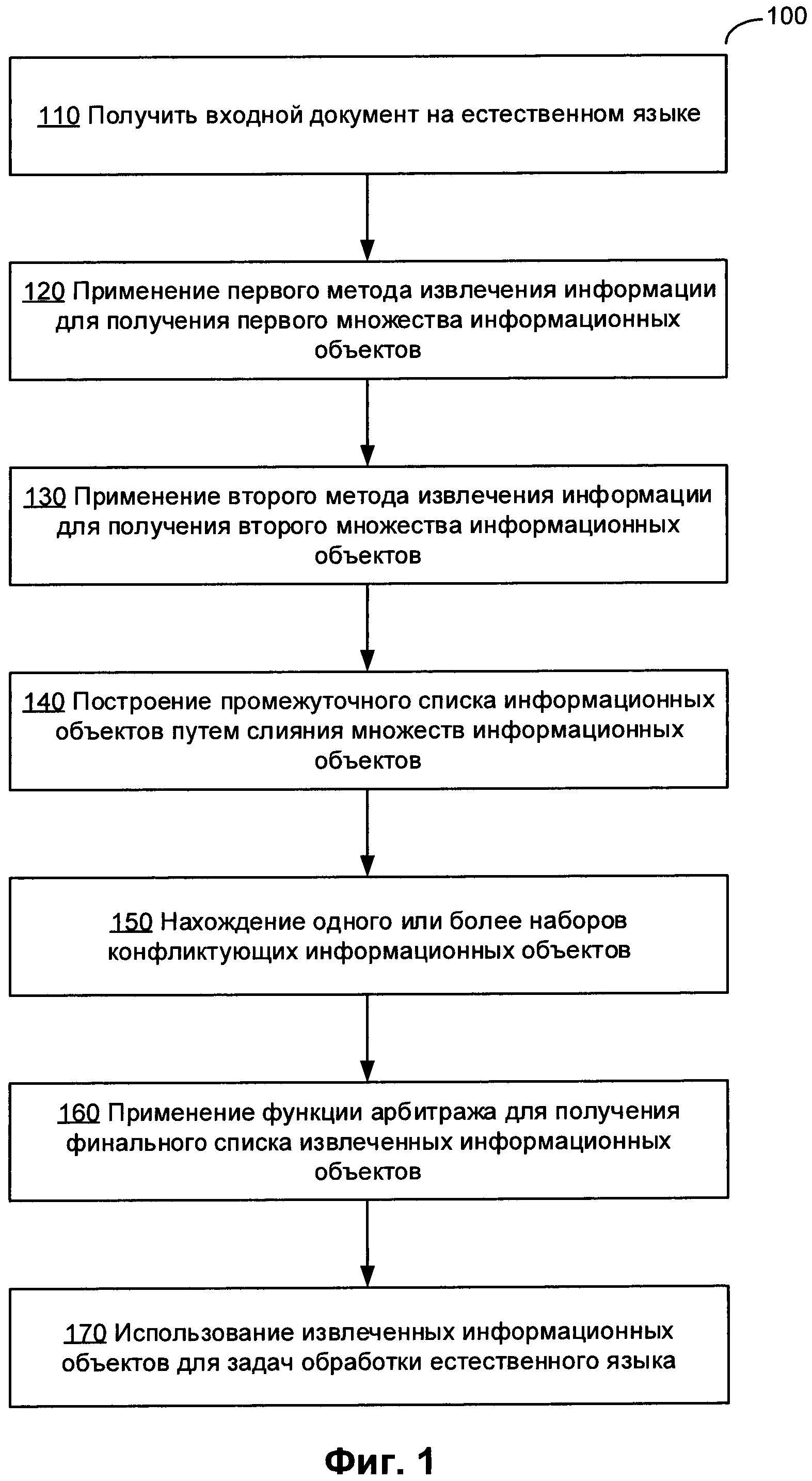 Изобретение относится к средствам извлечения фактов из текстов на естественных языках. Технический результат заключается в повышении эффективности и качества извлечения информации. Извлекают из текста на естественном языке первое множество информационных объектов. Извлекают из текста на естественном языке второе множество информационных объектов. Создают промежуточный перечень информационных объектов, включающий по меньшей мере подмножество первого множества информационных объектов и по меньшей мере подмножество второго множества информационных объектов. Выявляют в промежуточном перечне информационных объектов множества конфликтующих информационных объектов, в котором первый информационный объект из множества конфликтующих информационных объектов принадлежит первому множеству информационных объектов, а второй информационный объект из множества конфликтующих информационных объектов принадлежит второму множеству информационных объектов. Создают окончательный перечень информационных объектов, извлеченных из текста на естественном языке, путем применения к множеству конфликтующих информационных объектов функции «арбитража» конфликтующих объектов, которая выполняет по меньшей мере одно из следующих действий: изменение первого информационного объекта, удаление первого информационного объекта или слияние двух и более информационных объектов из множества конфликтующих информационных объектов. 3 н. и 17 з.п. ф-лы, 16 ил.