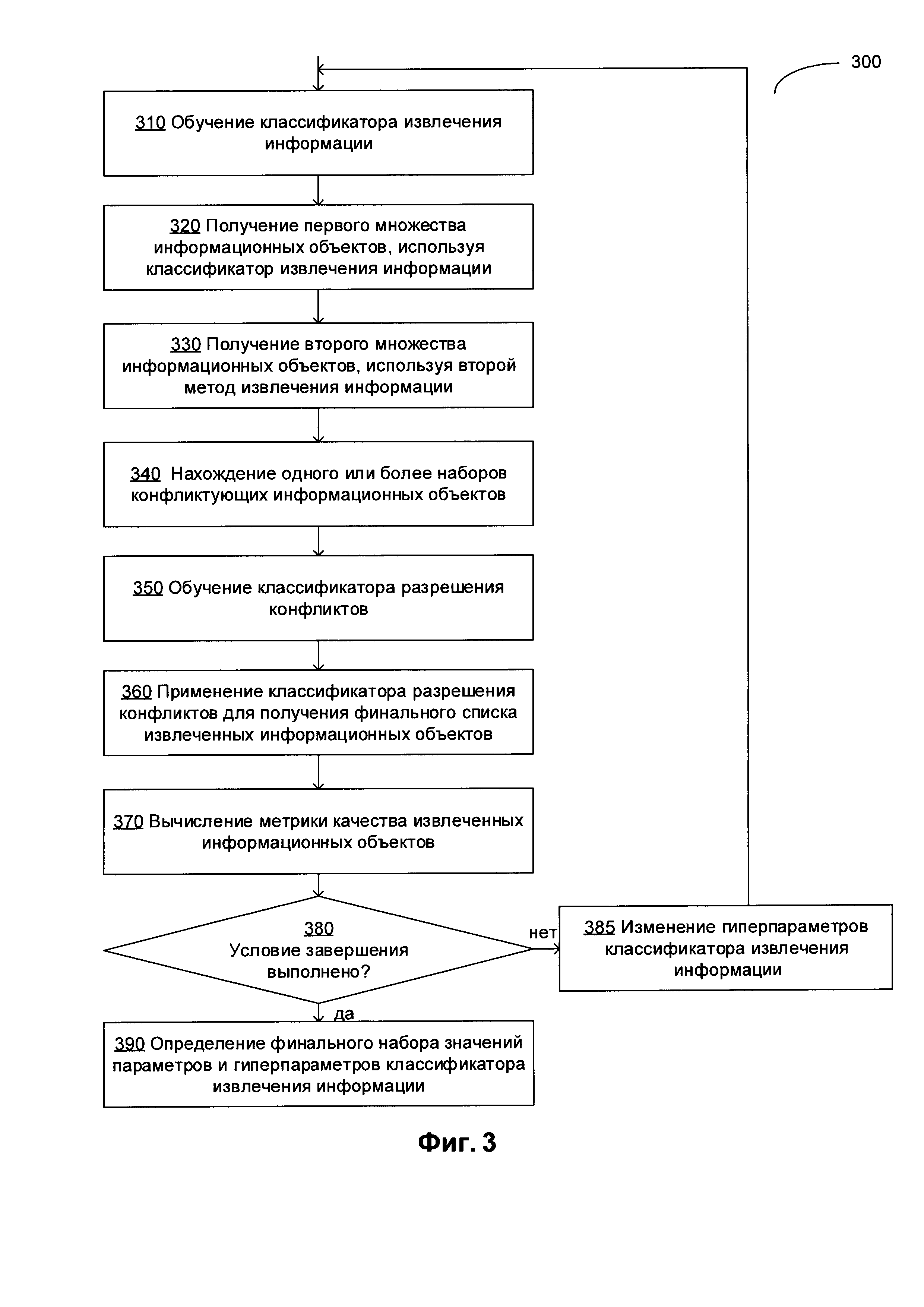 ОБЛАСТЬ ТЕХНИКИ [0001] Настоящее изобретение в целом относится к вычислительным системам, а точнее - к системам и способам обработки естественного языка. УРОВЕНЬ ТЕХНИКИ [0002] Извлечение информации может включать анализ текста на естественном языке для выявления и классификации информационных объектов в соответствии с заданным множеством категорий (например, имена лиц, организаций, мест, выражения времени, количества, денежных сумм, процентов и т.д.). Извлечение информации может дополнительно включать определение отношений между распознанными именованными сущностями и (или) информационными объектами. РАСКРЫТИЕ ИЗОБРЕТЕНИЯ [0003] В соответствии с одним или более вариантами реализации настоящего изобретения пример способа извлечения информации из текста на естественном языке может включать: извлечение вычислительной системой первого множества информационных объектов из текста на естественном языке; извлечение из текста на естественном языке второго множества информационных объектов; создание промежуточного перечня информационных объектов, включающего по меньшей мере подмножество первого множества информационных объектов и по меньшей мере подмножество второго множества информационных объектов; выявление в промежуточном перечне информационных объектов множества конфликтующих информационных объектов, в котором первый информационный объект из множества конфликтующих информационных объектов принадлежит первому множеству информационных объектов, а второй информационный объект из множества конфликтующих информационных объектов принадлежит второму множеству информационных объектов; и создание окончательного перечня информационных объектов, извлеченных из текста на естественном языке путем применения к множеству конфликтующих информационных объектов функции «арбитража» конфликтующих объектов, которая выполняет по меньшей мере одно из следующих действий: изменение первого информационного объекта, удаление первого информационного объекта или слияние двух и более информационных объектов из множества конфликтующих информационных объектов. [0004] В соответствии с одним или более вариантами реализации настоящего изобретения пример системы извлечения информации из текста на естественном языке может включать: память; процессор, связанный с указанной памятью, причем этот процессор выполнен с возможностью: извлечения из текста на естественном языке первого множества информационных объектов; извлечения из текста на естественном языке второго множества информационных объектов; создания промежуточного перечня информационных объектов, включающего по меньшей мере подмножество первого множества информационных объектов и по меньшей мере подмножество второго множества информационных объектов; выявления в промежуточном перечне информационных объектов множества конфликтующих информационных объектов, в котором первый информационный объект из множества конфликтующих информационных объектов принадлежит к первому множеству информационных объектов, а второй информационный объект из множества конфликтующих информационных объектов принадлежит ко второму множеству информационных объектов; и создания окончательного перечня информационных объектов, извлеченных из текста на естественном языке, за с