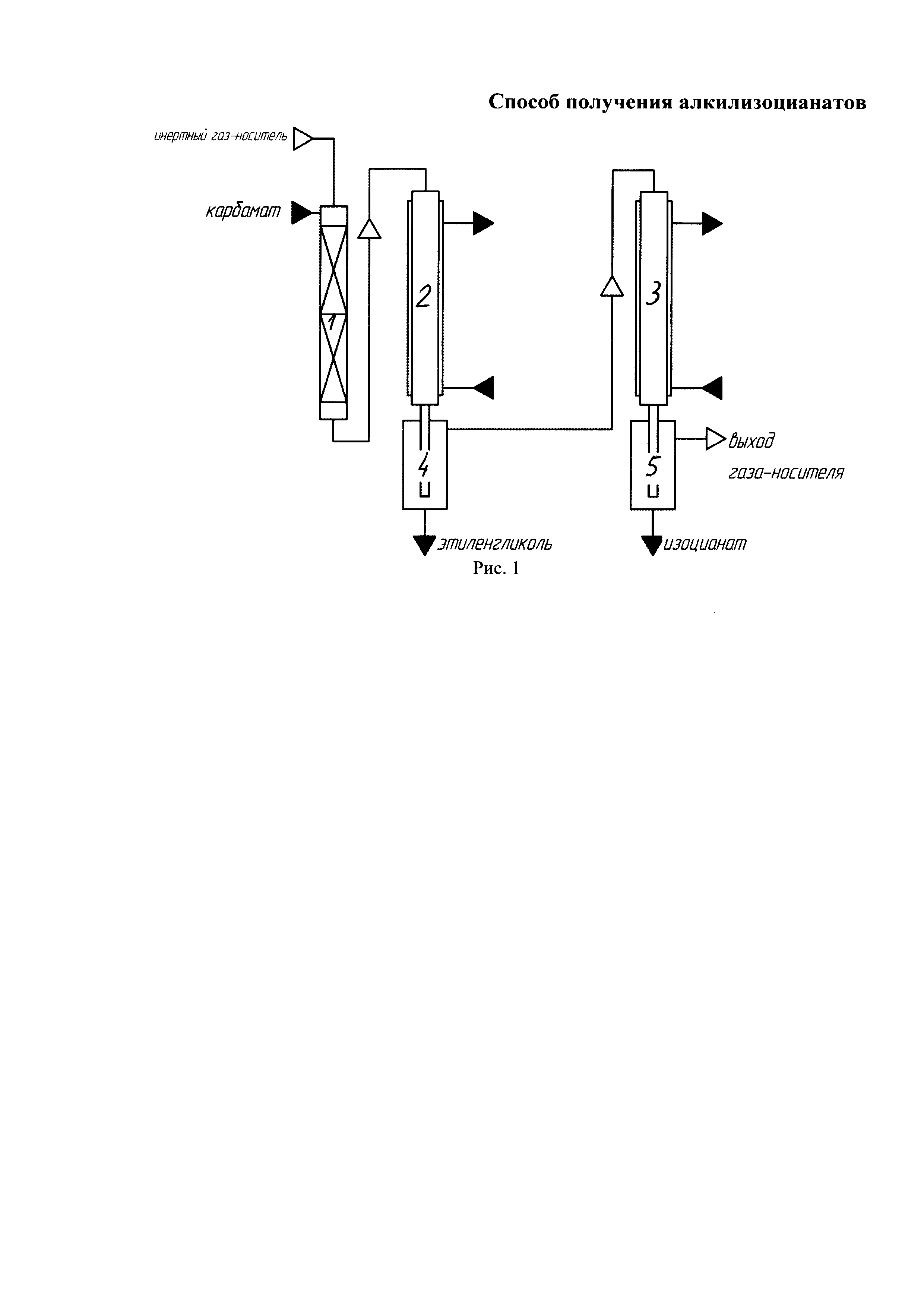 Способ получения алкилизоцианатов общей формулы I где R - алкильные группы нормального, разветвленного или циклического строения с числом атомов углерода от 1 до 8, заключающийся в том, что в насадочной колонне при непрерывной подаче соответствующего O-(2-гидроксиэтил)карбамата и инертного газа-носителя в верхнюю часть колонны осуществляют термолиз при 200-450°C с последующей фракционной конденсацией полученных целевого и побочного продуктов.