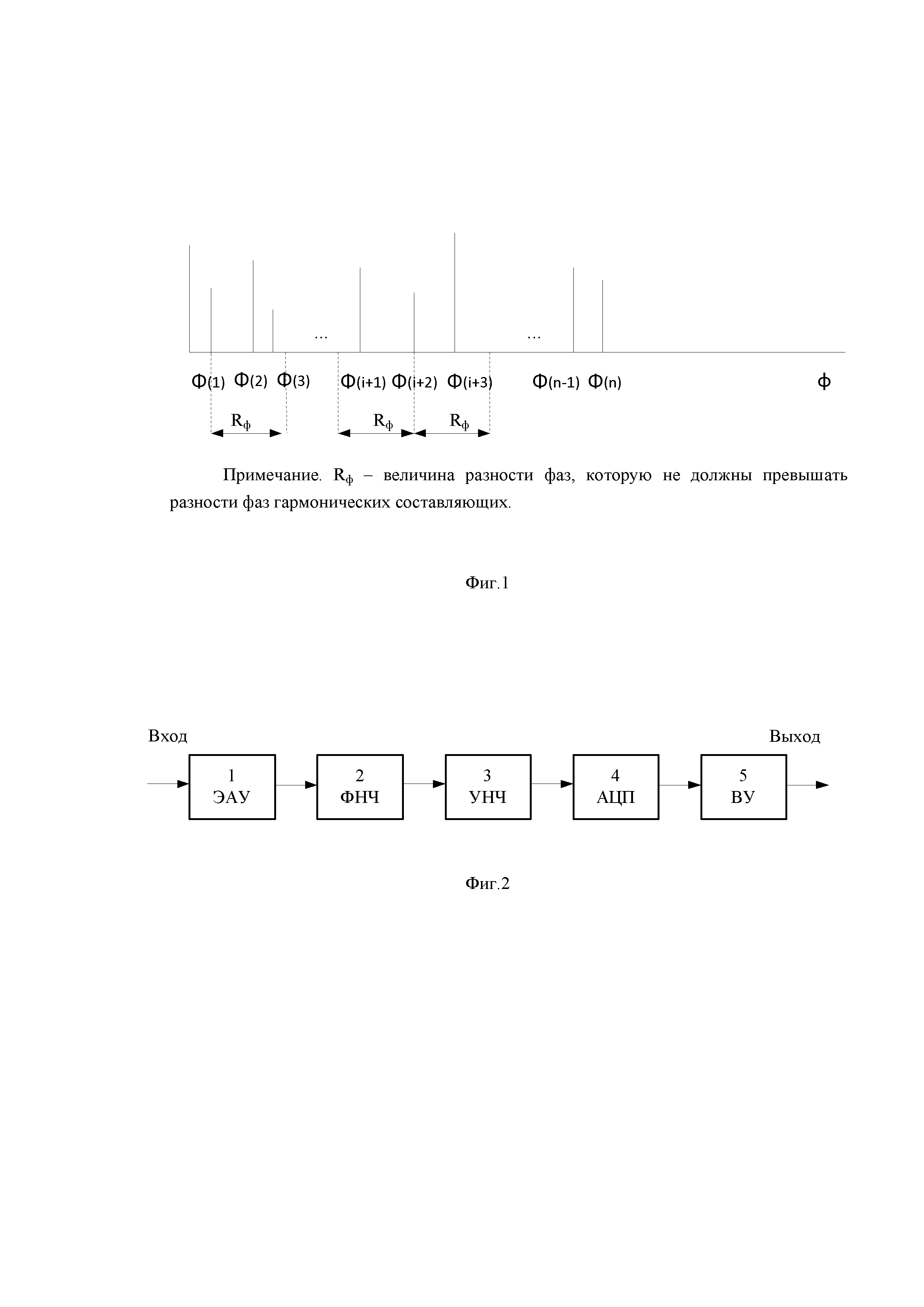 Способ разделения речи и речеподобного шума, заключающийся в том, что на всем интервале анализа, состоящего из интервала, который не содержит речевой сигнал, и интервала, который содержит смесь речевого сигнала и шума, шум или смесь речевого сигнала и шума, которые поступают в систему, дискретизируют и заносят в память для последующей обработки, отличающийся тем, что предварительно устанавливают пороговые значения для разностей фаз частотных составляющих и для кратковременной энергии речевых сигналов, обеспечивающих заданный уровень правильного обнаружения речевого сигнала; «скользящее окно» – интервал заданной длительности, формируют так, что в нем присутствует только шум; методом спектрального анализа определяют значения частот, фаз и амплитуд гармонических составляющих шума; смещают «скользящее окно» на величину шага смещения, значение которого определяют заранее; методом спектрального анализа определяют значения частот, фаз и амплитуд гармонических составляющих шума или смеси сигнала и шума; рассчитывают значения отсчетов огибающей шума для текущего положения «скользящего окна», с использованием результатов спектрального анализа, который был проведен для предыдущего положения «скользящего окна», из последовательности отсчетов, которые были взяты для текущего положения «скользящего окна», вычитают рассчитанные значения амплитуды шума, определяют абсолютные значения полученных разностей; рассчитывают количество превышений абсолютными значениями разностей отсчетов порога, значение которого определяют заранее, если это количество не превышает порог, то считают, что в «скользящем окне» присутствует только шум; описанную процедуру повторяют до тех пор, пока при очередном смещении «скользящего окна» на величину шага смещения количество превышений порога рассчитанными абсолютными значениями разностей отсчетов не превысит пороговое значение; в группу анализируемых составляющих включают составляющие, для которых абсолютные значения разностей отсчетов превысили порог, значения амплитуд этих составляющих равны значениям разности отсчетов; выделяют группы гармонических составляющих из анализируемых, в которые включают составляющие по следующему алгоритму: рассчитывают значения попарных разностей фаз первой гармоники и остальных гармоник; в первую группу включают первую гармонику и гармоники, для которых значения разностей фаз не превышают заданное значение – пороговое значение для значения разностей фаз; затем данную процедуру повторяют для всех остальных гармоник; если число таких групп равно нулю, то принимают решение, что присутствует только шум; смещают «скользящее окно» на величину шага смещения и описанную процедуру повторяют; если на очередном шаге число таких групп становится больше нуля, то для каждой группы рассчитывают кратковременную энергию всех гармоник группы, из рассчитанных значений находят максимальное значение, которое сравнивают с порогом; если максимальное значение кратковременной энергии группы не превышает пороговое значение, то принимают решение, что присутствует только шум; смещают «скользящее окно» на величину шага смещения и описанную процедуру повторяют; если на очередном шаге порог будет превышен хотя бы для одной группы, то считают, что группа с макси