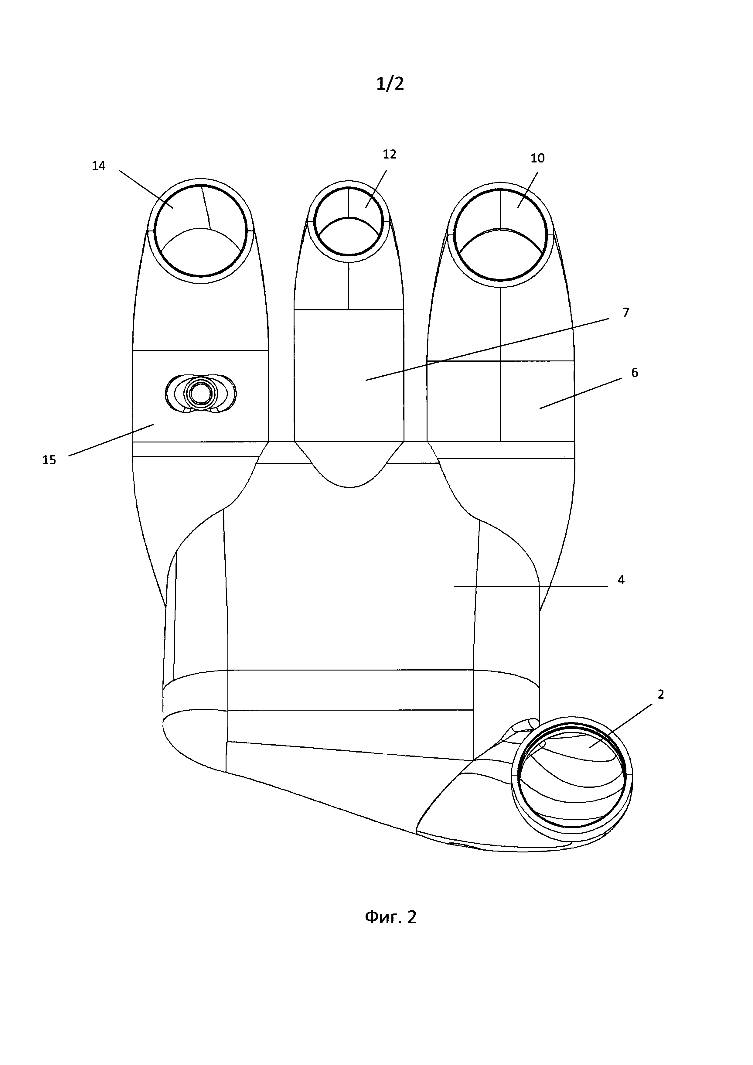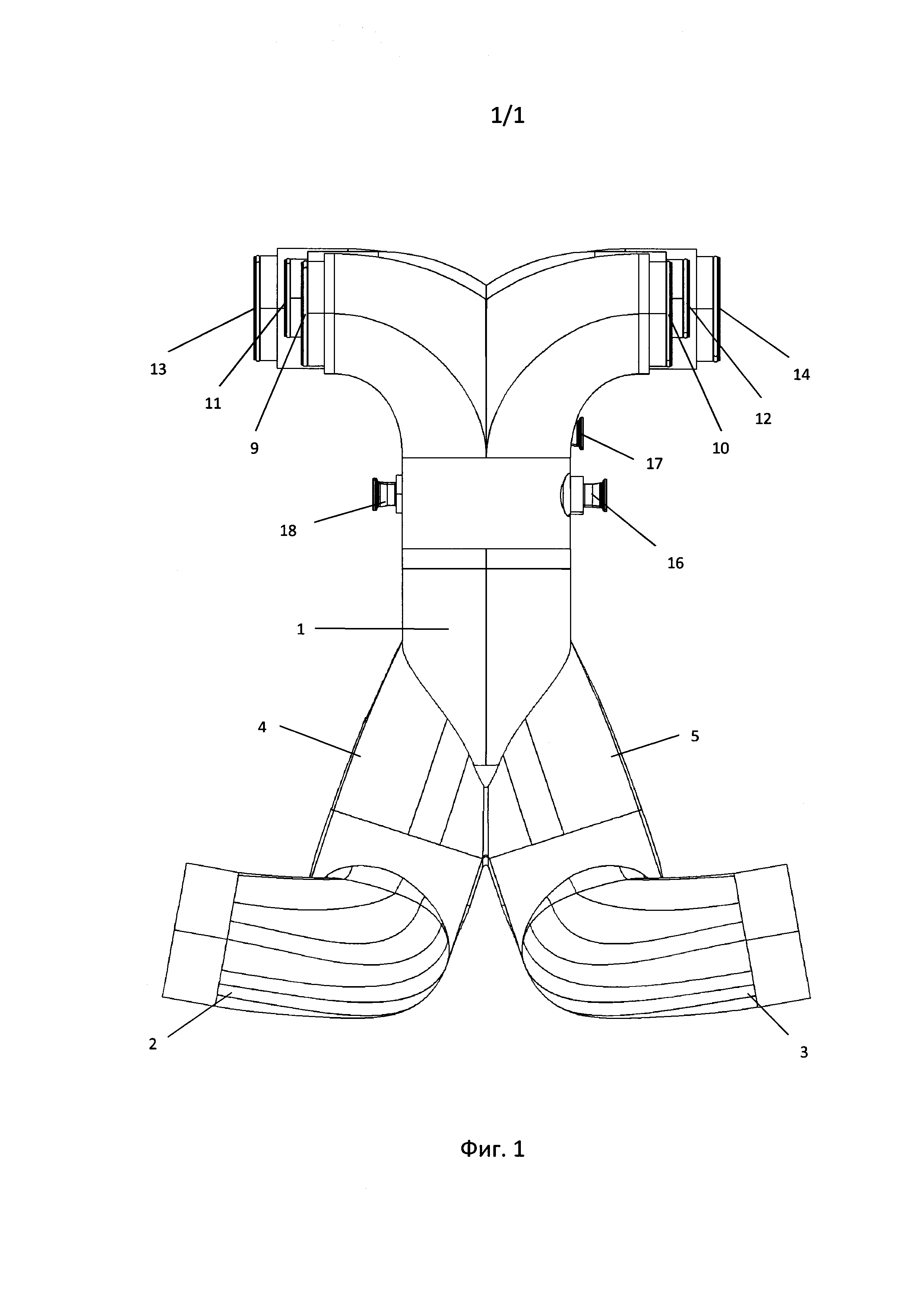 Область техники Способ вентиляции пассажирского салона самолета и смеситель-распределитель воздуха относится к группе изобретений с особенностями устройств для обработки воздуха в помещениях для экипажа, пассажиров или в грузовых отсеках самолета. Преимущественной областью применения изобретений являются средства обеспечения комфортного воздухообмена в отсеках пассажирского салона при использовании рециркуляции воздуха. Уровень техники Аналоги патентуемого способа вентиляции пассажирского салона самолета в общедоступных источниках информации отсутствуют. Смеситель воздуха по патенту РФ №2428245 (B01F 5/06) может быть использован в вентиляционной системе воздушного судна и содержит (в терминах описания к патенту) впуск свежего воздуха, тело для подачи нагретого воздуха и выпуск смешанного воздуха для выпуска смеси свежего и нагретого воздуха. Тело для подачи нагретого воздуха содержит первую часть и вторую часть, создающие сопротивление потоку свежего воздуха. Вторая часть выполнена в виде замкнутого полого тела с множеством отверстий для подачи нагретого воздуха и соединена с первой частью в области ее конца, нижнего по потоку нагретого воздуха. Первая часть тела для подачи нагретого воздуха имеет обтекаемую форму. Смеситель воздуха по патенту №2428245 не предусматривает смешение свежего воздуха от более чем одного источника и не может быть использован для распределения смеси по нескольким отсекам самолета. Смеситель воздуха системы вентиляция пассажирского салона самолета (изображения по запросу «Рециркуляционная вентиляция пассажирского салона самолета» в Интернете, прилагается) содержит патрубки ввода циркуляционного воздуха из салона и свежего воздуха, а также выходные патрубки для подачи образовавшейся смеси. Такой смеситель сложен и не обеспечивает эффективного смешения и распределения воздуха. В качестве ближайшего аналога патентуемого способа вентиляции пассажирского салона самолета и смесителя-распределителя воздуха приняты технические решения, раскрытые в описании изобретения по патенту РФ №2433067 (B64D 13/06). Смеситель-распределитель воздуха, раскрытый в описании изобретения по патенту №2433067, так же, как и смеситель-распределитель воздуха по настоящей заявке, содержит корпус, патрубки для ввода в него воздуха из пассажирского салона и кондиционированного воздуха от компрессоров двух двигателей и патрубки для подачи образовавшейся смеси воздуха в отсеки пассажирского салона. В смесителе-распределителе воздуха по патенту №2433067 отсутствуют средства обеспечения эффективного смешения и распределения воздуха. Раскрытие сущности изобретения Изобретение решает задачу повышения эффективности вентиляции отсеков пассажирского салона. Сущность изобретения как технического решения, относящегося к способу вентиляции отсеков пассажирского салона самолета, решает задачу в результате того, что рециркуляционный воздух из пассажирского салона очищают и каждым из двух потоков предварительно смешивают с соответствующими потоками свежего кондиционированного воздуха, затем смешанные потоки воздуха порознь закручивают в противоположных направлениях, после чего закрученные потоки под небольшим углом между ними смешивают и разделяют образовавшуюся смесь на выходные потоки, которые подают в отс