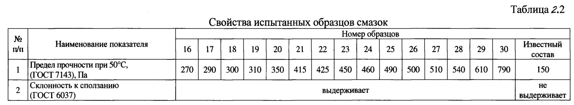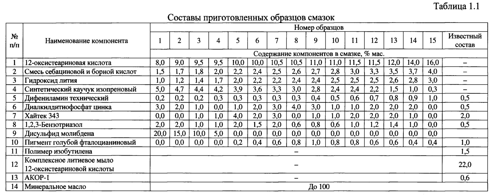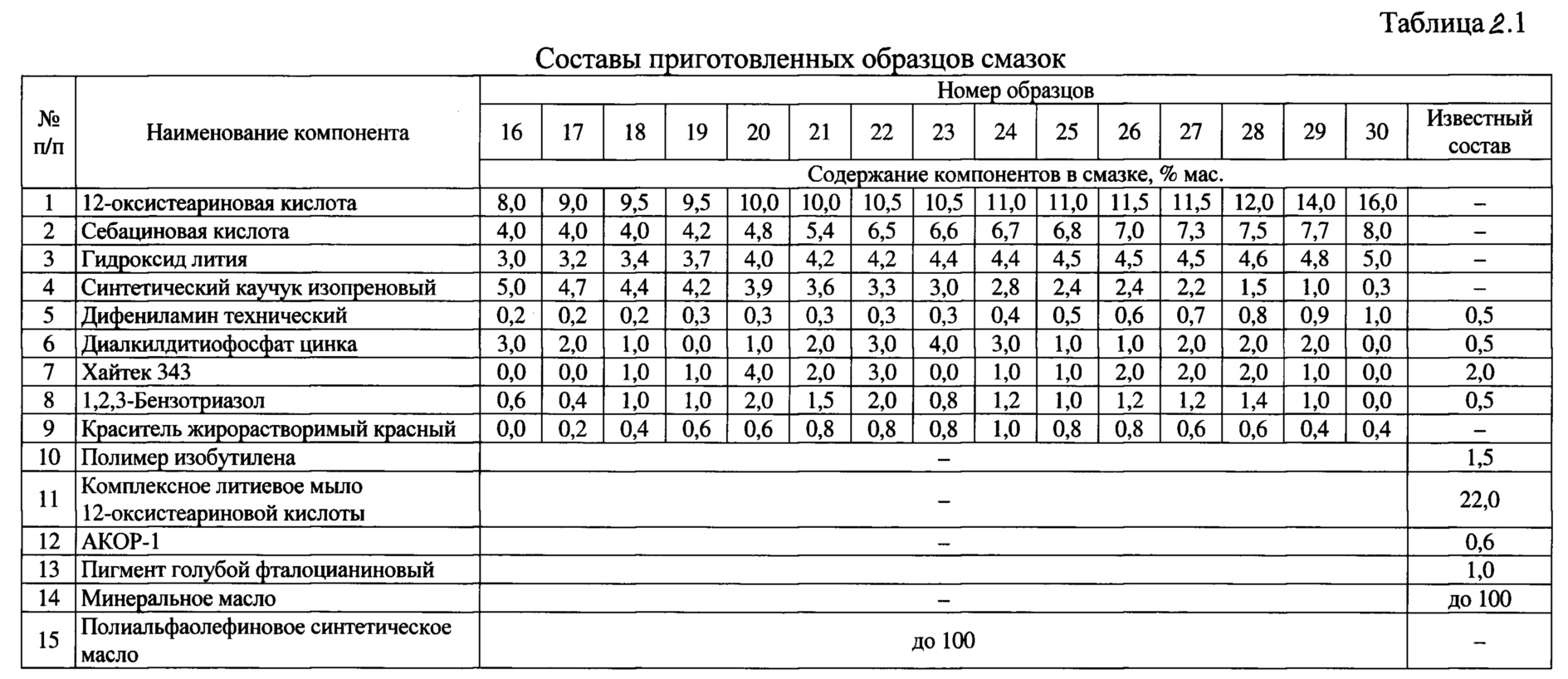 Изобретение относится к созданию многоцелевой комплексной пластичной смазки с широким диапазоном рабочих температур для различных узлов трения мобильной техники и стационарного оборудования. Известна пластичная смазка (RU 1780316 С2), содержащая, мас. %: Данная смазка используется для узлов трения бумагоделательного оборудования. Техническим результатом является улучшение работоспособности смазки при повышенных температурах, нагрузках и влажности. Недостатками данного состава являются неудовлетворительные низкотемпературные свойства и невысокие противозадирные характеристики. Известна пластичная смазка (RU 2217483 C1), содержащая, мас. %: Данная смазка эксплуатируется в конических подшипниках качения буксовых узлов кассетного типа грузовых и пассажирских вагонов. Техническим результатом являются улучшенные низкотемпературные, противоизносные и антикоррозионные свойства. Недостатками данного состава являются низкая коллоидная стабильность, невысокие противозадирные характеристики и плохая адгезия к металлам. Известна пластичная смазка (RU 2483100 С1), содержащая, мас. %: Техническим результатом является обеспечение высокой температуры каплепадения. Недостатками данного состава являются низкая механическая и коллоидная стабильность, невысокие трибологические характеристики и плохая адгезия с металлами. Наиболее близкой к предложенной является пластичная смазка RU 2627766 С1, содержащая, мас. %: Данный продукт может быть использован как многоцелевая универсальная высокотемпературная смазка, предназначенная для применения в узлах трения нагруженного промышленного оборудования, современных транспортных средств, промышленного, строительного и судового оборудования, работающего при температуре от минус 35°С до 160°С. Недостатками данного состава являются низкий предел прочности при повышенных температурах и невысокая адгезия к металлическим поверхностям. Задачей настоящего изобретения является получение композиции многоцелевой высокотемпературной пластичной смазки с увеличенным пределом прочности при повышенных температурах и улучшенной адгезией к металлам. Техническим результатом изобретения является увеличение предела прочности при повышенных температурах и снижение склонности к сползанию с металлических поверхностей. Указанная проблема решается пластичной смазкой, содержащей загуститель на основе комплексного литиевого мыла 12-оксистеариновой кислоты и комплексообразователя, полимерного модификатора структуры, комплекса функциональных присадок, наполнителей и красителей, минерального или синтетического базового масла. Композиция пластичной смазки представлена следующим соотношением компонентов, мас. %: Отличительной особенностью заявленной композиции является совместное использование загустителя на основе комплексного литиевого мыла 12-оксистеариновой кислоты и комплексообразователя, обеспечивающего работоспособность смазки при температурах до 180°С, и полимерного модификатора структуры, содержащего свободную двойную связь и обеспечивающего улучшение вязкостно-температурных характеристик базового масла и увеличение предела прочности смазки при повышенных температурах. Также полимерный модификатор способствует улучшению адгезионных свойств заявленной композиции за счет формиров