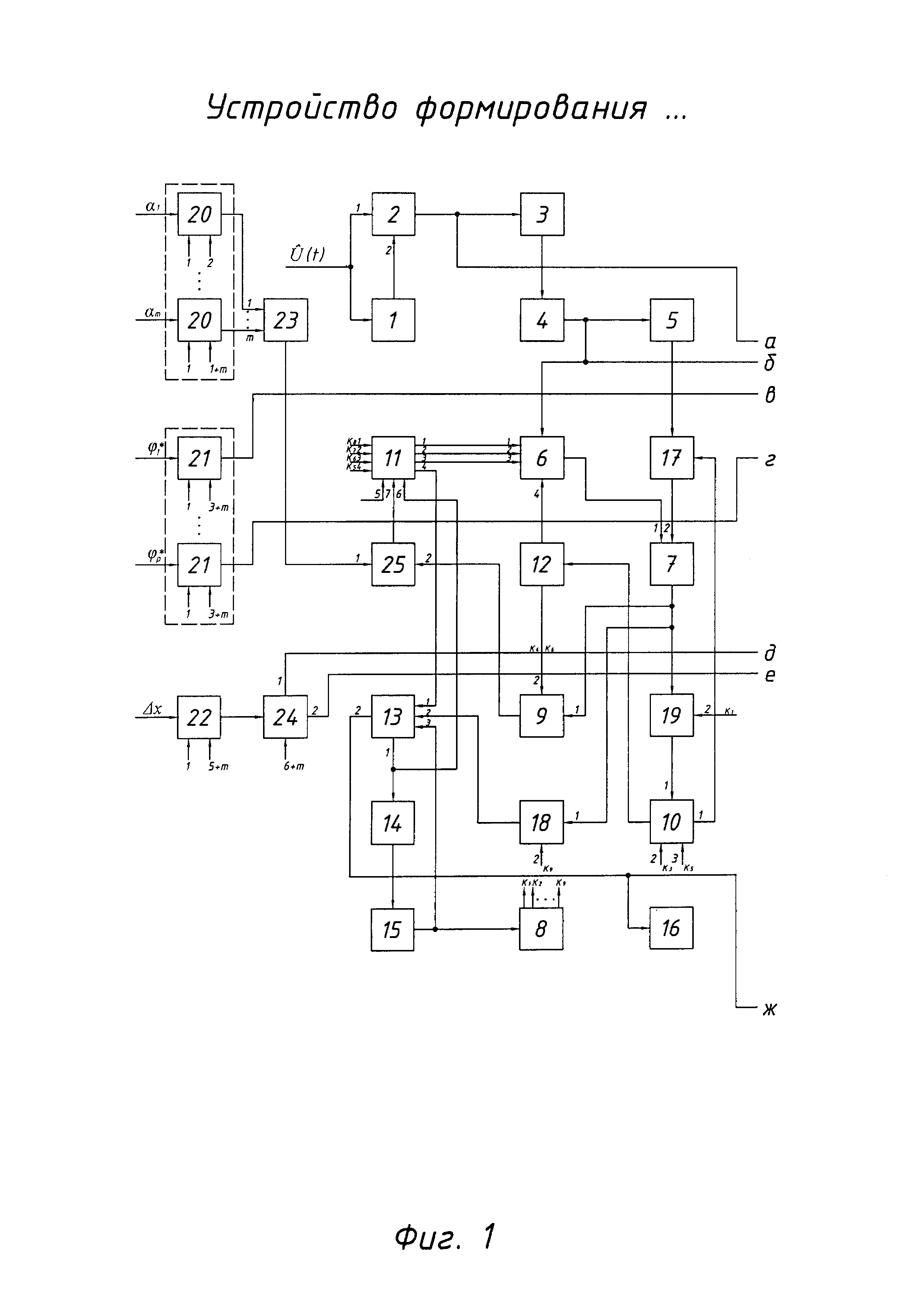 Устройство формирования оптимальных управляющих воздействий для обеспечения устойчивой работы сложных технических систем, содержащее коррелятор и анализатор случайного процесса, первый вход которого соединен с входом устройства, а второй вход - с выходом коррелятора, вход которого соединен с входом устройства, последовательно соединенные вычислительный блок, вход которого подключен к выходу анализатора случайного процесса, блок возведения в степень и блок транспортирования матриц, блок управления, первый сумматор, блок памяти, блок произведения, блок обращения матриц, регистратор, три элемента И, три элемента ИЛИ, блок формирования матриц, второй сумматор и первый блок сравнения, четыре входа блока памяти соединены соответственно с соответствующими выходами блока управления, пятый вход - с входом устройства, шестой вход - с первым выходом второго сумматора, с первого по третий выходы через первый элемент ИЛИ - с первым входом блока произведения, а четвертый выход - с первым входом второго сумматора, второй вход которого через второй элемент И соединен с выходом блока произведения, соединенным через третий элемент И с первым входом блока формирования матриц, первый выход которого соединен с первым входом второго элемента ИЛИ, а второй выход - через блок обращения матриц с четвертым входом первого элемента ИЛИ, третий вход второго сумматора соединен с выходом первого блока сравнения, выходы блока управления соединены со вторыми входами первого, второго и третьего элементов И и со вторым и третьим входами блока формирования матриц, а вход - с выходом первого блока сравнения, вход которого соединен через первый сумматор с первым выходом второго сумматора, второй выход которого соединен с регистратором, вход блока транспортирования матриц соединен с пятым входом первого элемента ИЛИ, а выход - со вторым входом второго элемента ИЛИ, подключенного выходом к второму входу блока произведения, первую и вторую группы входных регистров, первая из которых состоит из m элементов, а вторая из Р элементов, первый входной регистр, коммутатор, блок умножения, первую группу блоков вычитания, первую и вторую группы квадраторов, первую и вторую группы блоков умножения, первую группу элементов ИЛИ, каждая из которых состоит из Р элементов, первый и второй накопительные сумматоры, первый и второй блоки извлечения квадратного корня, первый элемент задержки (ЭЗ), первый блок деления, первую группу регистров, группу коммутаторов, первую группу блоков индикации, каждая из которых состоит из m×р элементов, блок оценки минимального значения, вторую групп регистров, первую группу блоков сравнения, первую группу ЭЗ, вторую группу блоков индикации, каждая из которых состоит из m элементов, генератор тактовых импульсов и распределитель импульсов, тактовый вход которого соединен с выходом генератора тактовых импульсов, первый выход - с входами записи каждого элемента первой и второй группы входных регистров и входом записи первого входного регистра, со второго по 1+m-й выходы - с входами считывания с первого по m-й элементы первой группы входных регистров, 2+m-й выход - с входом записи каждого элемента первого столбца первой группы регистров, 3+m-й выход - с входом считывания каждого элемента второй группы входных регистров, 4+m-й выход - с управляющим в