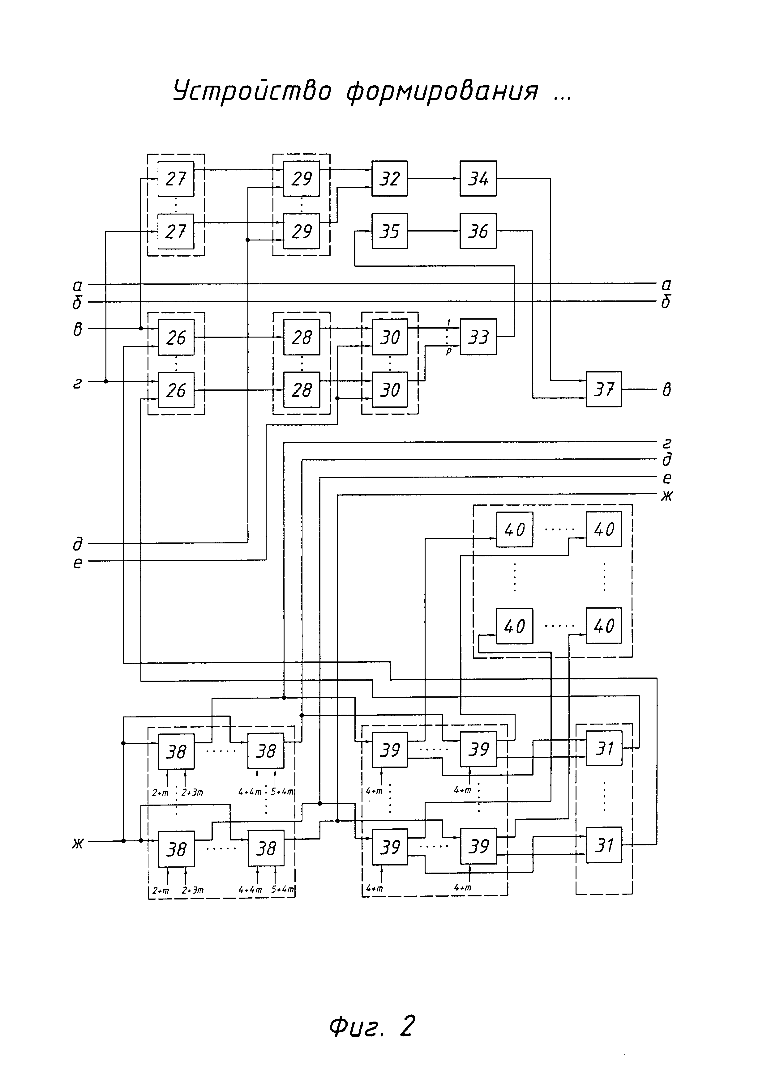 с выходов элементов этой группы направляются на входы уменьшаемого соответствующих элементов группы 26 блоков вычитания и на входы первой группы 27 квадраторов. По сигналу с 5+m-го выхода РИ 47 на вход считывания входного регистра 22 величина Δх поступает через коммутатор 24 на вторые входы первой группы 29 блоков умножения и на первые входы второй группы 30 блоков вычитания. По сигналу с 2+3m-го выхода РИ 47 на входы считывания первой группы 38 регистров значения