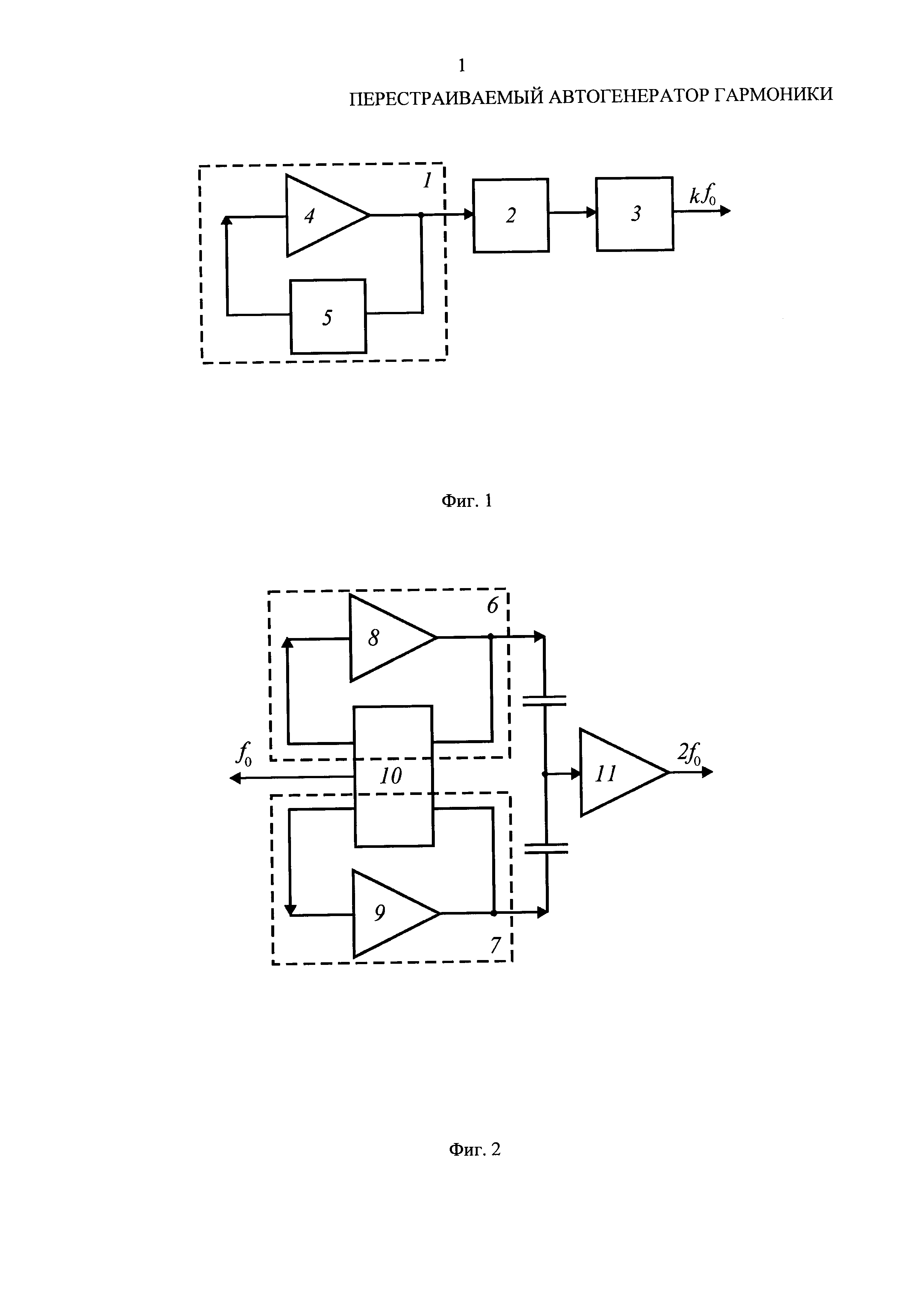 Предлагаемое устройство относится к области радиотехники и может быть использовано в различной приемо-передающей радиоаппаратуре, работающей вплоть до СВЧ диапазона. В частности, это устройство относится к СВЧ генераторам, управляемым напряжением (ГУН), которые одновременно формируют колебания основной частоты и частоты k-ой гармоники и предназначены для работы в современных синтезаторах частот. Известен автогенератор гармоники СВЧ (См. Малышев, В.А. Автогенератор гармоники СВЧ / В.А. Малышев, С.П. Бровченко // Авторское свидетельство СССР № SU 1054864 А. - Опубл. 15.11.83 в БИ №42). Данное устройство, блок-схема которого изображено на фиг. 1, состоит из автогенератора (АГ) 1 на транзисторе, включенного по схеме с общей базой, фильтра холостого хода (ФХХ) 2 и фильтра выделяемой гармоники (ФВГ) 3. Автогенератор 1 представлен в виде обобщенной схемы, содержащей активный 4 и пассивный 5 элементы, которые описывается комплексными коэффициентами передачи G(jω) и H1(jω). Нелинейный режим работы АГ приводит к генерации колебаний основной частоты и ее гармоник. По отношению к выходной мощности основного («несущего») колебания типовые уровни мощностей второй и третьей гармоник обычно находятся в пределах - (10-20) и - (20-35) дБн, соответственно (См., например, фиг. 5-28 и 5-29 в [1]). В данном устройстве реализуется режим «холостого хода» по основной частоте ƒ0, а при помощи фильтра ФВГ выделяется выходная мощность k-ой гармоники - kƒ0. Применение фильтра 3 приводит здесь к повышению выходной мощности гармоники на (30 - 40)%, так как при наличии ненагруженного контура в коллекторной цепи транзистора происходит не только прямое, но и промежуточное преобразование мощности первой гармоники в мощность выделяемой гармоники. Недостатком данного аналога является относительно невысокий уровень мощности выделяемой гармоники. Известен интегрированный с микрополосковой антенной СВЧ автогенератор (См. Любченко, В.Е. Генерация гармоник в схеме микрополосковой антенны-генератора, интегрированной с волноводом, встроенным в диэлектрическую подложку / В.Е. Любченко, В.И. Калинин, В.Д. Котов, Д.Е. Радченко, С.А. Телегин, Е.О. Юневич // Журнал Радиоэлектроники. - №2. - 2016). Данное устройство соответствует блок-схеме на фиг. 1, где функции фильтров ФХХ и ФВГ выполняет волновод, который для первой гармоники является запредельным, а вторая гармоника в нем распространяется беспрепятственно. Данный аналог имеет такой же недостаток - относительно невысокий уровень мощности выделяемой гармоники. Известен СВЧ автогенератор гармоники (См. Yabuki, Н. New type of push-push oscipliers for the frequency synthesizer / H. Yabuki, M. Sagawa, M. Makimoto // IEEE MTT-S Int. Microwave Symp. Dig. - 1992. - P. 1085 - 1088). Его блок-схема изображена на фиг. 2. Данное устройство содержит два выхода колебаний на основной ƒ0 и удвоенной 2ƒ0 частотах. Оно состоит из двух АГ 6 и 7, где активные элементы 8, 9 работают на общую резонансную систему 10, основными элементами которой являются связанные первый и второй отрезки длинных микрополосковых линий. При идентичных режимах работы транзисторов в АГ 6 и 7 и точном подключении их нагрузки к средней точке первого отрезка длинной линии происходит сложение четных гармонических составляющих и устройство работает как умножитель частоты на два [2]. При этом с выхода второго отрезка длинной линии выделяется колебание основной частоты ƒ0 мощностью -5 дБм. Вместе с 