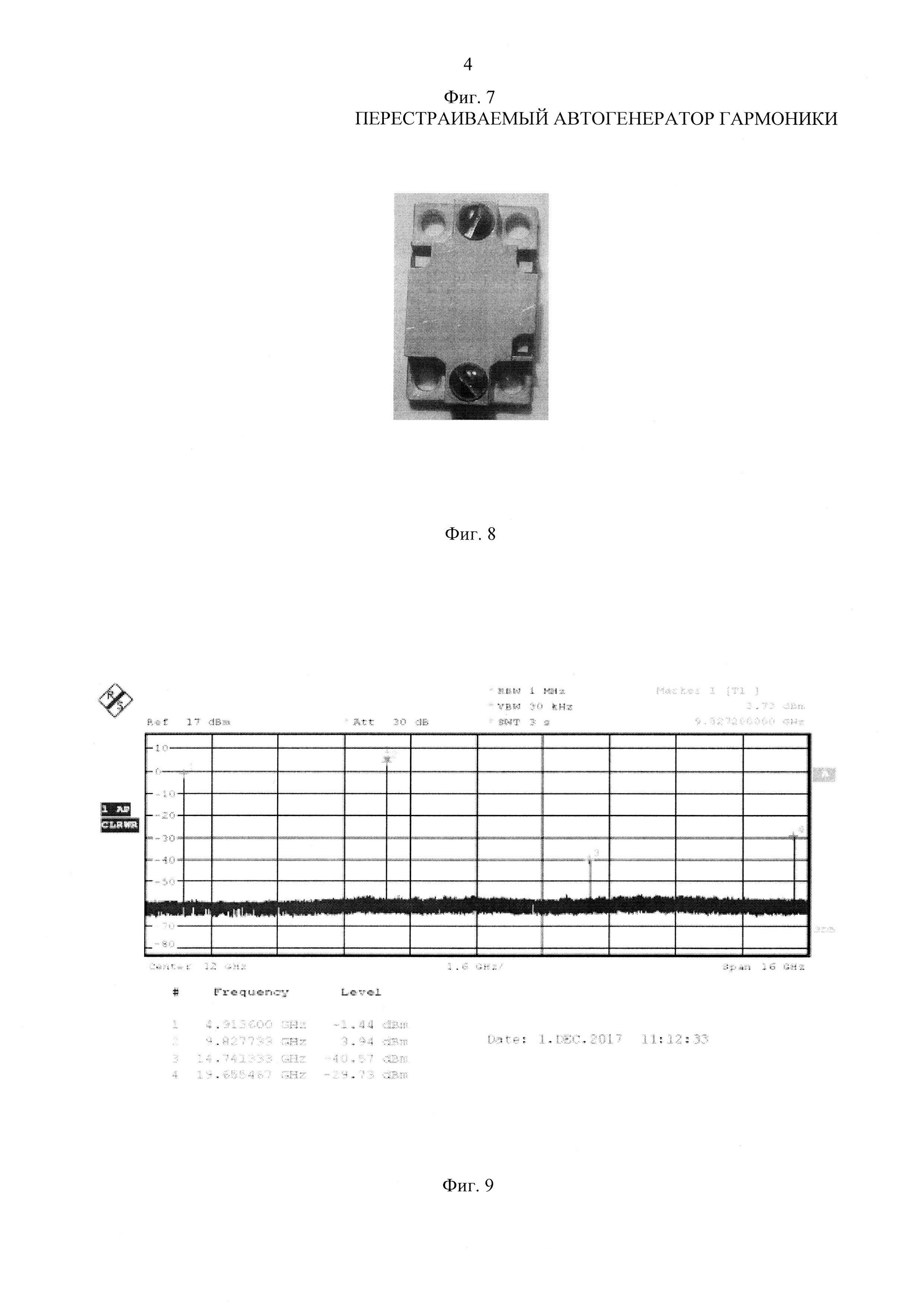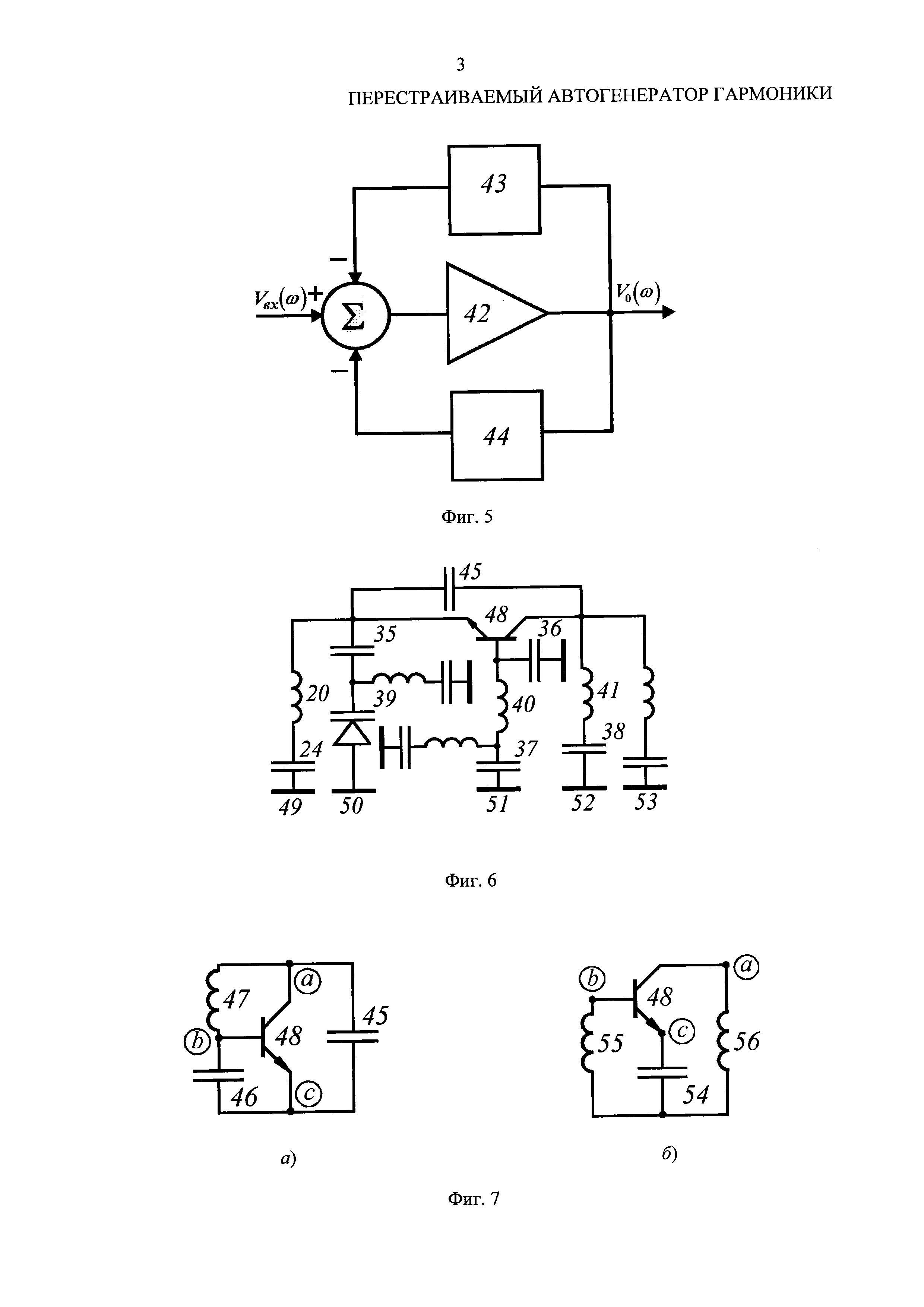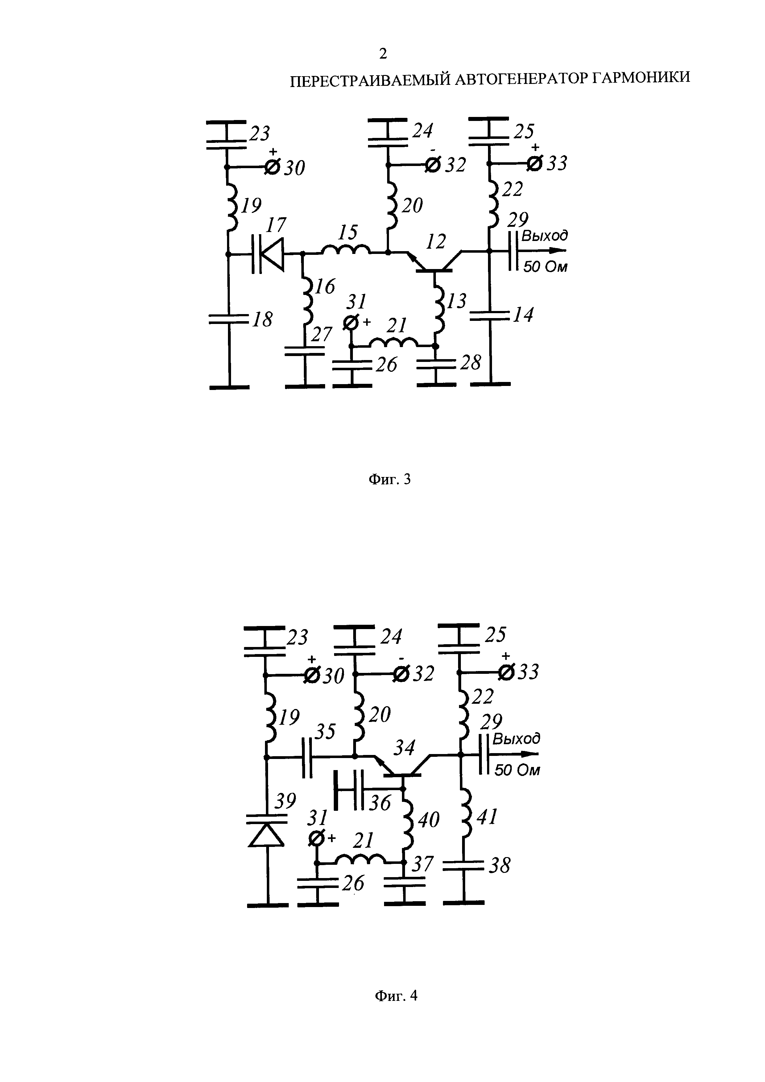 Перестраиваемый автогенератор гармоники, содержащий транзистор 34, включенный по схеме с общей базой, последовательно соединенные между собой индуктивности и конденсаторы под номерами 19 и 23, 20 и 24, 21 и 26, 22 и 25 соответственно, где вторые обкладки всех конденсаторов 23 - 26 подключены к общей шине, а общие точки каждой пары элементов соединены с клеммами 30 и 32, 31, 33 источников подачи напряжения управления варикапом 39 и напряжений питания на электроды транзистора 34, причем катод варикапа 39 подключен к свободному выводу индуктивности 19, а также к конденсатору 35, индуктивность 41, присоединенные одной обкладкой к общей шине конденсаторы 36 и 38, последовательно соединенные конденсатор 37 и индуктивность 40, общая точка которых подключена к свободному выводу индуктивности 21, а сами они включены между общей шиной и базой транзистора 34, эмиттер и коллектор которого соединены соответственно со свободными выводами индуктивностей 20 и 22, вывод последней из них дополнительно подключен через конденсатор 29 к выходу устройства, отличающийся тем, что вторая обкладка конденсатора 35 подключена к эмиттеру транзистора 34, а анод варикапа 39 - к общей шине, вторая обкладка конденсатора 36 подключена к базе транзистора 34, а вторая обкладка конденсатора 38 - к индуктивности 41, другой вывод которой соединен с коллектором транзистора 34, и величины основных элементов автогенератора гармоник удовлетворяют следующему соотношению: где ƒ0 - основная частота генерации устройства, k=2, 3, … - номер выделяемой гармоники, CАЭ - емкость перехода коллектор-эмиттер выбранного транзистора 34, CОС - эквивалентная емкость работающих на основной частоте последовательно соединенных эмиттерного и базового контуров: эмиттерный контур образован индуктивностью 20 и емкостями варикапа 39 и конденсатора 35, базовый контур - индуктивностью 40 и конденсаторами 36 и 37, LКК - эквивалентная индуктивность последовательно соединенных базового и коллекторного контуров, последний образован индуктивностью 41 и конденсатором 38 и работает на основной частоте, CЭ - эквивалентная емкость эмиттерного контура, связанного при работе на k-й гармонике основного колебания с коллекторным контуром при помощи конденсатора САЭ, LБ -эквивалентная индуктивность базового контура, работающего на k-й гармонике основного колебания, LК - эквивалентная индуктивность коллекторного контура, связанного при помощи конденсатора САЭ с эмиттерным контуром в процессе работы на k-й гармонике основного колебания.