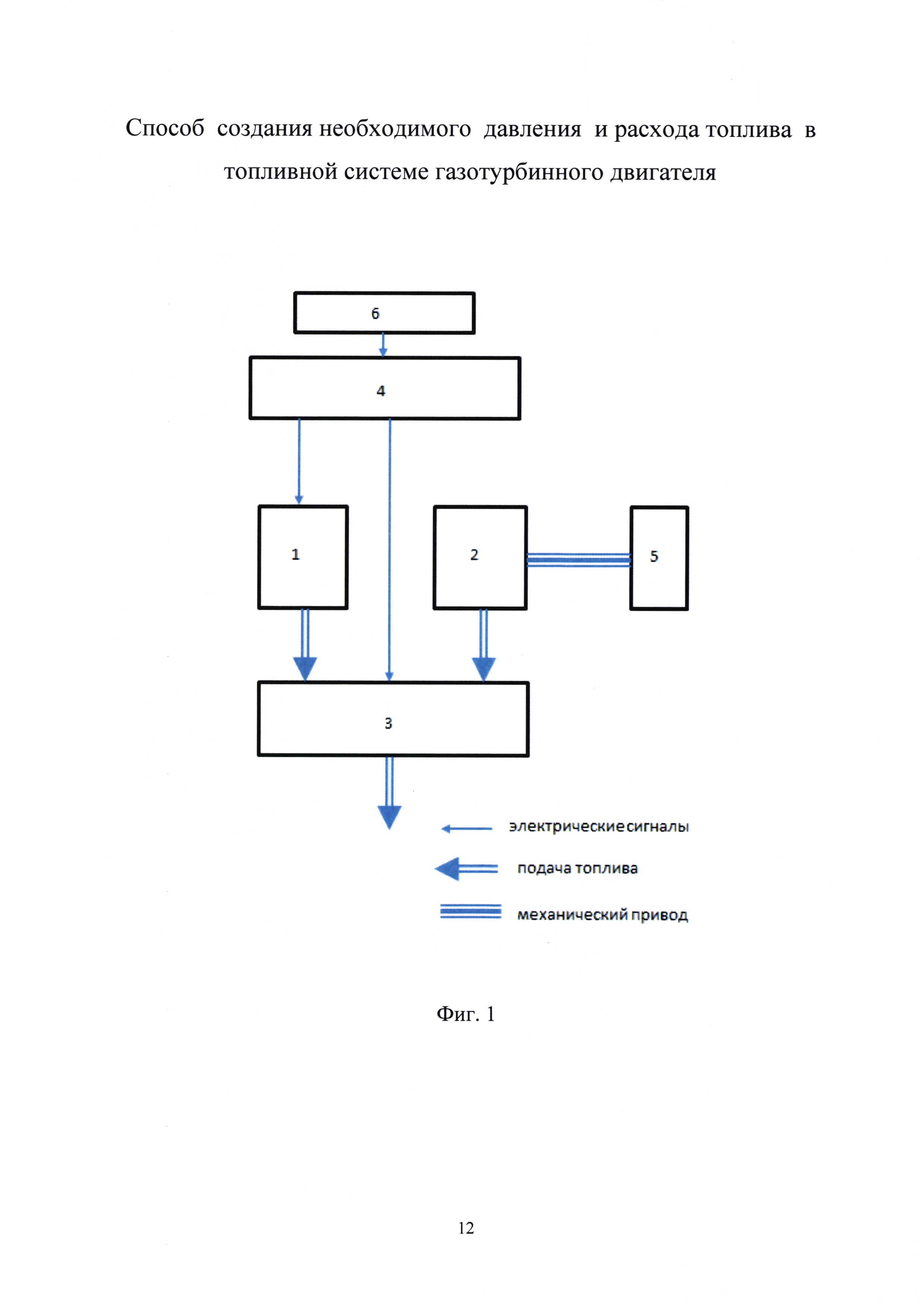 Изобретение относится к способу создания необходимого давления и расхода топлива в топливной системе авиационного газотурбинного двигателя. Способ создания давления и расхода топлива в топливной системе газотурбинного двигателя, содержащей топливный насос с электрическим приводом, топливный насос с механическим приводом от коробки приводов, дозатор/распределитель топлива, контроллер, датчики, заключающийся в том, что обеспечивают работу топливной системы и газотурбинного двигателя подачей топлива от насоса с электрическим приводом до 40% от максимальной частоты вращения ротора газотурбинного двигателя, постепенно снижают частоту вращения топливного насоса с электрическим приводом, и/или открывают перепуск топлива с выхода насоса с электрическим приводом на вход в топливную систему, при частотах вращения ротора газотурбинного двигателя более 40% обеспечивают необходимый расход топлива подачей от топливного насоса с механическим приводом и от топливного насоса с электрическим приводом, на этапах работы топливного насоса с электрическим приводом в топливной системе, кроме необходимого расхода топлива в камеру сгорания, дополнительно обеспечивают необходимые давление и расход топлива для работы гидроприводных агрегатов и агрегатов распределения топлива, после завершения запуска газотурбинного двигателя и достижения газотурбинным двигателем режима малого газа насос с электрическим приводом переводят в дежурный автономный режим с пониженным напором или выключают, режим земного малого газа и все режимы двигателя с частотами вращения ротора газотурбинного двигателя и приводного вала топливного насоса с механическим приводом более чем на режиме земного малого газа обеспечивают работой топливного насоса с механическим приводом для подачи необходимого расхода топлива в камеру сгорания газотурбинного двигателя и создания необходимого расхода и давления топлива для работы гидроприводных агрегатов, дополнительно, на режимах работы газотурбинного двигателя при частотах вращения ротора газотурбинного двигателя выше 40% и возникновении условий с недостаточным давлением топлива на входе или выходе топливного насоса с механическим приводом, а также при температуре топлива на входе в насос с механическим приводом ниже +10°С включают и/или увеличивают частоту вращения ротора для топливного насоса с электрическим приводом и поддерживают давления или температуру топлива на необходимом уровне. Таким образом, предлагаемое изобретение позволяет исключить ограничения по расходу и давлению топлива при низкой частоте вращения газотурбинного двигателя, снизить величины подогрева топлива от топливного насоса с нерегулируемой производительностью (механический привод) на основных режимах газотурбинного двигателя с низким расходом топлива, повысить отказоустойчивость газотурбинного двигателя по функциональному отказу «самопроизвольное выключение», обеспечить условия для достижения длительных ресурсов топливных насосов, получить оптимальные массогабаритные параметры топливных насосов. 1 ил.