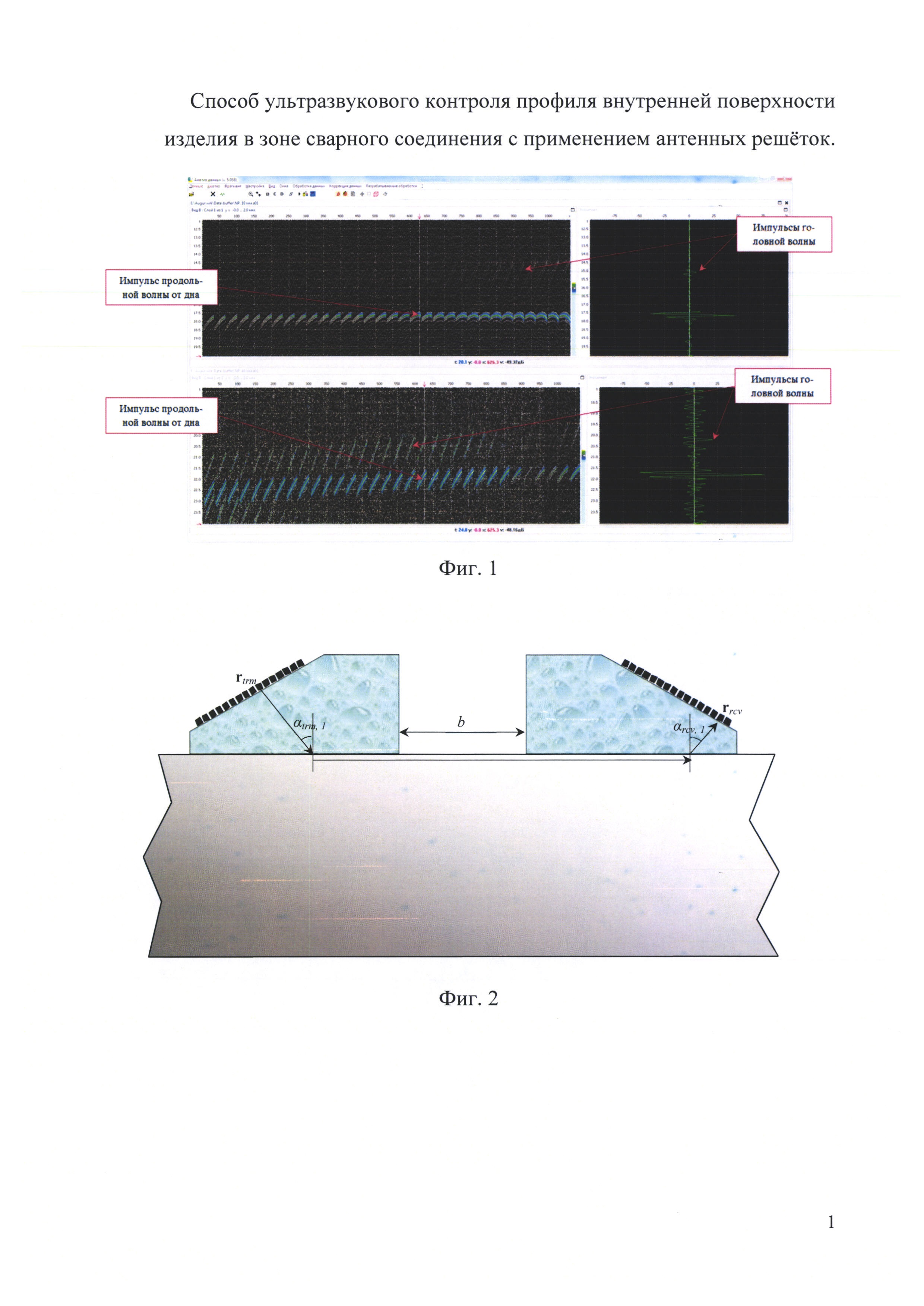 Изобретение относится к области ультразвукового неразрушающего контроля. Известен способ ультразвукового контроля профиля внутренней поверхности изделия с неровными поверхностями [Пат. RU №2560754. Базулин Евгений Геннадьевич, Вопилкин Алексей Харитонович, Пронин Виталий Владимирович, Тихонов Дмитрий Сергеевич. Способ ультразвукового контроля профиля внутренней поверхности изделия с неровными поверхностями. Опубл. 20.08.2015]. Недостатком способа является отсутствие учета изменения расстояния между призмами при проведении контроля, что приводит к ошибке определения толщины контролируемого изделия. Наиболее близким, принятым за прототип, является способ ультразвукового контроля профиля внутренней поверхности изделия с неровными поверхностями [Пат. RU №2560754. Базулин Евгений Геннадьевич, Вопилкин Алексей Харитонович, Пронин Виталий Владимирович, Тихонов Дмитрий Сергеевич. Способ ультразвукового контроля профиля внутренней поверхности изделия с неровными поверхностями. Опубл. 20.08.2015]. Известный способ не позволяет уточнять расстояние между призмами при проведении контроля, что приводит к ошибке определения толщины контролируемого изделия. Предложен способ ультразвукового контроля профиля внутренней поверхности изделия в зоне сварного соединения с применением антенных решеток, заключающийся в том, что две антенные решетки, одна из которых излучатель, а вторая - приемник, устанавливают на наклонные призмы, обращенные передними гранями друг к другу, размещают на поверхности контролируемого изделия на оптимальном расстоянии между собой с двух сторон от сварного соединения, излучают ультразвуковые импульсы в контролируемое изделие независимо и попеременно каждым из выбранных активных элементов излучающей решетки, регистрируют отраженные от донной поверхности ультразвуковые эхо-импульсы заданными активными элементами регистрирующей решетки, восстанавливают множество парциальных изображений путем умножения матрицы принятых эхо-импульсов и матрицы сигналов, рассчитанных для каждой точки изображения для точечного отражателя с учетом трансформации типов волн при отражениях, получают изображение профиля донной поверхности, по которому находят таблицу значений толщины контролируемого изделия в каждой точке области восстановления, отличающейся тем, что с целью повышения точности определения профиля внутренней поверхности изделия в процессе проведения контроля регистрируют импульсы головных волн, сравнивают измеренные импульсы с рассчитанными в зависимости от оптимального расстояния между призмами и номинального значения скорости продольной волны в контролируемом изделии, минимизируя разницу между измеренными и рассчитанными импульсами головных волн, описываемых целевой функцией, определяют фактическое расстояние между призмами и реальное значение скорости продольной волны в объекте контроля. Предлагаемый способ позволяет уточнять расстояние между призмами в процессе проведения контроля и корректировать номинальное значение скорости звука продольной волны в контролируемом изделии. Определяемые параметры позволяют повысить точность определения профиля внутренней поверхности. Для пояснения описываемого способа: На фигуре 1 приведены примеры зарегистрированных ультразвуковых эхо-импул