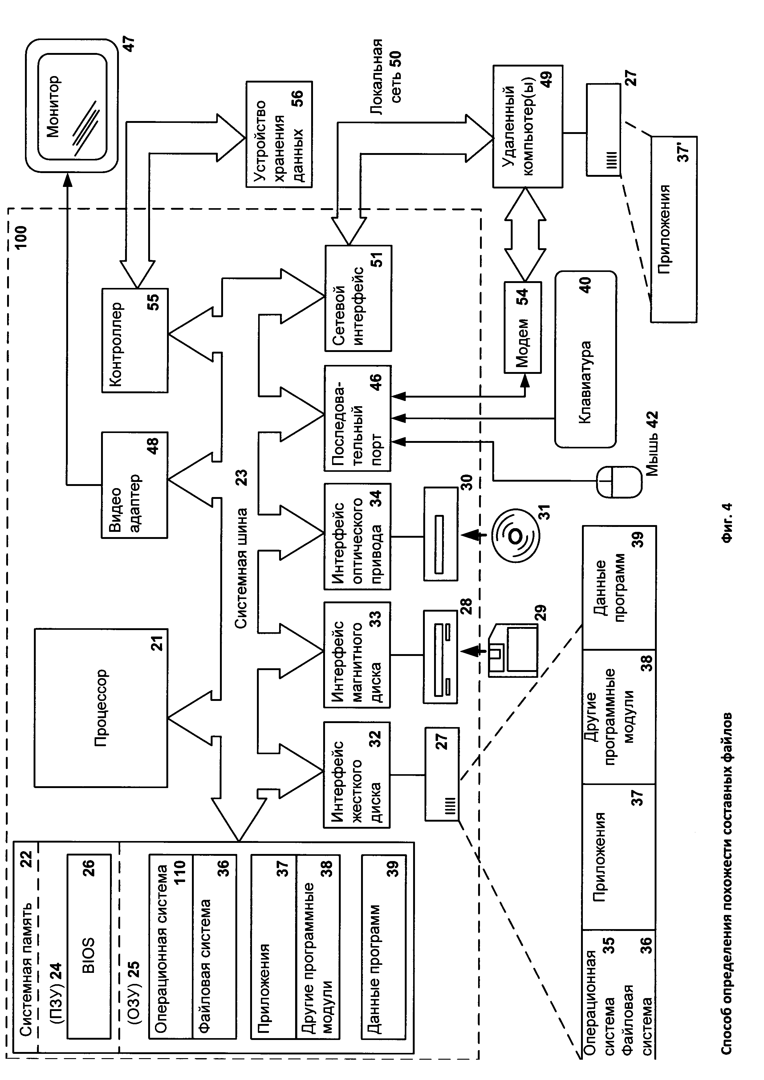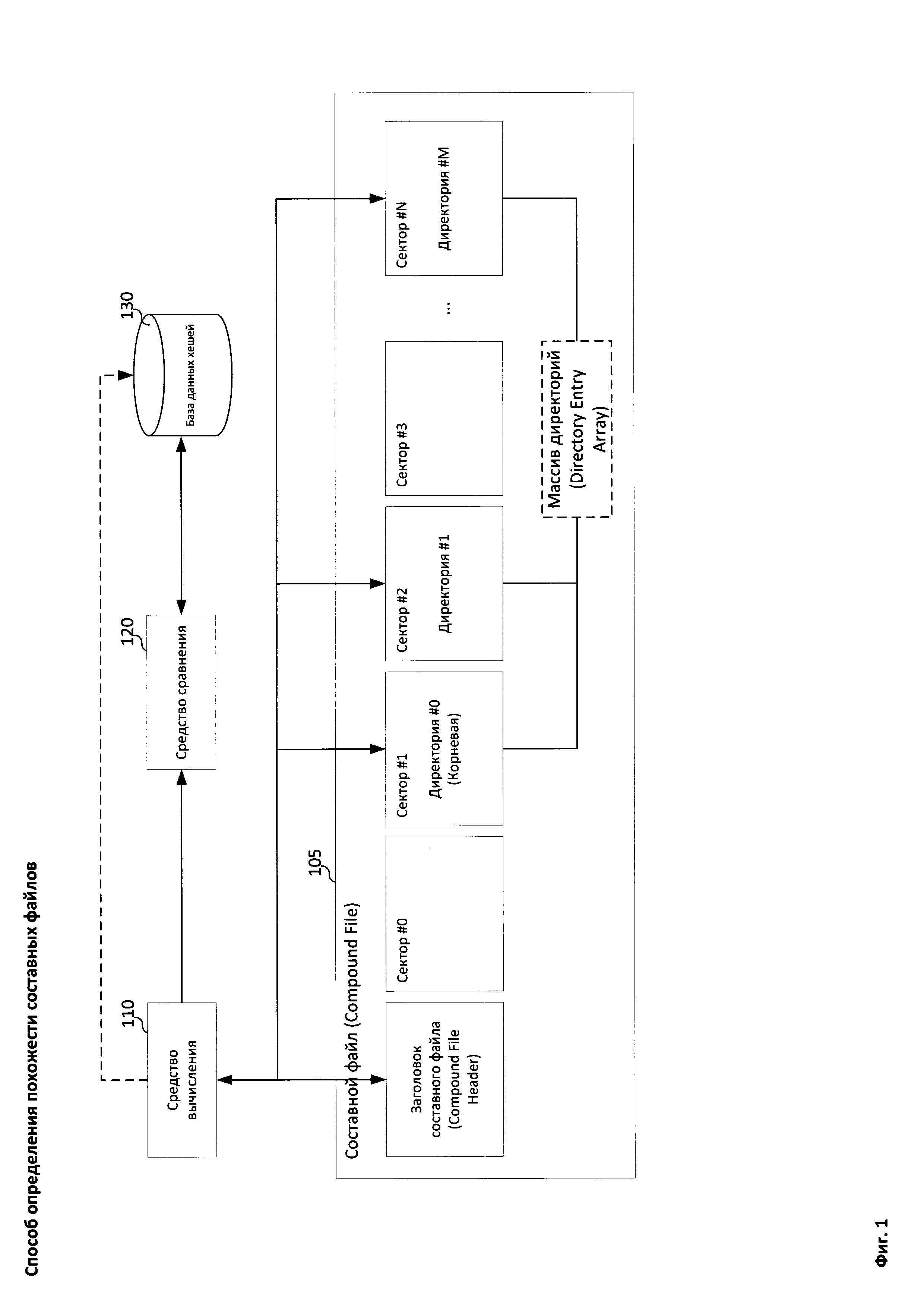1. Способ определения похожести составных файлов, в котором: a) определяют при помощи средства вычисления, является ли первый файл составным (compound file); b) выделяют при помощи средства вычисления первый набор признаков из заголовка первого составного файла, если на этапе ранее было определено, что первый файл является составным; c) выделяют при помощи средства вычисления второй набор признаков из по меньшей мере одной директории (directory entry) первого составного файла, если на этапе ранее было определено, что первый файл является составным; d) вычисляют при помощи средства вычисления хеш (hash) первого составного файла с использованием первого и второго набора признаков; e) выполняют шаги a-d для второго составного файла; f) признают при помощи средства сравнения первый и второй составные файлы похожими, если вычисленные хеши файлов совпадают. 2. Способ по п. 1, в котором составным файлом является файл формата Microsoft Compound File Binary File Format. 3. Способ по п. 2, в котором составным файлом является файл формата OLE или OLE2. 4. Способ по п. 1, в котором первый набор признаков включает в себя поля структуры заголовка составного файла. 5. Способ по п. 1, в котором второй набор признаков включает в себя поля структуры директории составного файла. 6. Способ по п. 1, в котором вычисленный хеш составного файла используется для определения необходимости проверки составного файла антивирусным приложением. 7. Способ по п. 1, в котором средство контроля приложений предоставляет доступ к составному файлу, если в базе данных хешей хранится вычисленный хеш, который является хешем доверенного составного файла.
