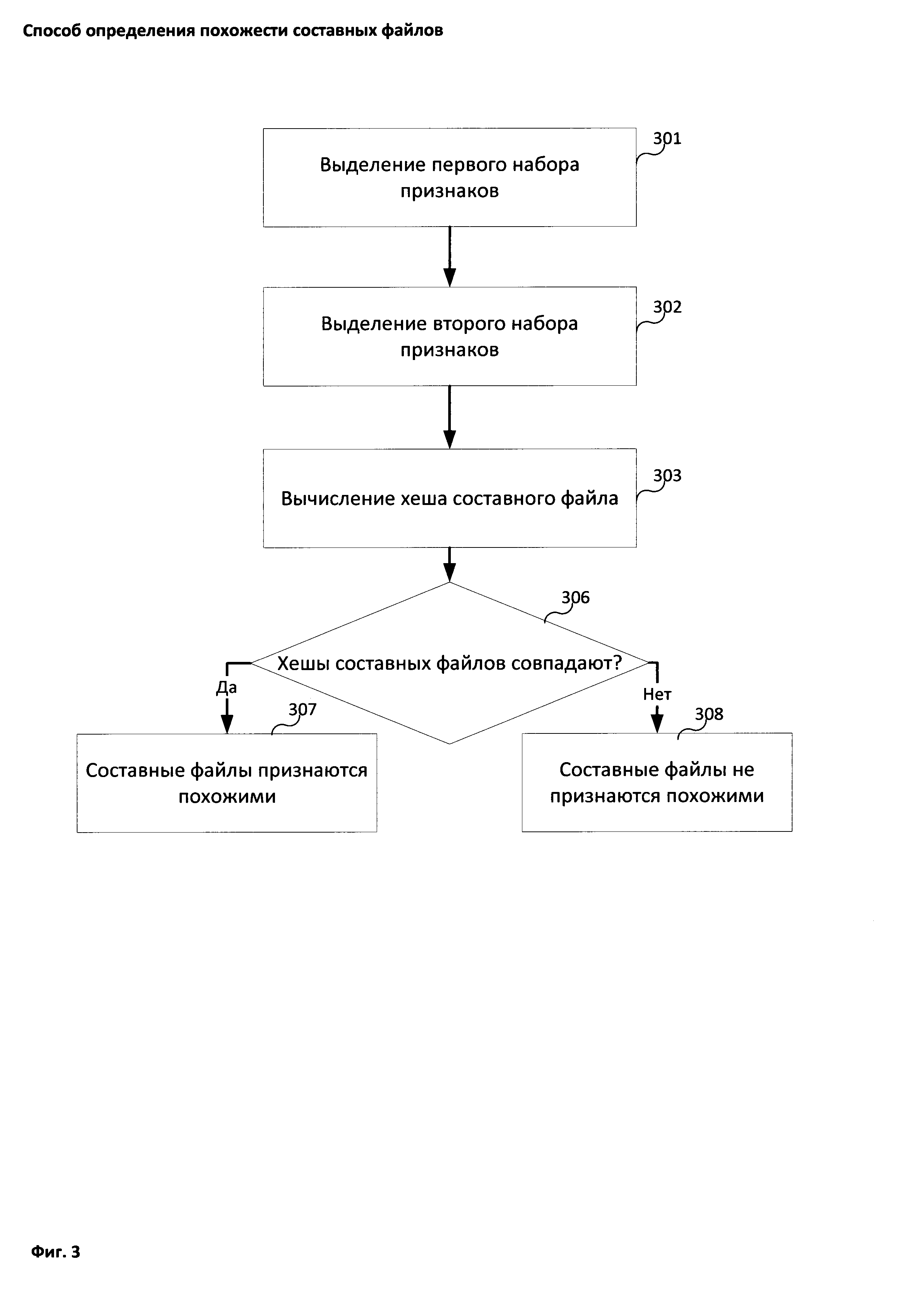 Область техники Изобретение относится к области обработки данных, а именно к способам определения похожести составных файлов. Уровень техники С каждым днем количество вредоносных приложений, распространяемых в сети Интернет, становится все больше и больше. Для защиты вычислительных устройств от вредоносных приложений часто используются антивирусные решения, которые, используя один или несколько методов обнаружения (детектирования), например сигнатурный или эвристический анализ, обнаруживают вредоносные приложения, которые, например, загружены из сети Интернет. Но у методов детектирования также есть ограничения и недостатки: эвристический анализ применим не ко всем типам файлов, а сигнатурный анализ может быть не эффективен при обнаружении полиморфных вредоносных приложений - приложений, выполняющих одни и те же команды, но отличающиеся содержимым соответствующих файлов приложений. Часто такие полиморфные вредоносные приложения (а именно файлы таких приложений) создаются автоматизированным путем (например, генерируются автоматически): создатель вредоносного приложения, как правило, использует специальные среды разработки, которые могут из одного исходного кода вредоносного приложения скомпилировать огромное количество вредоносных файлов, которые будут иметь разное тело файла (содержимое файла), но запущенные из таких файлов приложения будут вести себя одинаково. При этом повышение качества детектирования таких файлов антивирусными решениями часто упирается в определение похожести таких файлов (сходства файлов в соответствии с одной из мер похожести). Стоит отметить, что подобные полиморфные вредоносные файлы могут быть не только файлами формата РЕ (Portable Executable), но и любыми другими файлами, формат которых позволяет внедрить в файл вредоносный код, который будет исполнен тем или иным образом, например файлы формата Portable Document Format, Microsoft Compound File Binary (OLE2 файлы) или одного из форматов Office Open XML (DOCX, PPTX и т.п.). Так, в патенте US 9396334 описан подход к обнаружению вредоносных файлов, которые могут быть тем или иным образом запущены на стековой виртуальной машине (а именно: файлы содержат код, который может быть интерпретирован). Технология позволяет эффективно обнаруживать, например, вредоносные файлы (группы похожих вредоносных файлов), содержащие Action Script сценарии (или скрипты, англ. script). Однако в приведенной публикации не описаны подходы эффективного обнаружения составных файлов (Compound File), например файлов формата DOC. Хотя рассмотренные подходы направлены на решение определенных задач в области обработки данных, они не решают задачу определения похожести составных файлов или решают недостаточно эффективно. Настоящее изобретение позволяет более эффективно решить задачу определения похожих составных файлов. Раскрытие изобретения Настоящее изобретение предназначено для определения похожести составных файлов. Технический результат настоящего изобретения заключается в обнаружении похожих составных файлов, который достигается путем признания составных файлов похожими, если вычисленные хеши составных фалов совпадают. Технический результат достигается при помощи способа определения похожести составных файлов, в котором: определяют при помощи средства вычисления, является ли первый файл составным (compound file); в
