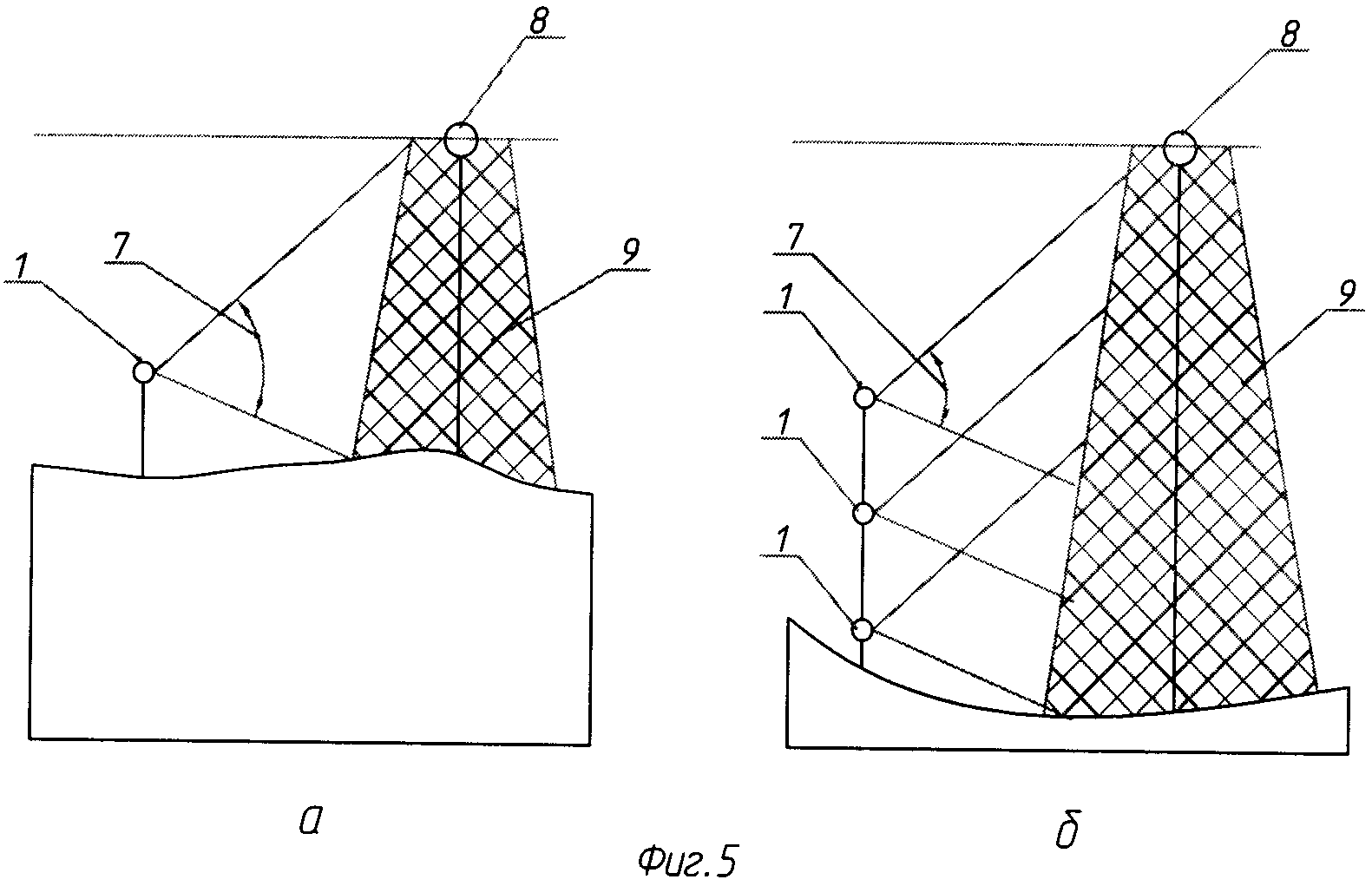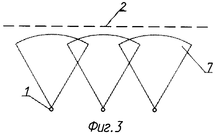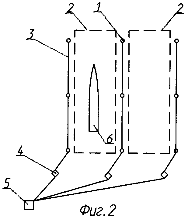 Изобретение относится к оптическим средствам для наблюдения за подводным пространством и обнаружения объектов в нем. Изобретение может применяться в промышленности, например, для своевременного предупреждения попадания в зону водозабора насосной станции посторонних предметов, а также в природоохранных целях, например, для поиска утечек веществ из кораблей, стоящих на рейде, в терминалах наливных портов, у пирсов. Промышленностью ряда стран освоен выпуск разнообразных технических средств для проведения наблюдения в подводной среде. В частности, для наблюдения подводного пространства применяют погружные видеокамеры фирмы Sony. Однако при данном способе наблюдения сложно организовать контроль подводного пространства с автоматической селекцией ложных объектов (рыб и других биологических видов, проплывающих перед объективом видеокамеры) вследствие: - невозможности точного определения расстояния до объекта при неизвестных его размерах; - невозможности точного определения размеров объекта при неизвестном расстоянии до него. В качестве прототипа заявляемого изобретения выбран способ обнаружения объектов под водой с улучшенной видимостью, описанный в патенте США №6348942 от 09.11.98, опубл. 19.02.2002, МПК H04N 07/18. Сущность известного способа заключается в регистрации стереоскопического изображения контролируемого участка подводного пространства непосредственно в водной среде. Стереоскопическое изображение регистрируют стереокамерой в водозащищенном исполнении, образованной двумя идентичными однонаправленными видеокамерами, установленными на одной линии на некотором небольшом расстоянии относительно друг друга. Стереоскопическое изображение позволяет правильно оценить размеры и расстояние до интересующего объекта. Одну стереокамеру устанавливают на носовой части смотрового судна, вторую - на кормовой. Осуществляют также подсветку окружающей водной среды с помощью лазеров, излучающих зелено-голубой свет и размещенных в тех же водозащитных корпусах, что и видеокамеры. Основной недостаток прототипа заключается в невозможности обеспечения одномоментного наблюдения и обнаружения объектов во всем контролируемом подводном пространстве, поскольку поле обзора каждый момент времени ограничено, а смотровое судно перемещается в заданном направлении с лимитированной скоростью. Ограниченная область одномоментного обзора может значительно уменьшить вероятность обнаружения интересующего объекта. Задача заключается в создании способа эффективного контроля протяженных и площадных подводных зон с сохранением преимуществ, обеспечиваемых стереоскопической съемкой. Поставленная задача решается следующим образом. В способе обнаружения объектов под водой, согласно которому регистрируют непосредственно в водной среде стереоскопические изображения контролируемого подводного пространства, при этом осуществляют подсветку контролируемого пространства и анализируют полученные последовательные изображения, согласно изобретению одномоментно регистрируют стереоскопические изображения из нескольких пространственно распределенных точек, расстояния между которыми и направления наблюдения выбирают из условия обеспечения максимально возможной сплошности обзора контролируемого пространства, осуществляют анали