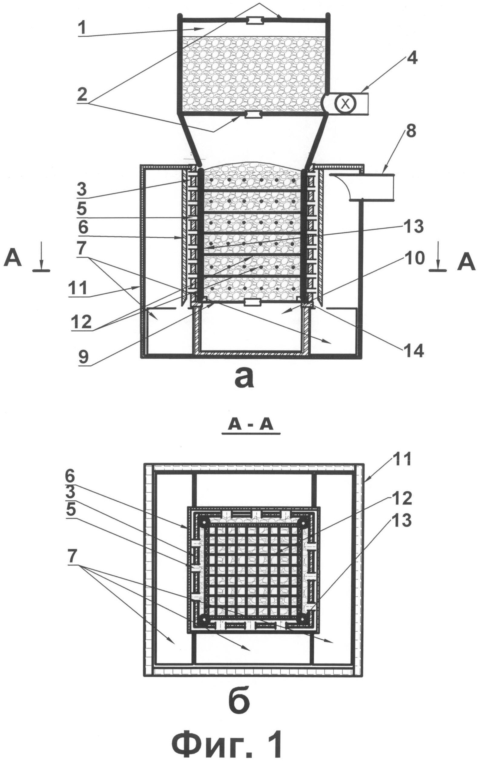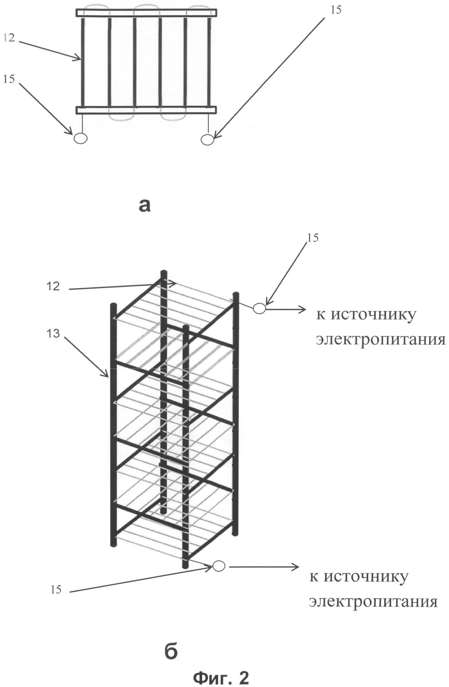Изобретение относится к области получения ферромагнитных углеродных сорбентов, предназначенных для очистки вод. Целлюлозосодержащее сырье пропитывают водным раствором соли железа, отделяют избыток влаги и полученную смесь подвергают пиролизу. Пиролиз проводят в пиролизной камере при 400-500°C, осуществляя серии последовательных тепловых импульсов длительностью 0,1-1,0 секунды с интервалом между импульсами 10 секунд. Нагрев смеси осуществляют с помощью нихромовых стержней, которые соединены с электрогенератором и размещены в объеме пиролизной камеры с разделением камеры на локально нагреваемые ячейки. Изобретение обеспечивает снижение энергозатрат, времени проведения процесса и его удешевление. 3 з.п. ф-лы, 2 ил., 2 пр.