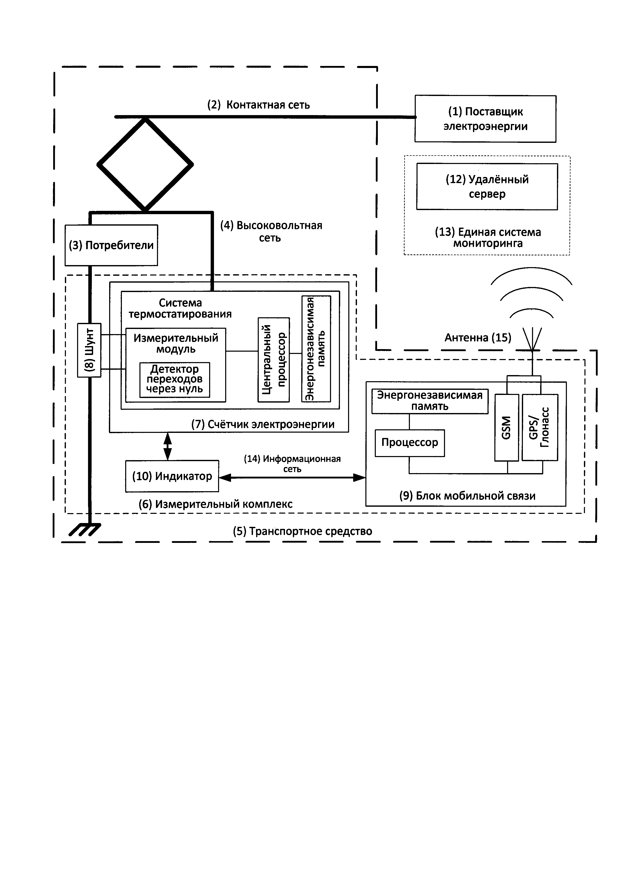 1. Устройство для автоматического учета электроэнергии, потребленной и рекуперированной транспортным средством, и параметров работы электрической и информационной сетей, содержащее двунаправленный счетчик электроэнергии, который по каналу напряжения непосредственно подключается к линии высокого напряжения, а по каналу тока с помощью измерительного токового шунта к электрической сети транспортного средства, включающий в себя измерительный модуль, снабженный детектором переходов через нуль, встроенную энергонезависимую память, управляющий вход которой подключен к процессору счетчика электроэнергии, обменивающемуся цифровыми данными с измерительным модулем, блок мобильной связи со встроенной энергонезависимой памятью, подключенной к процессору блока мобильной связи, связанному с процессором счетчика электроэнергии и информационной сети транспортного средства. 2. Устройство по п. 1, отличающееся тем, что блок мобильной связи имеет совмещенную GSM и GPS/ГЛОНАСС антенну. 3. Устройство по п. 1, отличающееся тем, что счетчик электроэнергии содержит систему термостатирования. 4. Устройство по п. 1, отличающееся тем, что счетчик электроэнергии размещен в едином, электрически изолированном, пыле- и влагозащищенном корпусе из негорючего пластика. 5. Устройство по п. 1, отличающееся тем, что блок мобильной связи и счетчик электроэнергии связаны между собой по интерфейсу CAN.