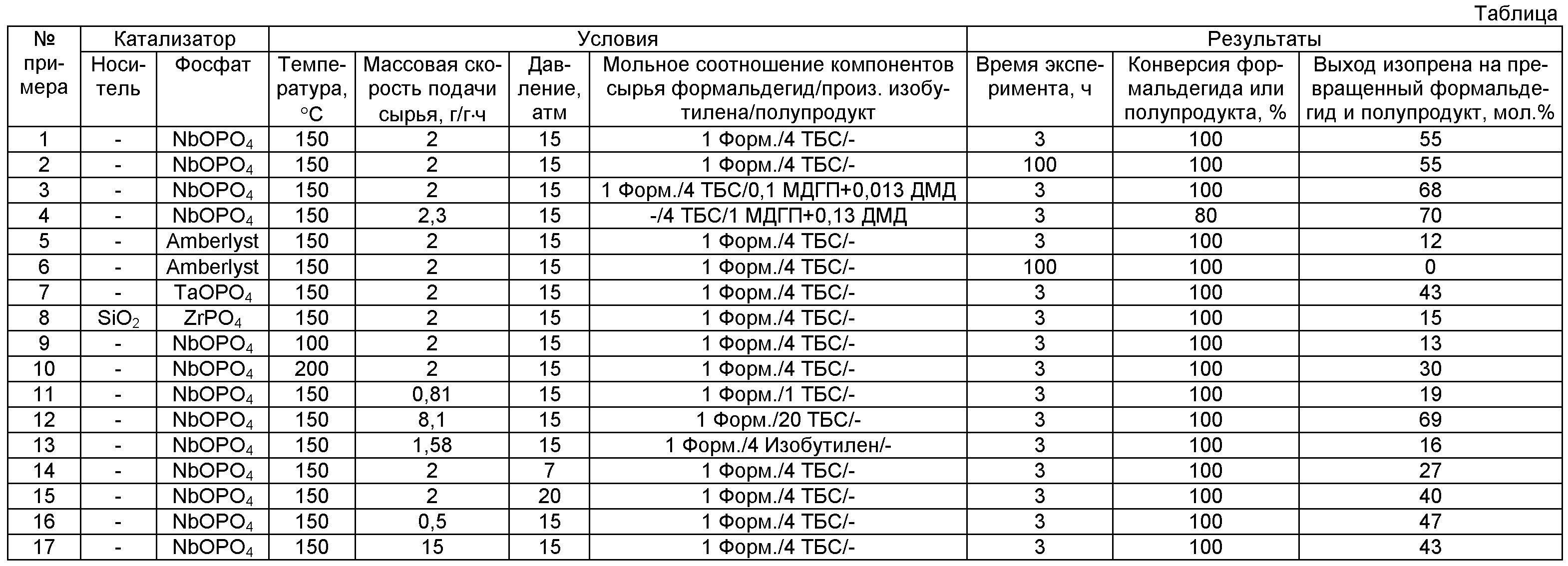 1. Способ жидкофазного получения изопрена путем взаимодействия формальдегида с изобутиленом или его производными в присутствии твердофазного катализатора и последующего выделения целевого продукта, отличающийся тем, что в качестве катализатора используют фосфаты, выбранные из фосфатов циркония, ниобия или тантала, при этом взаимодействие осуществляют при 100-200°С, давлении 7-20 атм и мольном отношении изобутилена или производного изобутилена к формальдегиду, равном (1-20)/1. 2. Способ по п.1, отличающийся тем, что в качестве производного изобутилена используют третбутиловый спирт, метилтретбутиловый эфир, этилтретбутиловый эфир или их смеси. 3. Способ по п.1, отличающийся тем, что после взаимодействия формальдегида с изобутиленом или его производными образовавшиеся побочные продукты отделяют от целевого продукта и рециркулируют в голову процесса. 4. Способ по п.1, отличающийся тем, что после взаимодействия формальдегида с изобутиленом или его производными осуществляют отделение образовавшихся побочных продуктов и их разложение на твердофазном катализаторе, содержащем фосфаты циркония, ниобия или тантала. 5. Способ по любому из пп.3 или 4, отличающийся тем, что побочные продукты взаимодействия формальдегида с изобутиленом или его производными представляют собой 4,4-диметилдиоксан-1,3, метилдигидропираны или смесь упомянутых веществ с изобутиленом или его производными. 6. Способ по п.1, отличающийся тем, что фосфаты циркония, ниобия или тантала используют нанесенными на неорганический носитель. 7. Способ по п.1, отличающийся тем, что процесс проводят в условиях непрерывного потока в реакторе с неподвижным слоем катализатора.