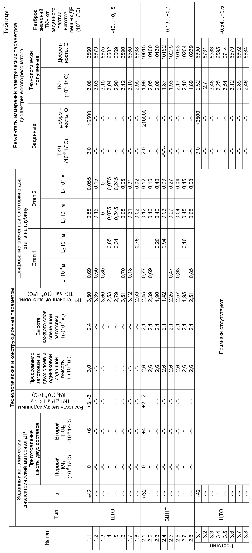 Изобретение относится к электронной технике СВЧ, а именно диэлектрическим резонаторам СВЧ, предназначенным прежде всего для изделий электронной техники СВЧ, в том числе интегральных схем СВЧ. Современные керамические диэлектрические материалы, характеризующиеся малыми потерями тангенса угла диэлектрических потерь (tg δ), менее 10-3 и высокой стабильностью относительной диэлектрической проницаемости Температурный коэффициент частоты (ТКЧ) наряду с добротностью (Q) и рабочей резонансной частотой (fp) - одни из основных характеристик диэлектрического резонатора СВЧ (диэлектрический резонатор), которые обусловлены как конструкционными, так и технологическими параметрами и прежде всего диэлектрическим материалом. Известен ряд способов изготовления диэлектрических резонаторов СВЧ, каждый из которых заключается в изготовлении диэлектрического резонатора - составного из диэлектрических материалов с различными по знаку (относительно нулевого значения) температурными зависимостями диэлектрической проницаемости Данный способ изготовления диэлектрического резонатора - составного обеспечивает получение заданного набора значений величины температурного коэффициента частоты. Однако данный способ отличается: во-первых, повышенной трудоемкостью изготовления из-за необходимости проведения значительного объема математических вычислений для определения точных размеров отдельных частей диэлектрического резонатора и во-вторых, невысокой надежностью, обусловленной как изготовлением диэлектрического резонатора из отдельных частей, так и необходимостью их последующего соединения, в-третьих, потерями добротности из-за наличия иных материалов для соединения отдельных частей диэлектрического резонатора. Известен способ изготовления диэлектрического резонатора СВЧ-конструкционно монолитного из одного диэлектрического материала, посредством керамической технологии, включающий приготовление шихты заданного керамического диэлектрического материала, формирование из шихты заготовки диэлектрического резонатора посредством прессования, спекания и последующего шлифования до заданных размеров диэлектрического резонатора [2, стр. 133-148] - прототип. Этот способ изготовления диэлектрического резонатора - конструкционно монолитного - позволяет исключить вышеуказанные недостатки способа изготовления диэлектрического резонатора - составного, и тем самым обеспечить: снижение трудоемкости изготовления и исключение потерь добротности. Однако этот способ изготовления диэлектрического резонатора отличается: во-первых, недостаточно высокой точностью получения значения величины температурного коэффициента частоты каждого диэлектрического резонатора в изготавливаемой партии относительно заданного номинального значения величины температурного коэффициента частоты диэлектрического резонатора (далее - его величина заданного номинального значения) (отклонение составляет не менее ±0,5×10-6 1/°C), во-вторых, значительным разбросом значений величины температурного коэффициента частоты в изготавливаемой партии. Следует особо отметить актуальность получения диэлектрических резонаторов со значениями величины температурного коэффициента частоты с повышенной точностью относительно его величины заданного номинального 