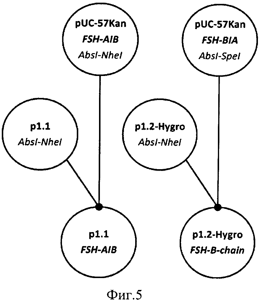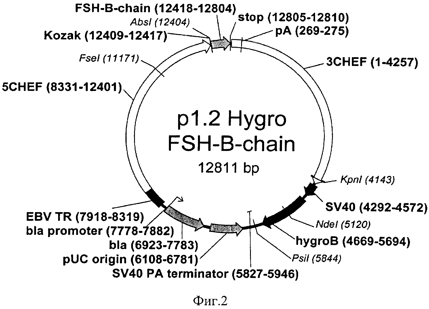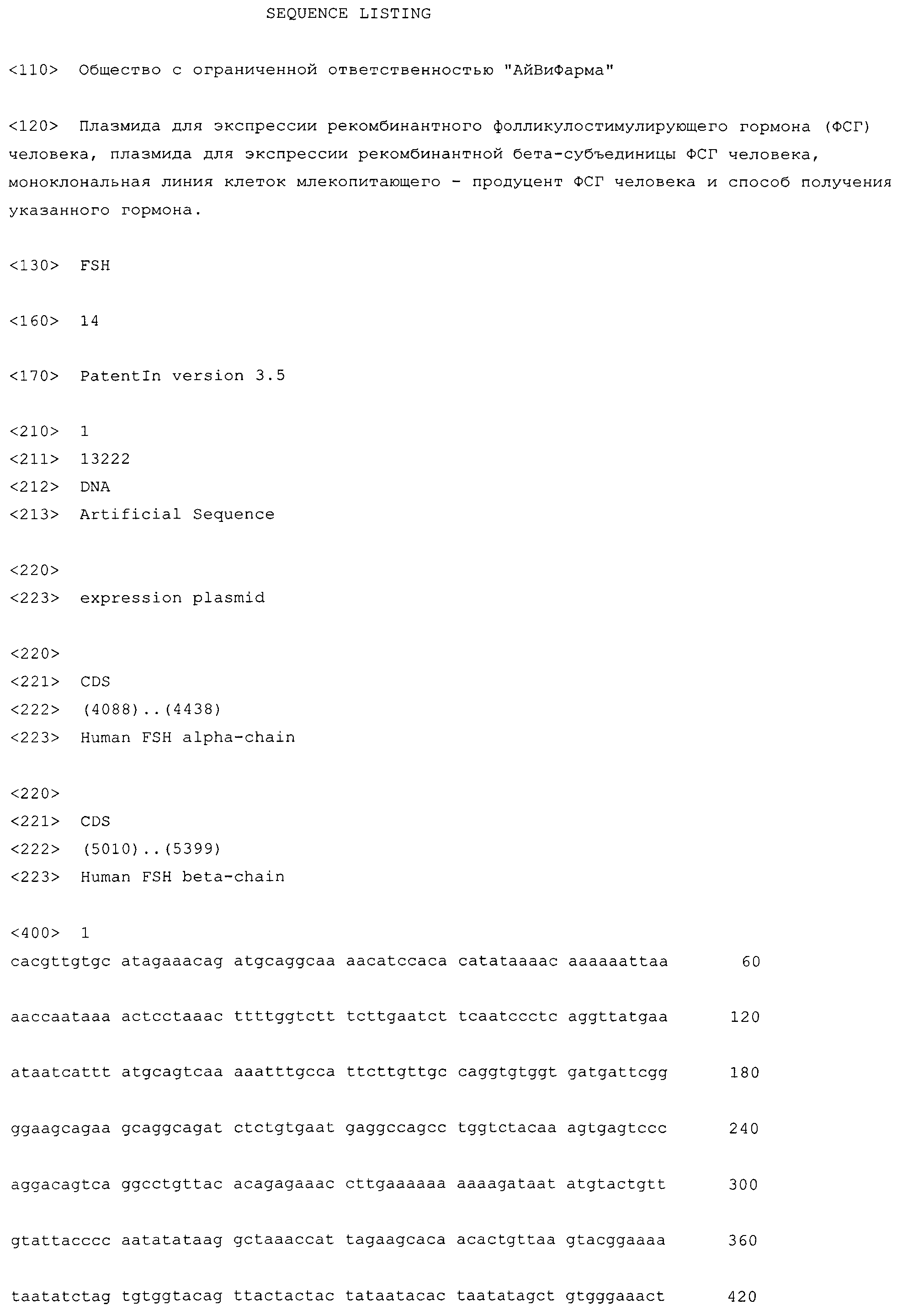 Область техники Изобретение относится к биотехнологии, конкретно к способу получения рекомбинантного фолликулостимулирующего гормона человека, который может быть использован в медицине, методом рекомбинантных ДНК. Предшествующий уровень техники Фолликулостимулирующий гормон (ФСГ) является незаменимым для нормального роста и созревания фолликулов и для образования половых стероидов у человека. У женщин уровень ФСГ является критичным для начала и протекания развития фолликулов и, следовательно, для установления определенного ритма созревания и количества достигающих зрелости фолликулов, у мужчин - для индукции и поддержания сперматогенеза. Вследствие этого рекомбинантные и нативные варианты фолликулостимулирующего гормона могут применяться для стимуляции развития фолликулов и образования стероидов во многих случаях нарушения половой функции. Существенная часть производимых лекарственных средств ФСГ используется при применении вспомогательных репродуктивных технологий, проводимых под медицинским контролем, таких как экстракорпоральное оплодотворение и перенос эмбрионов (ЭКО/ПЭ), перенос гамет в маточную трубу (ГИФТ) и интрацитоплазматическая инъекция сперматозоида (ИКСИ) (van Wely M. et al. (2011), "Recombinant versus urinary gonadotrophin for ovarian stimulation in assisted reproductive technology cycles". Cochrane Database of Syst. Rev., 2: CD005354). В клинической практике препараты, содержащие ФСГ, обычно используют при ановуляторном бесплодии у женщин, а также при применении вспомогательных репродуктивных технологий у пациенток с: (1) первым классом ановуляторного бесплодия (гипоталамо-гипофизарная недостаточность), для которого характерны очень низкие содержания эндогенных ФСГ, лютеинизирующего гормона (ЛГ) и эстрадиола; (2) второго класса ановуляторного бесплодия (гипоталамо-гипофизарная дисфункция), для которого характерны низкий или нормальный уровень эндогенного ФСГ, высокое или нормальное содержание эндогенного ЛГ, высокий или нормальный уровень тестостерона, а также при наличии мужского фактора бесплодия (Dhont M. (2005), "WHO-classification of anovulation: background, evidence, problems. International congress series. 1279:3-9). На сегодняшний день существует два класса фармацевтических препаратов, содержащих ФСГ: полученные из мочи женщин в постменопаузе и полученные с использованием рекомбинантных ДНК. Препараты ФСГ мочевого происхождения появились на рынке много лет назад (1958 г.) и на сегодняшний день представлены: высокоочищенными мочевыми гонадотропинами с биохимической чистотой ФСГ до 77-95% и содержащими около 2% активности ЛГ; мочевыми гонадотропинами с биохимической чистотой ФСГ до 70%, а также содержащими ЛГ, хорионический гонадотропин (ХГ) и существенные количества посторонних белков, не относящихся к гонадотропинам. Применение технологии рекомбинантной ДНК позволило получить фармацевтические препараты ФСГ, содержащие рекомбинантный ФСГ человека с чистотой более 99% и не содержащих других гонадотропинов. Разработка новых методов и подходов, позволяющих получать большие количества рекомбинантного ФСГ в культивируемых клетках млекопитающих, представляет большой интерес для фармацевтической промышленности вследствие постоянного роста потребления лекарственных препаратов ФСГ и низкой продуктивности разработанных в конце 80-х годов прошлого века систем экспрессии ФСГ, использованных для производства