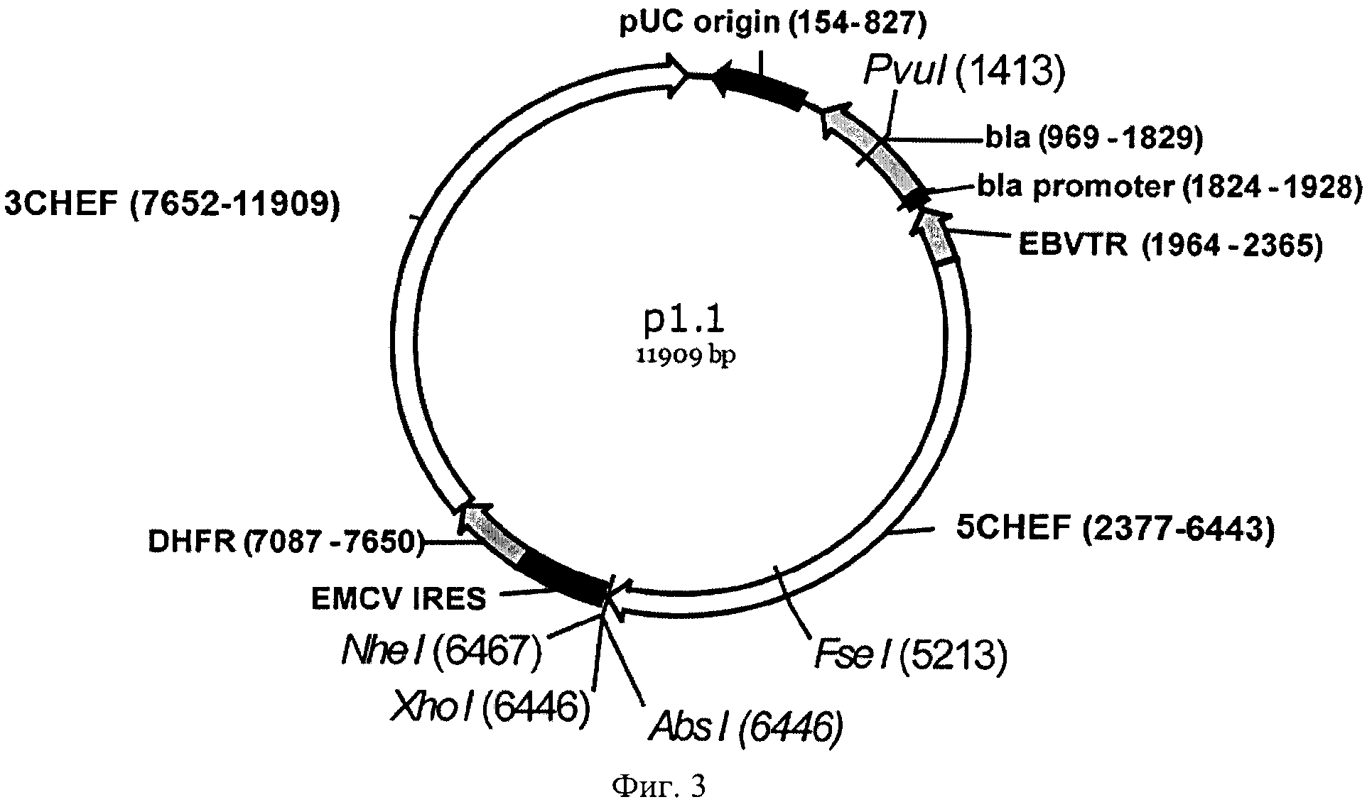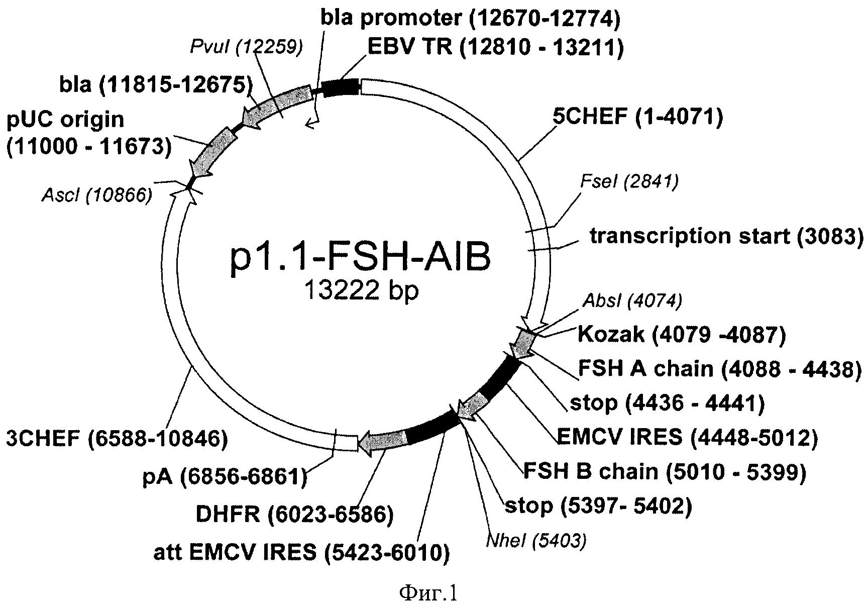 1. Плазмида для экспрессии в клетках яичника китайского хомячка (СНО) рекомбинантного фолликулостимулирующего гормона (ФСГ) человека, в следующей последовательности по существу состоящая из области начала репликации плазмиды pUC, открытой рамки считывания бета-лактамазы (bla) и прокариотического промотора гена bla; участка терминального повтора вируса Эпштейн-Барр человека (EBVTR), функционального промотора и первого интрона гена фактора элонгации 1 альфа китайского хомячка, фланкированного 5′ нетранслируемой областью этого гена; последовательности Козак; открытой рамки считывания, кодирующей альфа-субъединицу ФСГ человека с блоком стоп-кодонов; внутреннего сайта связывания рибосом (IRES) вируса энцефаломиокардита (EMCV); открытой рамки считывания, кодирующей бета-субъединицу ФСГ человека с блоком стоп-кодонов; аттенюированного внутреннего сайта связывания рибосом (IRES) вируса энцефаломиокардита (EMCV); открытой рамки считывания дигидрофолатредуктазы (DHFR), экспрессирующейся в составе трицистронной мРНК вместе с геном, кодирующим альфа- и бета-субъединицы ФСГ человека; и функционального терминатора гена фактора элонгации 1 альфа китайского хомячка, фланкированного 3′ нетранслируемой областью этого гена. 2. Плазмида по п. 1, отличающаяся тем, что открытые рамки считывания, кодирующие альфа- и бета-субъединицы ФСГ человека, кодируют альфа- и бета-субъединицы ФСГ человека, последовательности аминокислот которых приведены в SEQ ID NO: 2 и 3 соответственно. 3. Плазмида по п. 1, отличающаяся тем, что участок терминального повтора вируса Эпштейн-Барр человека (EBVTR) представляет собой фрагмент конкатемера терминального повтора EBVTR. 4. Плазмида по п. 1, отличающаяся тем, что используют открытую рамку считывания дигидрофолатредуктазы (DHFR) мыши. 5. Плазмида по п. 1, отличающаяся тем, что указанной плазмидой является плазмида p1.1-FSH-AIB, представленная в Перечне последовательностей под номером SEQ ID NO: 1. 6. Плазмида для экспрессии в клетках яичника китайского хомячка (СНО) бета-субъединицы рекомбинантного фолликулостимулирующего гормона (ФСГ) человека, в следующей последовательности по существу состоящая из области начала репликации плазмиды pUC; открытой рамки считывания бета-лактамазы (bla) и прокариотического промотора гена bla; участка терминального повтора вируса Эпштейн-Барр человека (EBVTR); функционального промотора гена фактора элонгации 1 альфа китайского хомячка, фланкированного 5′ нетранслируемой областью этого гена; последовательности Козак; открытой рамки считывания гена, кодирующего бета-субъединицу ФСГ человека с блоком стоп-кодонов; функционального терминатора гена фактора элонгации 1 альфа китайского хомячка, фланкированного 3′ нетранслируемой областью этого гена; промотора вируса SV40; гена устойчивости к гигромицину; и функционального терминатора вируса SV40. 7. Плазмида по п. 6, отличающаяся тем, что открытая рамка считывания гена, кодирующего бета-субъединицу ФСГ человека, кодирует бета-субъединицу ФСГ человека, последовательность аминокислот которой приведена в SEQ ID NO: 3. 8. Плазмида по п. 6, отличающаяся тем, что участок терминального повтора вируса Эпштейн-Барр человека (EBVTR) представляет собой фрагмент конкатемера терминального повтора EBVTR. 9. Плазмида по п. 6, отличающаяся тем, что указанной плазмидой является pl.2-Hygro FSH-B-chain, представленна