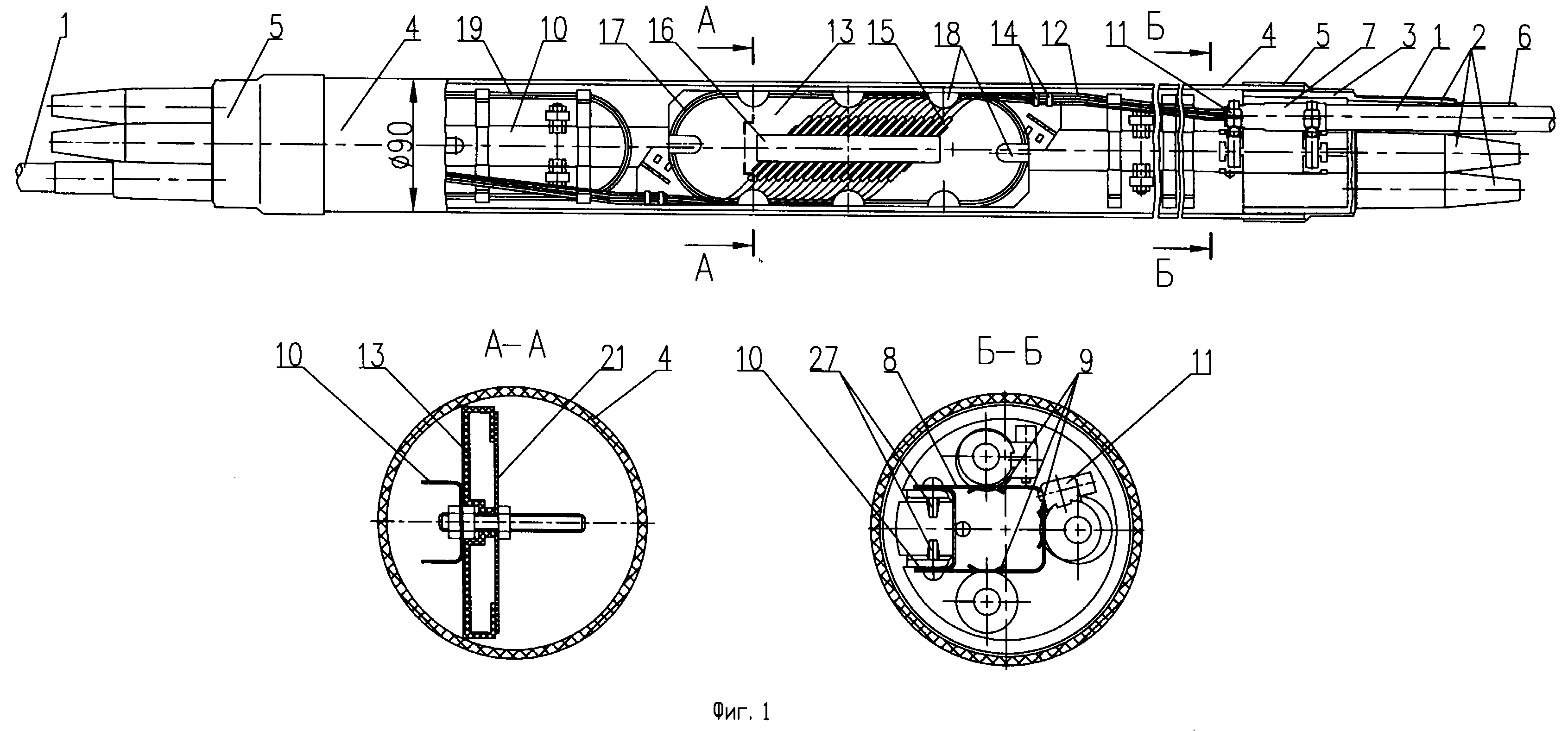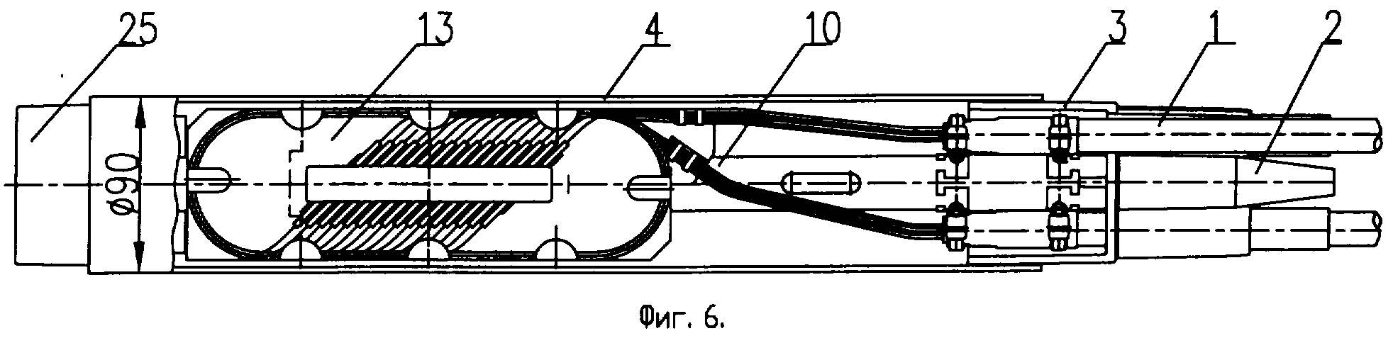 с другой стороны трубы на заглушку 25. Герметизация по цилиндрическим поверхностям трубы 4, оголовника 3 и заглушки 25, а также по цилиндрическим поверхностям вводных патрубков 2 и оболочкам ОК