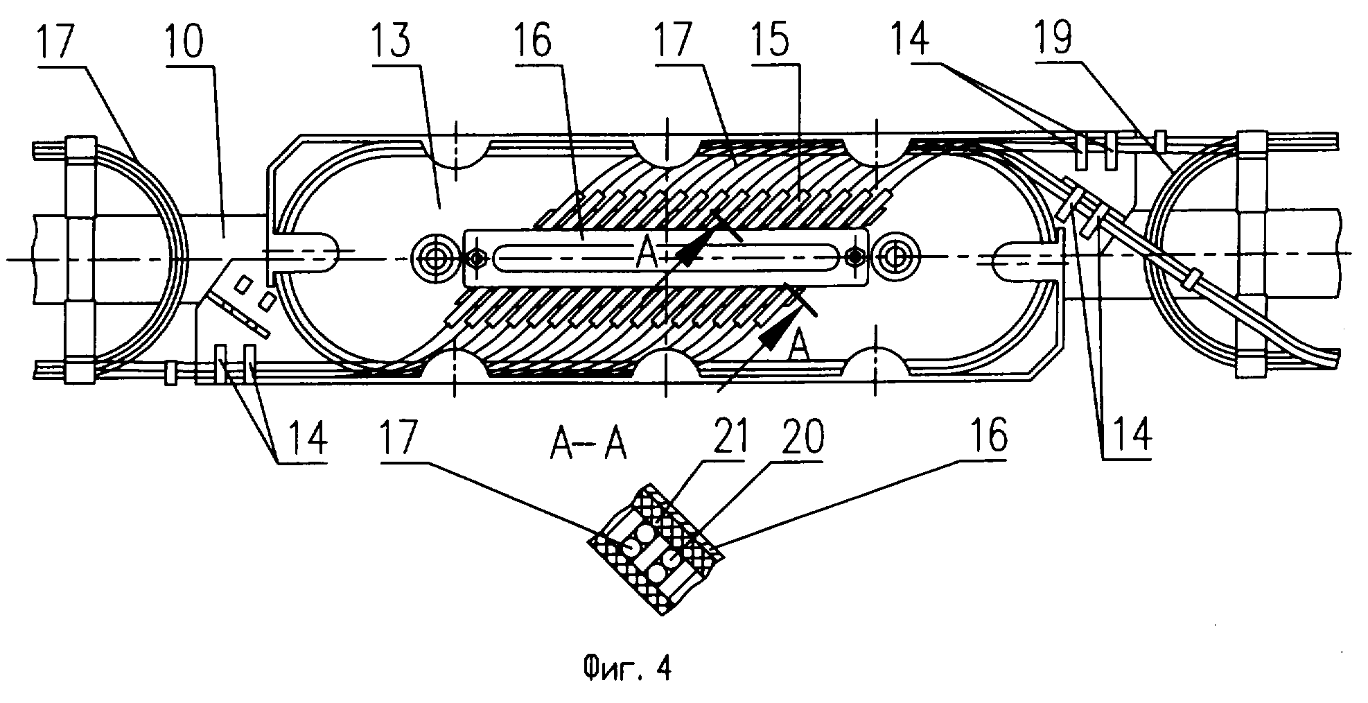 перед заведением на кассету имеют “бублик” технологического запаса модулей 19. Концы соединяемого ОВ 17, места сварок ОВ, защищенные гильзами КДЗС 15, резиновые уплотнители 20, вставленные в пазы